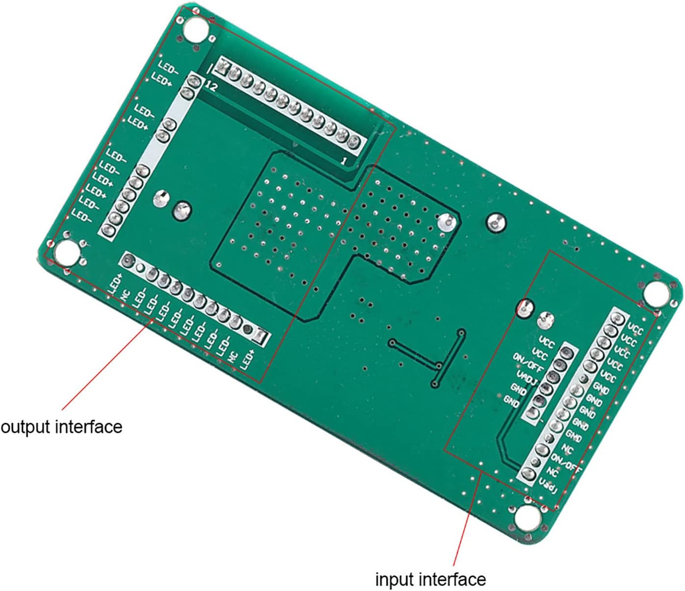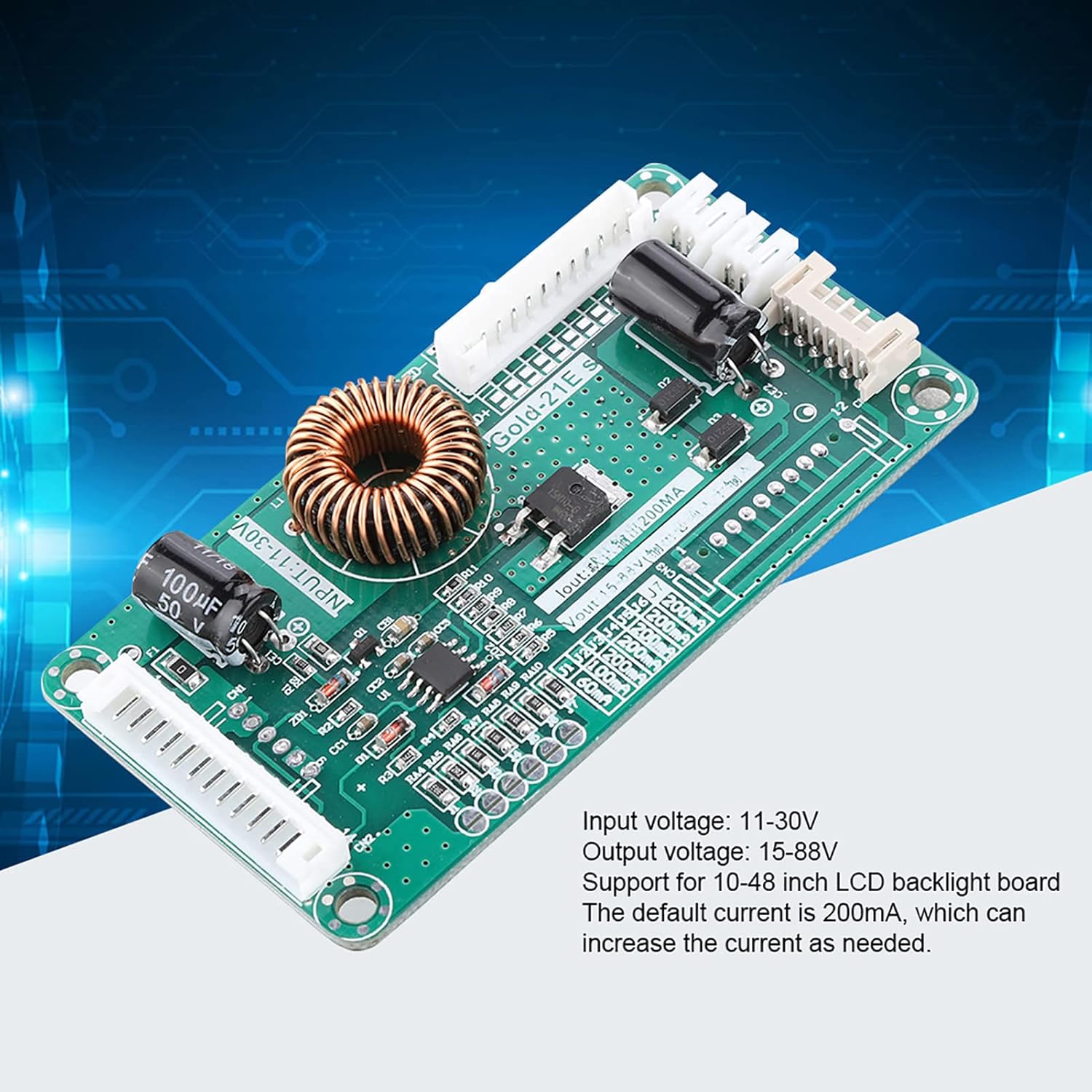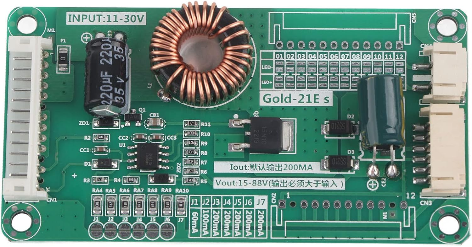 Tensione di ingresso: 11‑30 V; Tensione di uscita: 15‑88 V, corrente predefinita 200 mA. La tensione di uscita è 15‑88 V, non è necessario modificarla manualmente, la scheda si adatterà automaticamente al boost. La corrente 10MA‑1000MA può essere regolata secondo necessità. Adatto per TV LCD da 10‑48 pollici di tutte le marche e modelli. Collegare i resistori per saldare i punti marker per aumentare la corrente di conseguenza.