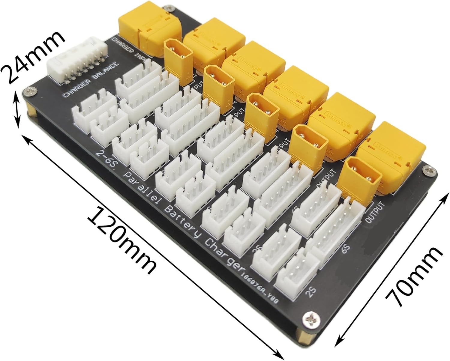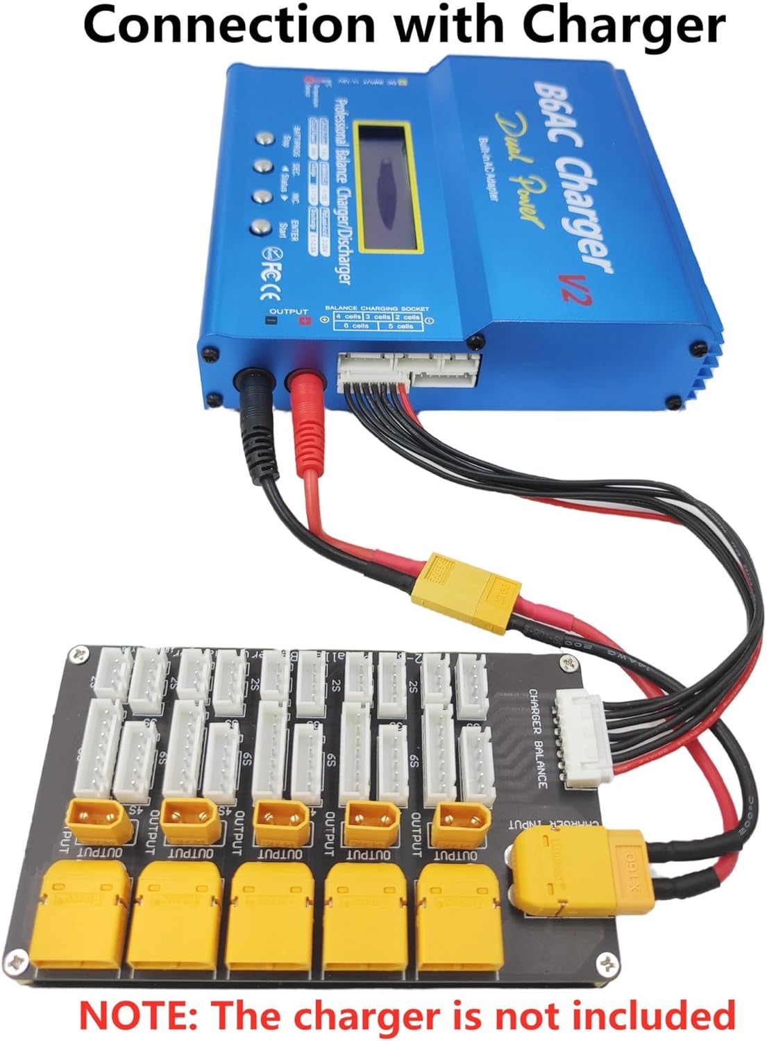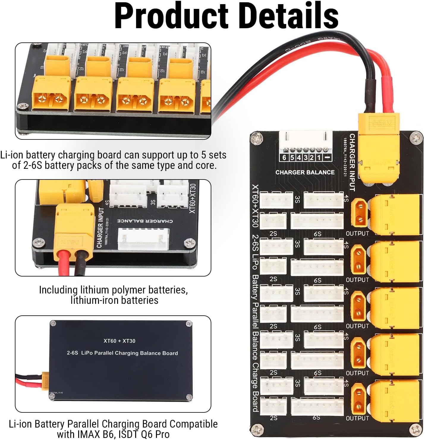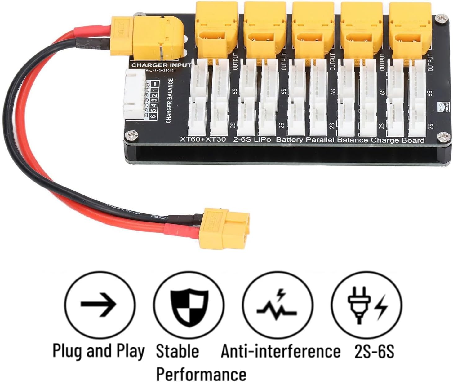 VELOCITÀ DI RICARICA: La scheda di ricarica per batterie al litio è realizzata con componenti elettronici di alta qualità, lavorazione di precisione e durata. Quando è in uso può passare in modo sicuro la corrente di carica, accelerare la velocità di carica della batteria e migliorare le prestazioni della batteria ACCESSORI AGGIORNATI: La scheda di ricarica parallela ha un'elevata resistenza, un'ampia gamma di temperature di esercizio e una buona resistenza agli agenti atmosferici. Piccola e leggera, adatta a più occasioni, è un ottimo accessorio di aggiornamento per sostituire le batterie rotte o vecchie SODDISFA I REQUISITI: Le schede di ricarica parallela per batterie al litio hanno caratteristiche di affidabilità e miniaturizzazione, buona manutenibilità e intercambiabilità. Le dimensioni ridotte e la struttura compatta garantiscono il rispetto dei requisiti delle apparecchiature originali RICARICA SIMULTANEA: La scheda di ricarica parallela XT30 XT60 supporta fino a 5 gruppi di pacchi batteria 2-6S dello stesso tipo e dello stesso nucleo (tranne 5S). Può caricare fino a 5 batterie al litio contemporaneamente, comprese quelle ai polimeri di litio, al ferro di litio e agli ioni di litio COMPATIBILE: Il caricatore parallelo è compatibile con i caricatori IMAX B6, ISDT Q6 Pro, D2, T8. Viene fornito con un cavo di ricarica a 2 porte, compatibile con quasi tutti i tipi di caricabatterie a bilanciamento di batterie al litio, cavo di bilanciamento da 22AWG, cavo di ricarica principale da 14AWG