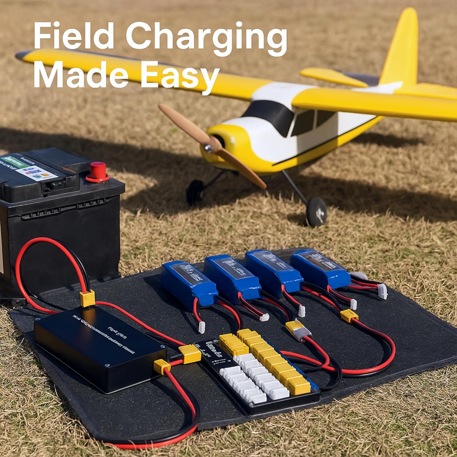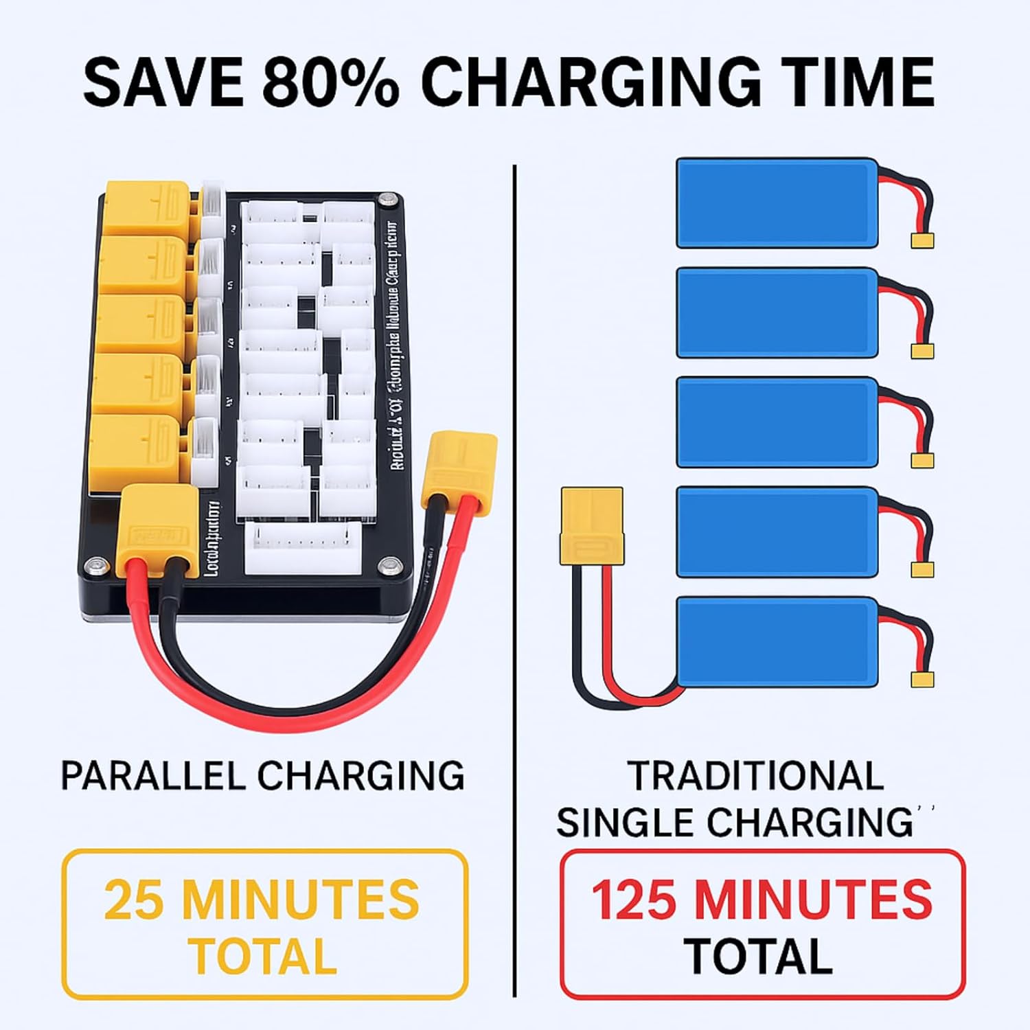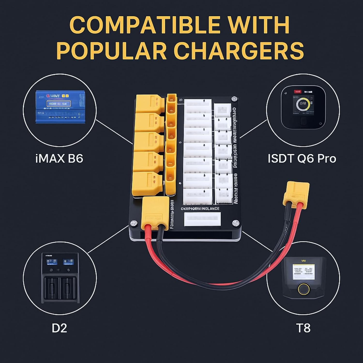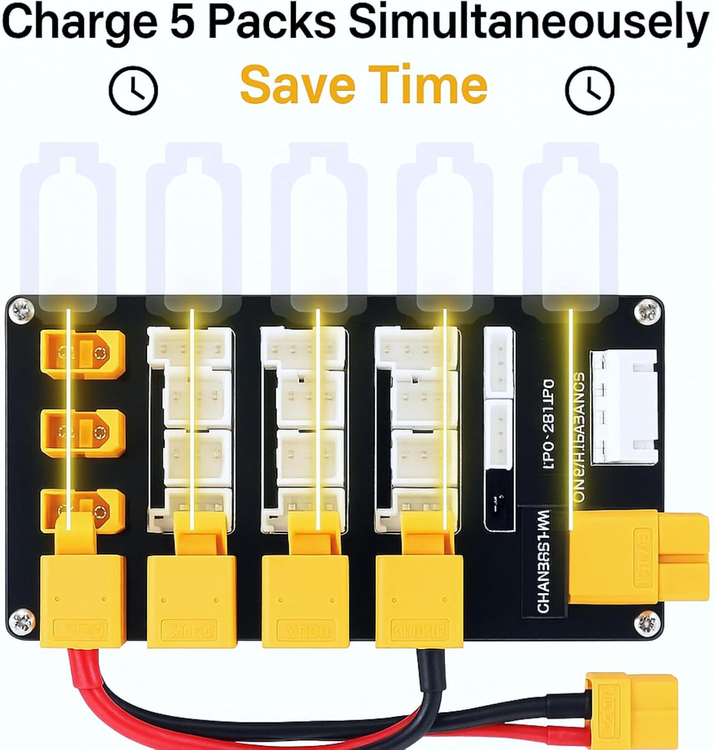 VELOCITÀ DI RICARICA: La scheda di ricarica per batterie al litio è realizzata con componenti elettronici di alta qualità, lavorazione di precisione e durata. Quando è in uso può passare in modo sicuro la corrente di carica, accelerare la velocità di carica della batteria e migliorare le prestazioni della batteria ACCESSORI AGGIORNATI: La scheda di ricarica parallela ha un'elevata resistenza, un'ampia gamma di temperature di esercizio e una buona resistenza agli agenti atmosferici. Piccola e leggera, adatta a più occasioni, è un ottimo accessorio di aggiornamento per sostituire le batterie rotte o vecchie SODDISFA I REQUISITI: Le schede di ricarica parallela per batterie al litio hanno caratteristiche di affidabilità e miniaturizzazione, buona manutenibilità e intercambiabilità. Le dimensioni ridotte e la struttura compatta garantiscono il rispetto dei requisiti delle apparecchiature originali RICARICA SIMULTANEA: La scheda di ricarica parallela XT30 XT60 supporta fino a 5 gruppi di pacchi batteria 2-6S dello stesso tipo e dello stesso nucleo (tranne 5S). Può caricare fino a 5 batterie al litio contemporaneamente, comprese quelle ai polimeri di litio, al ferro di litio e agli ioni di litio COMPATIBILE: Il caricatore parallelo è compatibile con i caricatori IMAX B6, ISDT Q6 Pro, D2, T8. Viene fornito con un cavo di ricarica a 2 porte, compatibile con quasi tutti i tipi di caricabatterie a bilanciamento di batterie al litio, cavo di bilanciamento da 22AWG, cavo di ricarica principale da 14AWG