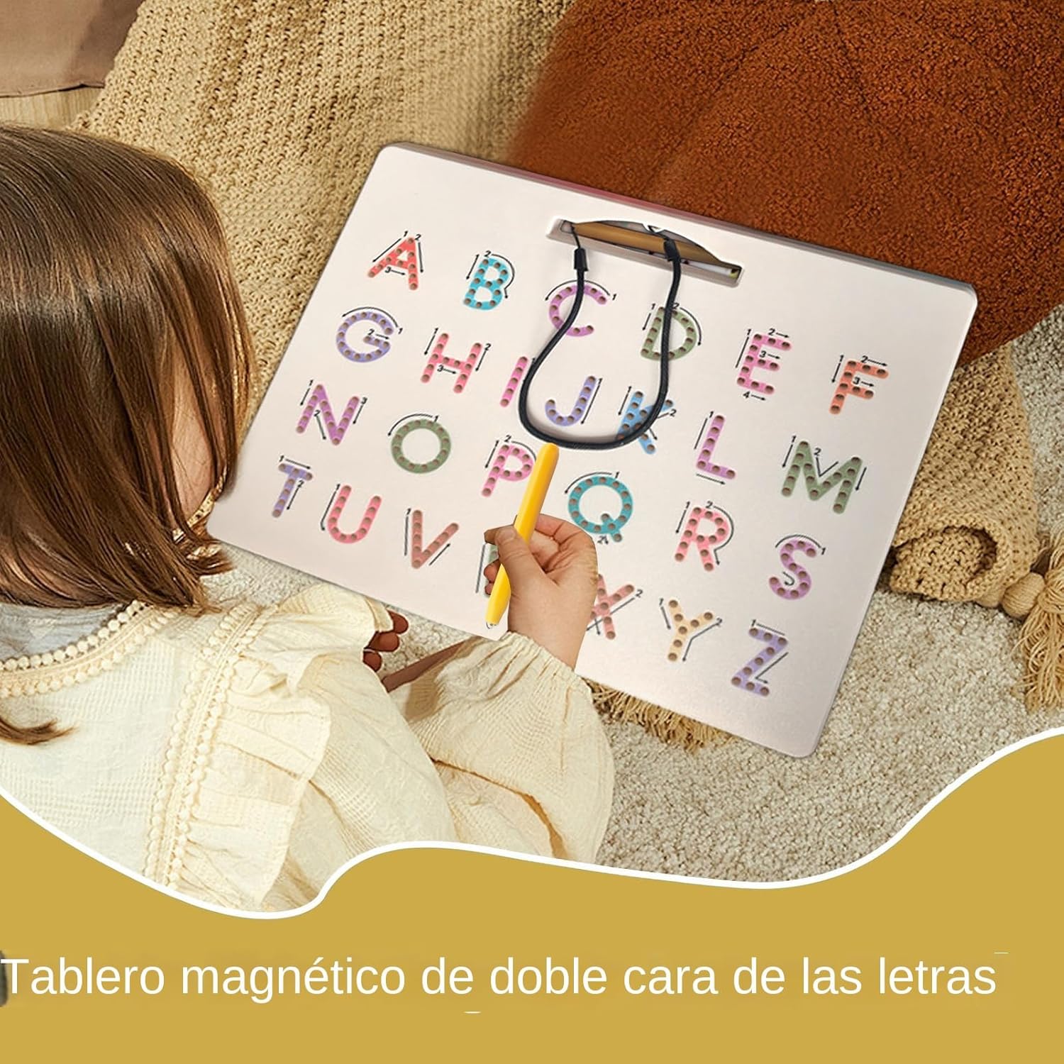 Accessibilità ottimizzata: con la penna magnetica attaccata al cruscotto, questa soluzione garantisce una facile memorizzazione e un facile recupero degli strumenti durante la pratica educativa Struttura solida: con materiali resistenti all'usura e bordi che proteggono le mani, assicurando che la lavagna mantenga la sua forma perfettamente anche con un uso ripetuto costante. Design a doppia faccia: scheda magnetica a doppio lato per una migliore pratica di scrittura, aiutando i bambini a imparare la corretta formazione delle lettere; la penna magnetica inclusa rafforza la memoria muscolare con un uso ripetitivo per progressi costanti. Regalo significativo: Opzione regalo premurosa per pietre miliari di apprendimento, mix divertimento e utilità per supportare lo sviluppo cognitivo giocando con le lettere sul cruscotto Apprendimento pratico: combina magneti e tracciati per trasformare l'apprendimento in un gioco interattivo, incoraggiando la scoperta sensoriale attraverso attività giocose che sviluppano capacità motorie fini nei bambini.