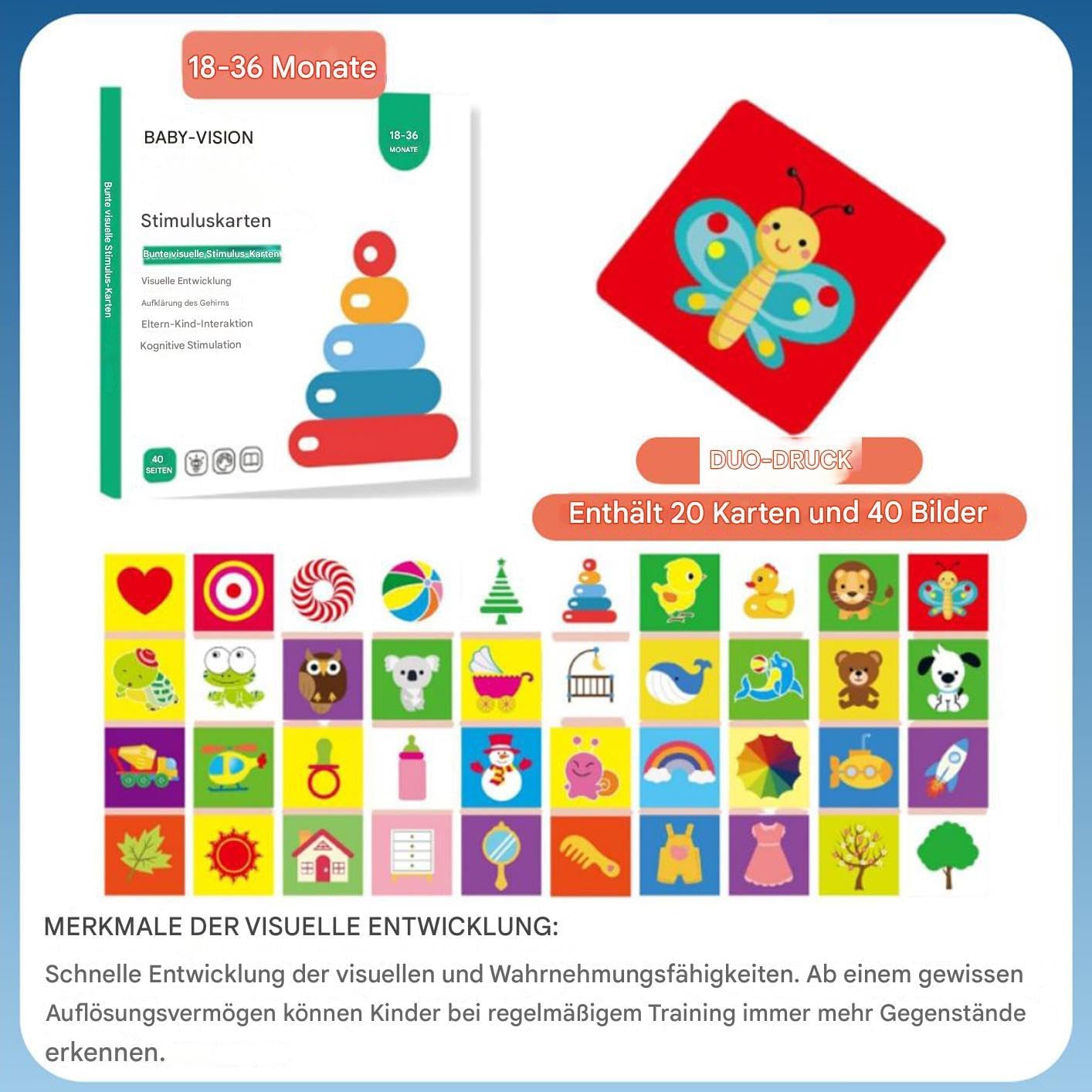Resistente all'usura: con materiale cartaceo di alta qualità, la flashcard è resistente agli strappi e allo sbiadimento, offrendo uno strumento di apprendimento resistente e inodore Sviluppo cognitivo: diversi motivi per gli oggetti introducono i bambini a una varietà di forme e colori, promuovendo la crescita cognitiva e la stimolazione visiva Promuove lo spazio di apprendimento interattivo: con l'attraente flashcard per la prima infanzia, i bambini possono comprendere i concetti di base, aumentare le capacità cognitive e promuovere l'interazione con genitore-figlio Prevenire lesioni alla pelle: proteggere l'angolo arrotondato dai graffi durante il trattamento delle carte e creare un ambiente sicuro e sano in cui il bambino possa imparare L'ampio gamma di usi: Ampiamente utilizzata e adatta a bambini da 0 a 3 anni, la nostra flashcard per bambini è perfetta per esperienze di apprendimento interne ed esterne.