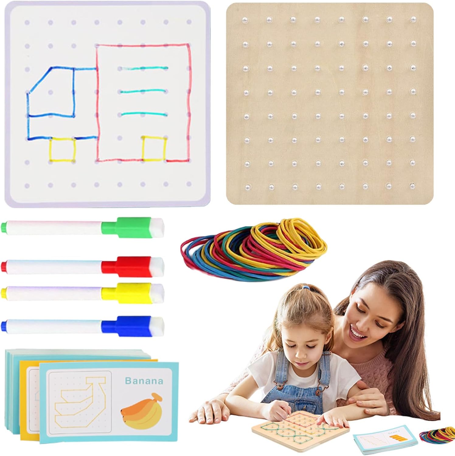 【Libertà e sicurezza】 Abbiamo progettato con cura 64 chiodi rotondi, l'elastico di Geo Boards For Classroom è abbastanza forte e il design degli angoli arrotondati consente ai bambini di giocare liberamente e in sicurezza 【Pratica delle abilità motorie fini】 Costruisci forme diverse sulla tavola geometrica in base alle carte , Geoboards With Rubber Bands è una grande opportunità per i bambini per promuovere le capacità motorie e la coordinazione occhio-mano 【Istruzione e intrattenimento】 Geo Board Set è adatto a bambini di età compresa tra 3 e 6 anni, costruisce le abilità di differenza di colore e dimensioni delle forme, aiuta i bambini a imparare forme, colori, contare 【Pensiero geometrico】 Le carte sono progettate per avere forme geometriche astratte sul davanti e sul retro. Rubber Band Board aiuta i bambini a sviluppare il pensiero geometrico astratto. L'è esplorare vari tipi di forme 2D e modelli geometrici computazionali 【Funzioni multiple】 Oltre all'apprendimento della geometria in età prescolare, una varietà di oggetti diversi di Geoboard in legno può anche aiutare i bambini a imparare il vocabolario di oggetti di uso quotidiano, come animali, veicoli, verdure, ecc., Quindi questo è strumento di apprendimento versatile