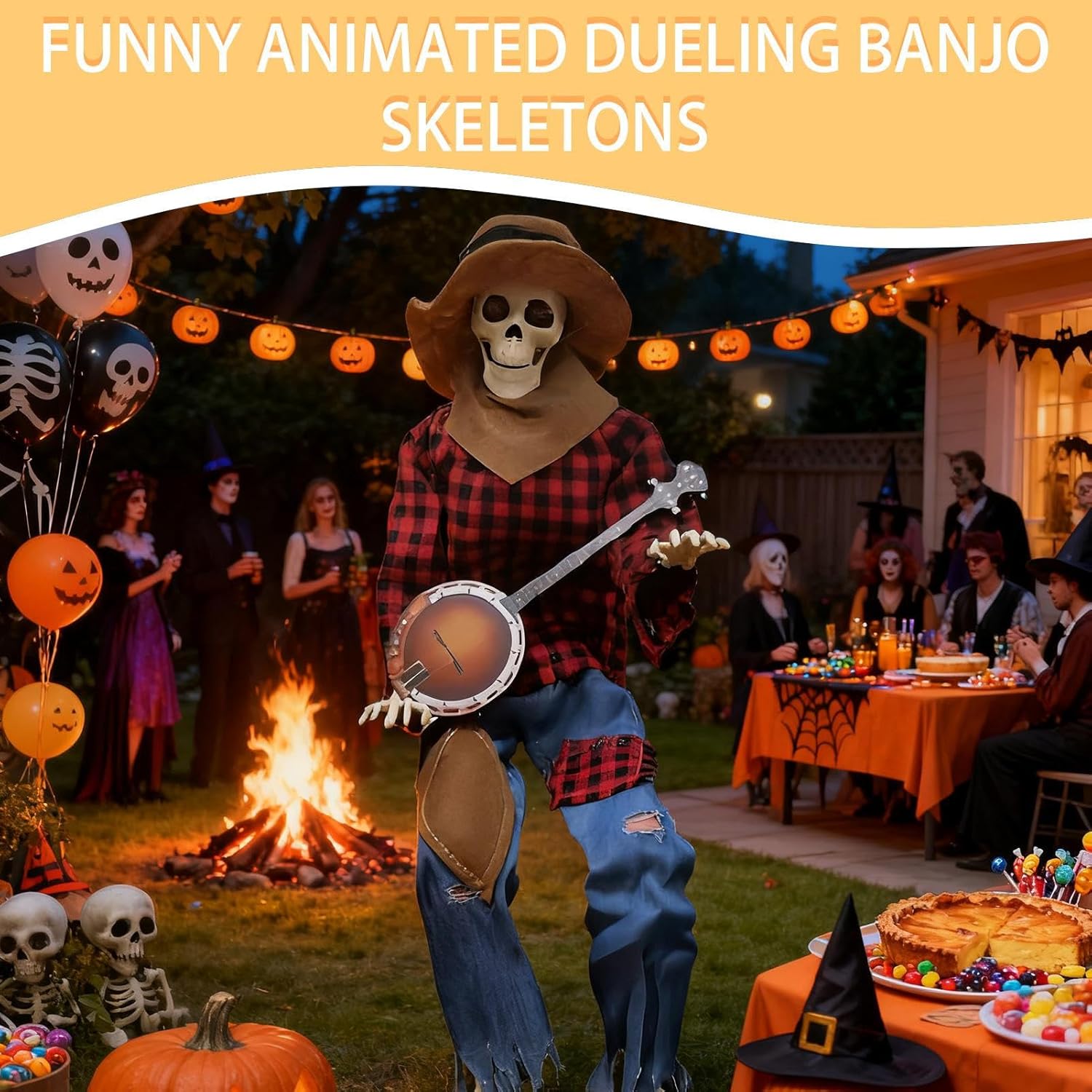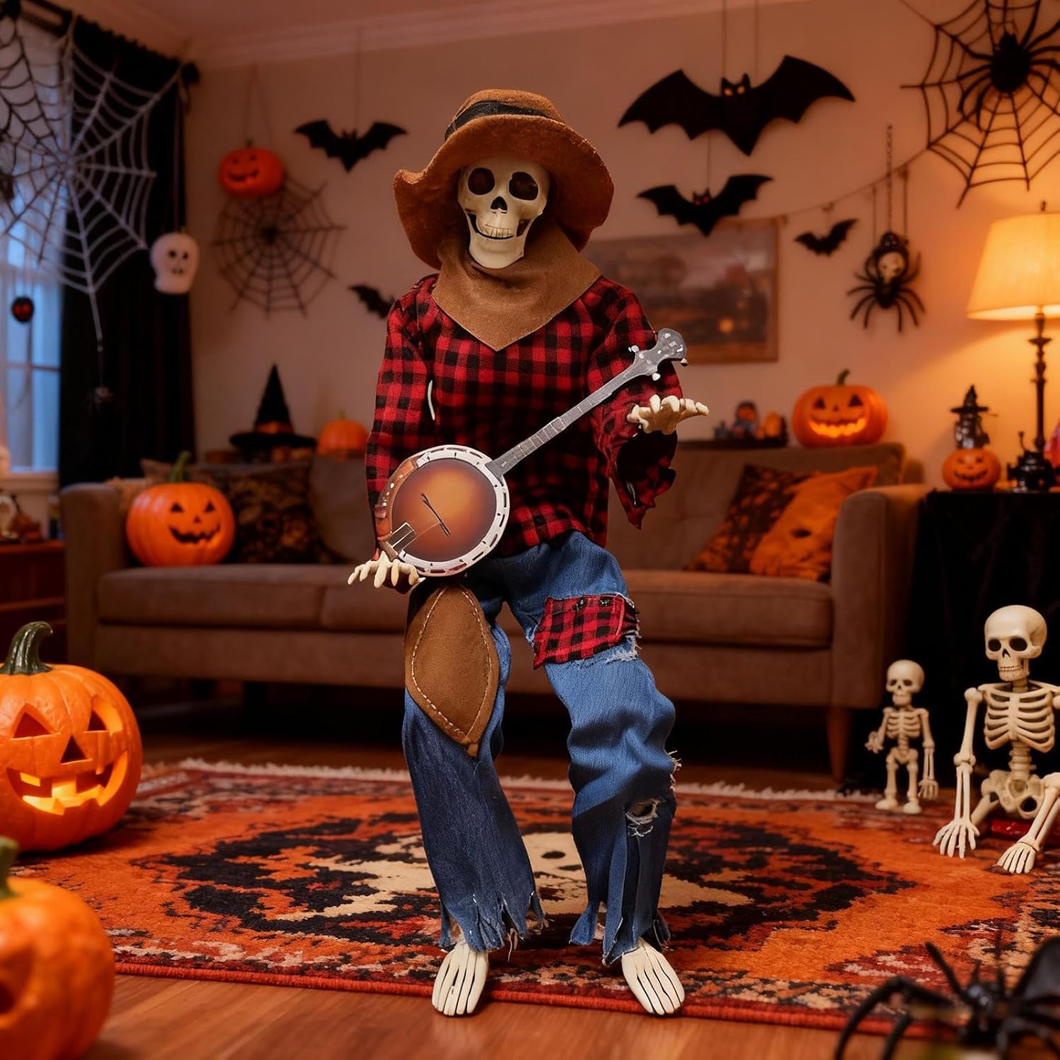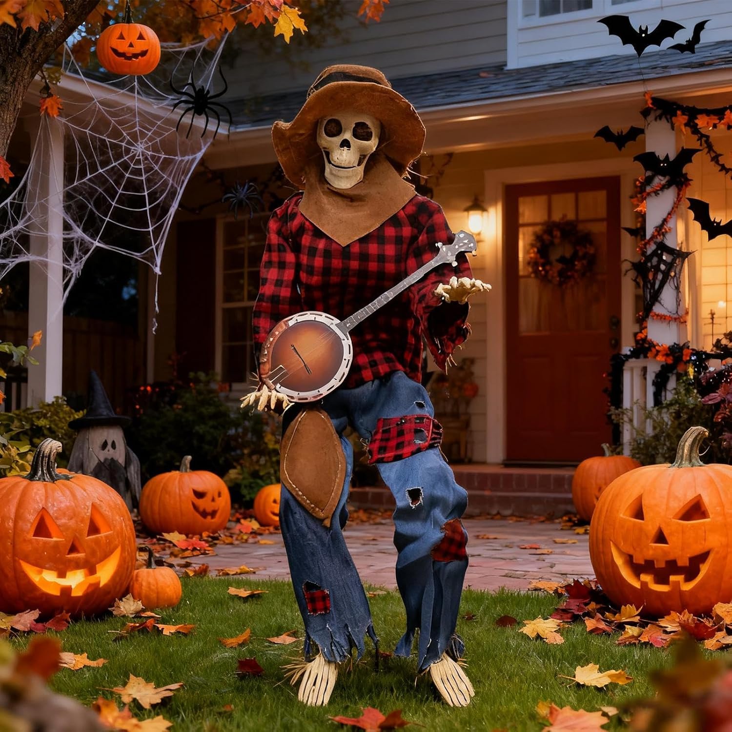 Postura dinamica: gli innovativi giunti di collegamento assicurano regolazioni fluide della posa per pose drammatiche o quotidiane che aggiungono un tocco personale alle decorazioni di Halloween Design straordinario: cattura l'attenzione con questo scheletro a grandezza naturale con movimenti fluidi delle mani e della testa, progettato per vivaci esibizioni di duelli con banjo che accendono la gioia e creano momenti indimenticabili in ogni evento Fascino country: aggiungi un tocco di eleganza rustica alle tue festività autunnali con questo elemento decorativo enfatizzato dallo scheletro. Progettato per migliorare visivamente e sottolineare l'atmosfera del fienile durante la stagione di Halloween: gli occhi luminosi danno vita a questa decorazione a scheletro, combinata con movimenti dinamici e fascino autunnale - accompagnati da musica allegra per un ambiente invitante. Aree di utilizzo flessibili: ideale come centrotavola per feste di Halloween e decorazioni spettrali per la casa, crea ricordi autunnali duraturi attraverso il design affascinante di terrazze, giardini o aree per eventi a tema con un'atmosfera spettrale