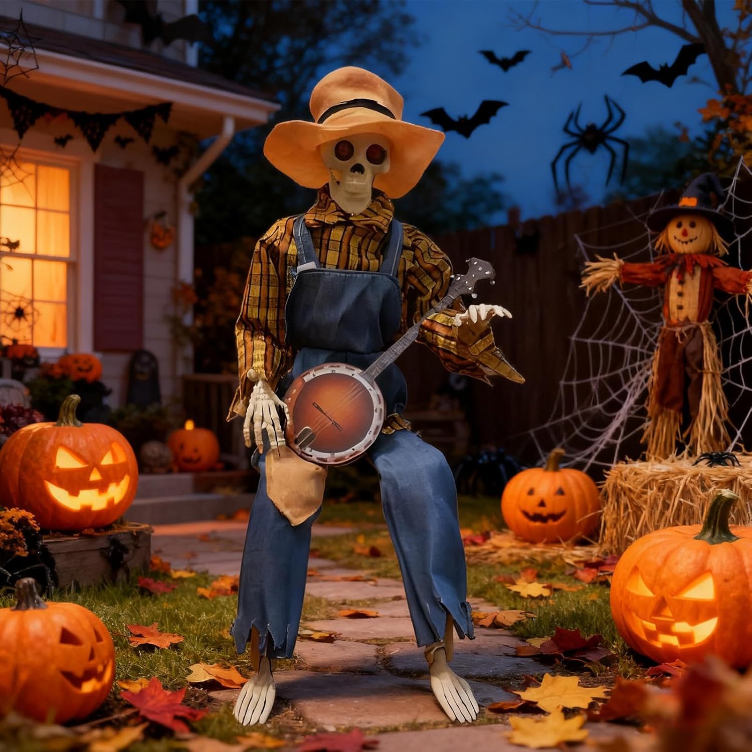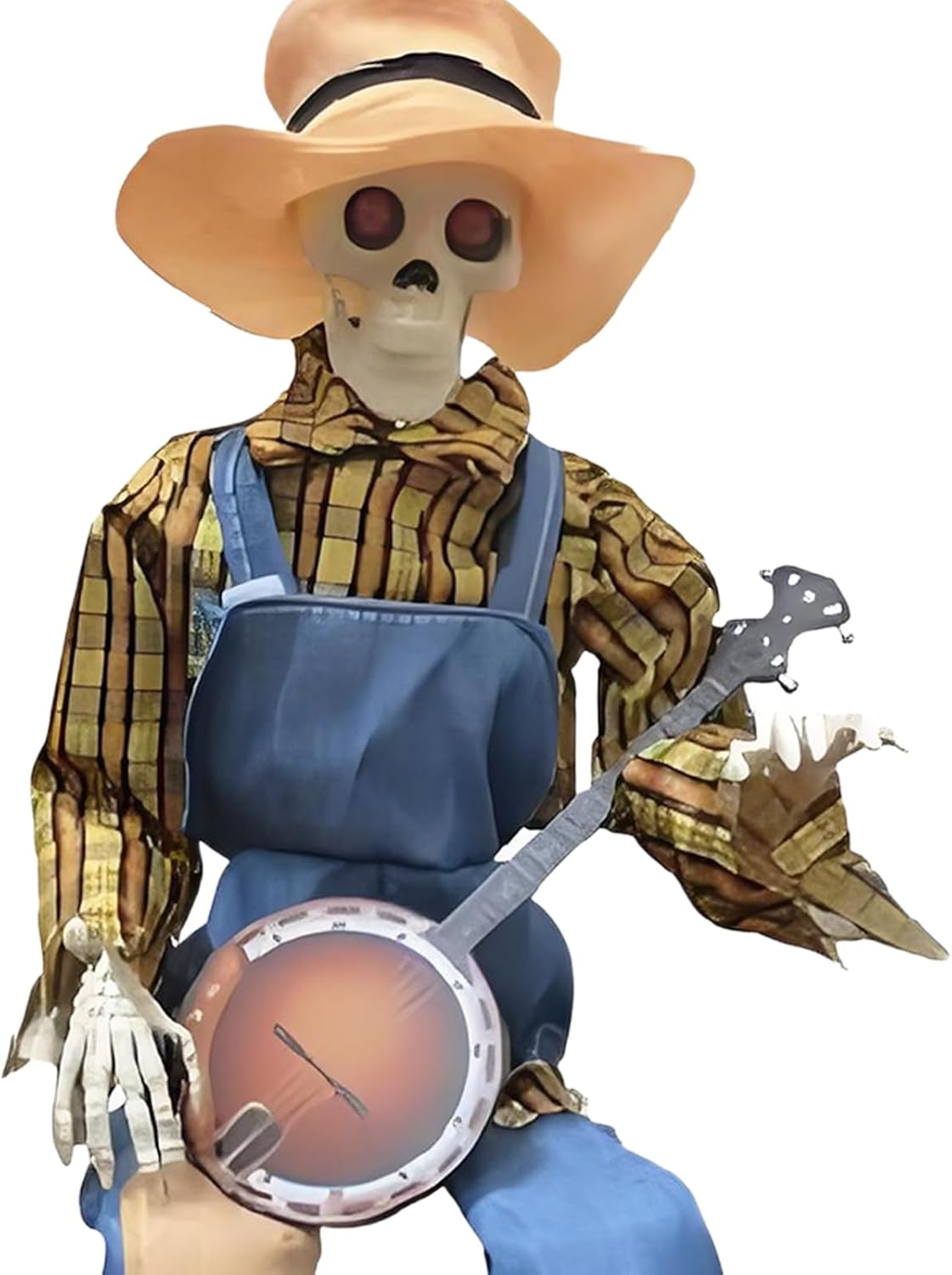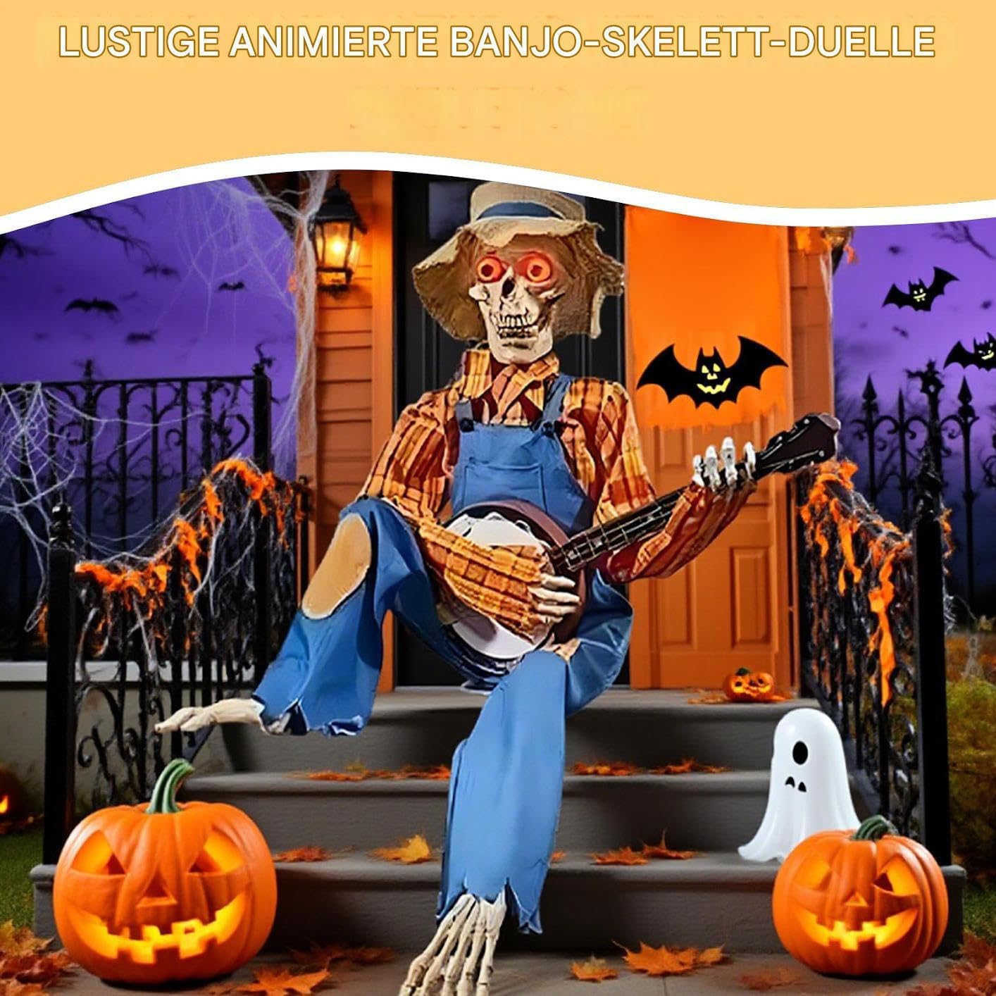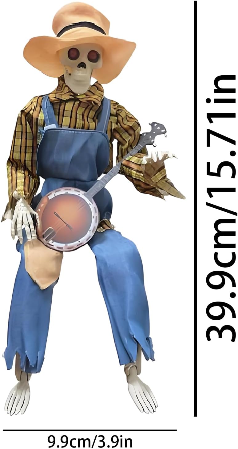 Giunti mobili: questo scheletro di Halloween è dotato di giunti completamente articolati che consentono innumerevoli pose realistiche, supportando arrangiamenti creativi per idee decorative uniche e spettrali. Design straordinario: cattura l'attenzione con questo scheletro a grandezza naturale con movimenti fluidi delle mani e della testa, progettato per vivaci esibizioni di duelli di banjo che accendono la gioia e creano momenti indimenticabili in ogni evento. Fascino country: aggiungi un tocco di eleganza rustica alle tue feste autunnali con questo elemento decorativo a forma di scheletro. Progettata per migliorare visivamente e completare il fienile durante la stagione di Halloween: dotata di melodie giocose e movimenti animati, questa decorazione a scheletro enfatizza gli occhi luminosi e il fascino stagionale del raccolto per un quadro generale armonioso del tuo design a tema. Uso multifunzionale: trasforma le stanze con versatile spettralità, ideale come elemento centrale della festa di Halloween, crea ricordi stagionali indimenticabili e migliora la presentazione di cortili o aree del cortile
