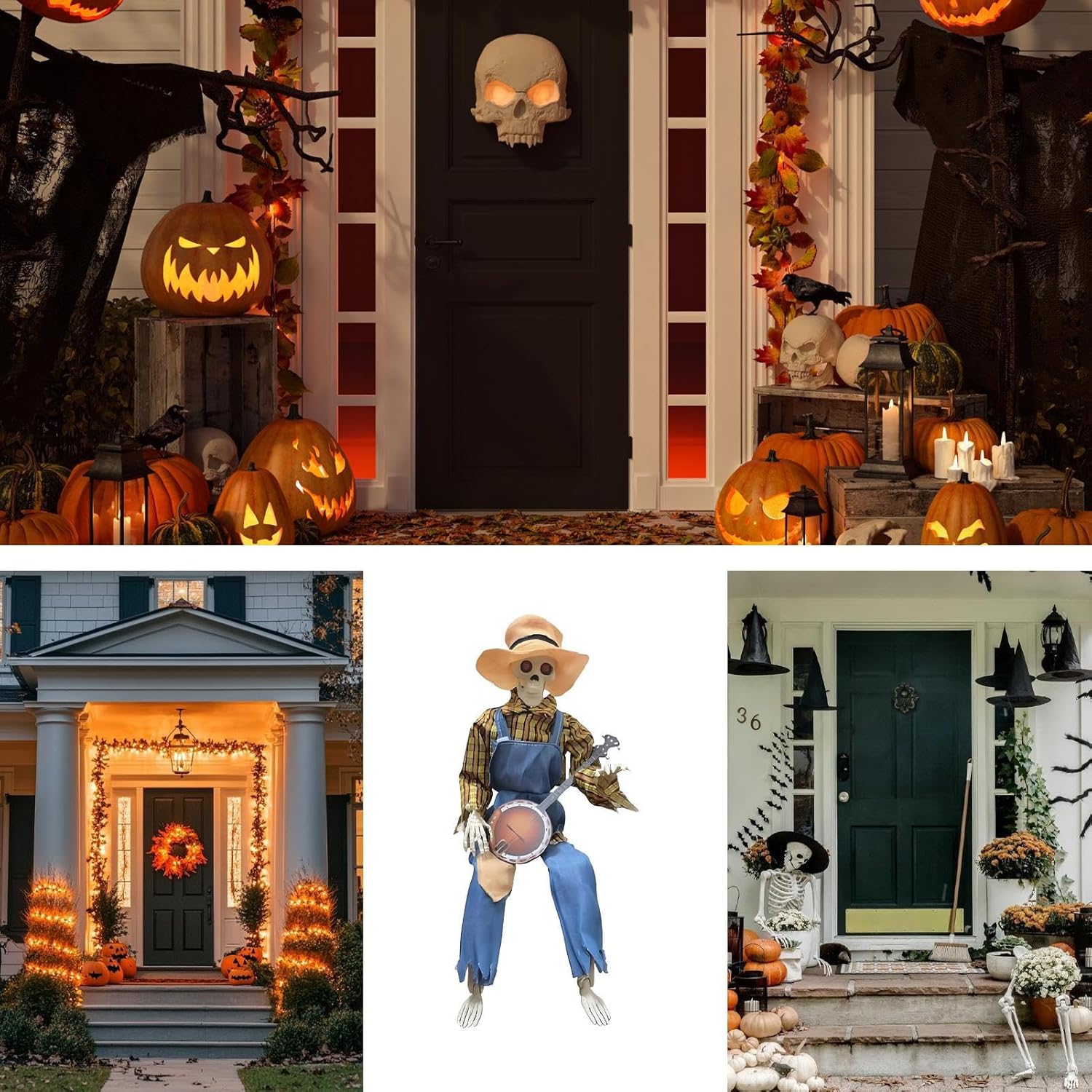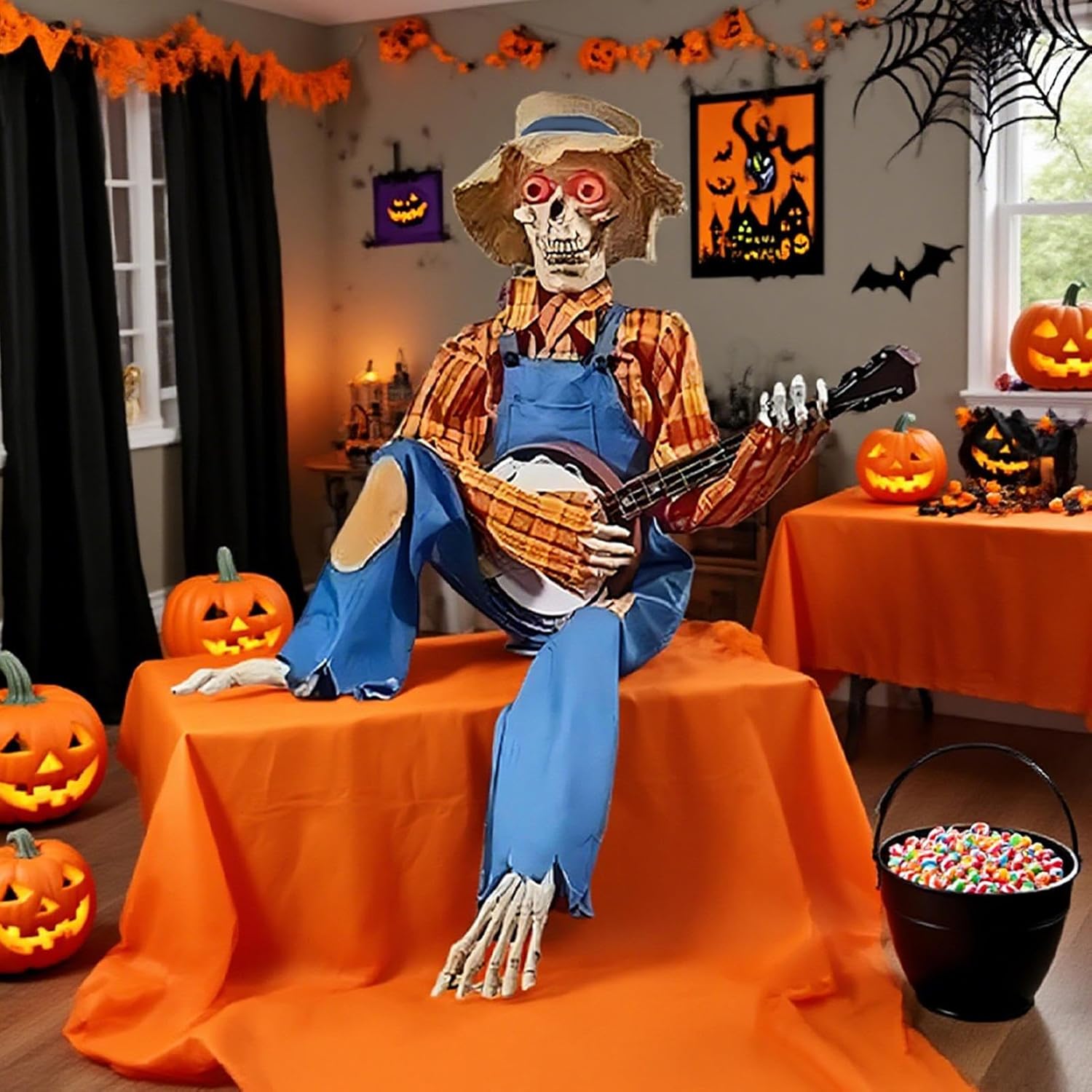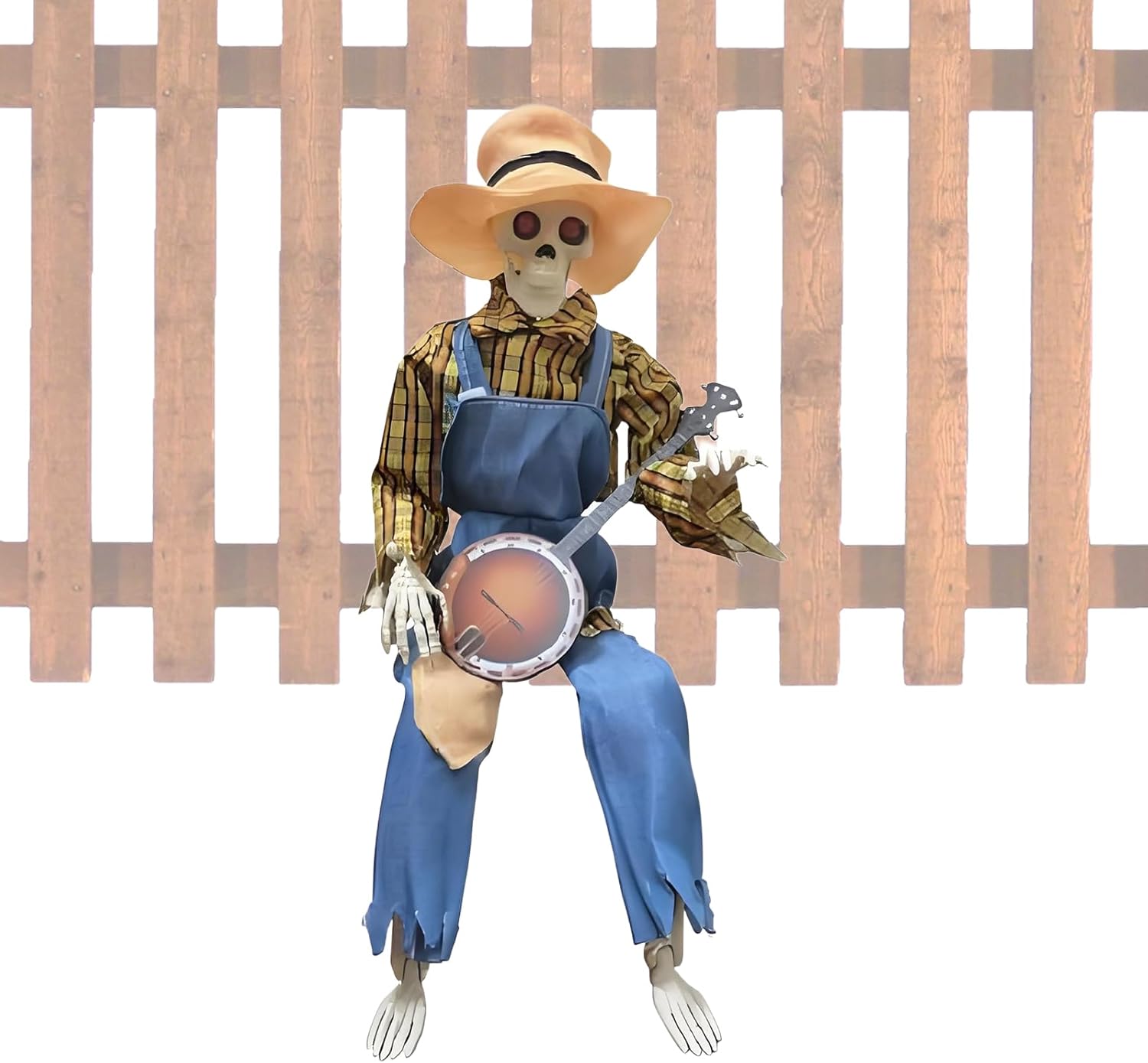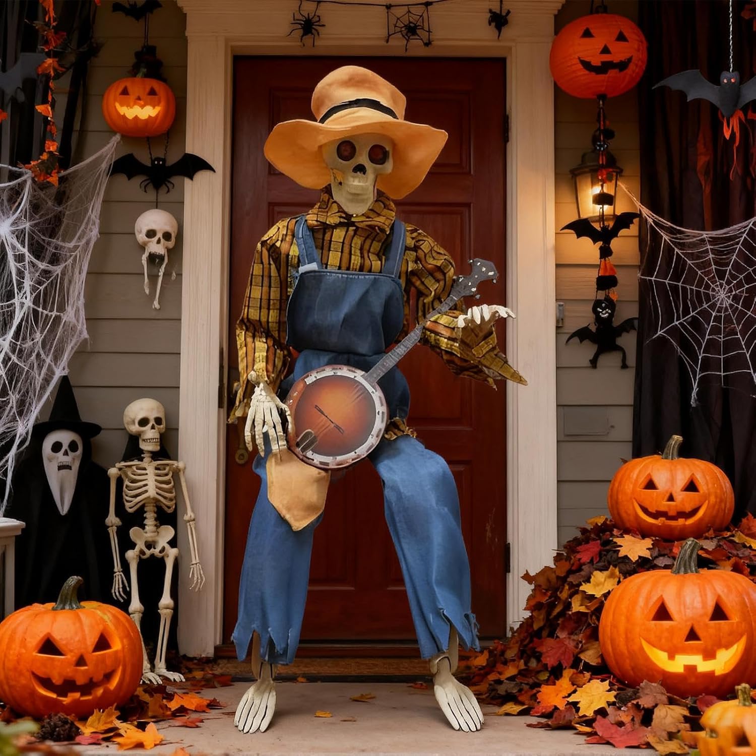 Giunti mobili: questo scheletro di Halloween è dotato di giunti completamente articolati che consentono innumerevoli pose realistiche, supportando arrangiamenti creativi per idee decorative uniche e spettrali. Design straordinario: cattura l'attenzione con questo scheletro a grandezza naturale con movimenti fluidi delle mani e della testa, progettato per vivaci esibizioni di duelli di banjo che accendono la gioia e creano momenti indimenticabili in ogni evento. Fascino country: aggiungi un tocco di eleganza rustica alle tue feste autunnali con questo elemento decorativo a forma di scheletro. Progettata per migliorare visivamente e completare il fienile durante la stagione di Halloween: dotata di melodie giocose e movimenti animati, questa decorazione a scheletro enfatizza gli occhi luminosi e il fascino stagionale del raccolto per un quadro generale armonioso del tuo design a tema. Uso multifunzionale: trasforma le stanze con versatile spettralità, ideale come elemento centrale della festa di Halloween, crea ricordi stagionali indimenticabili e migliora la presentazione di cortili o aree del cortile