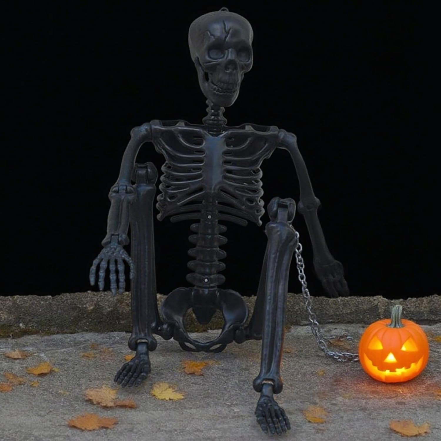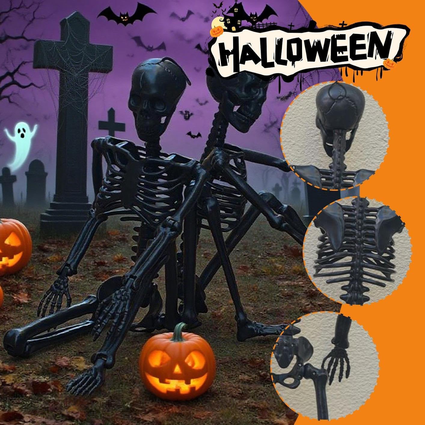 Scheletro di Halloween a grandezza naturale con dispositivo mobile, perfetto per decorazioni spettrali all'aperto su balconi, cortili, giardini e prati. Il design durevole sta all'aperto per rendere l'allestimento del tuo cimitero inquietante e realistico. Lo scheletro in stile gotico aggiunge un tocco di classe al tuo cortile o patio di Halloween. Arti facili da posare e riposizionare per esposizioni spettrali creative e personalizzate. Ideale per feste di Halloween, case stregate e decorazioni stagionali.