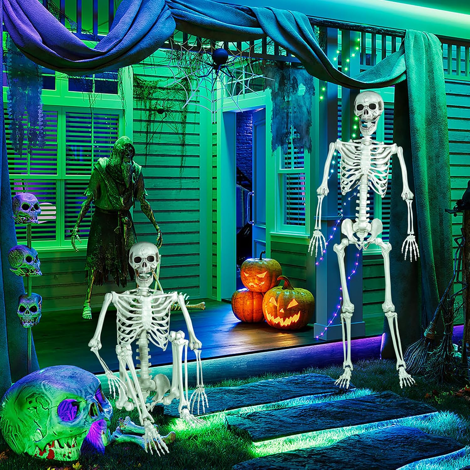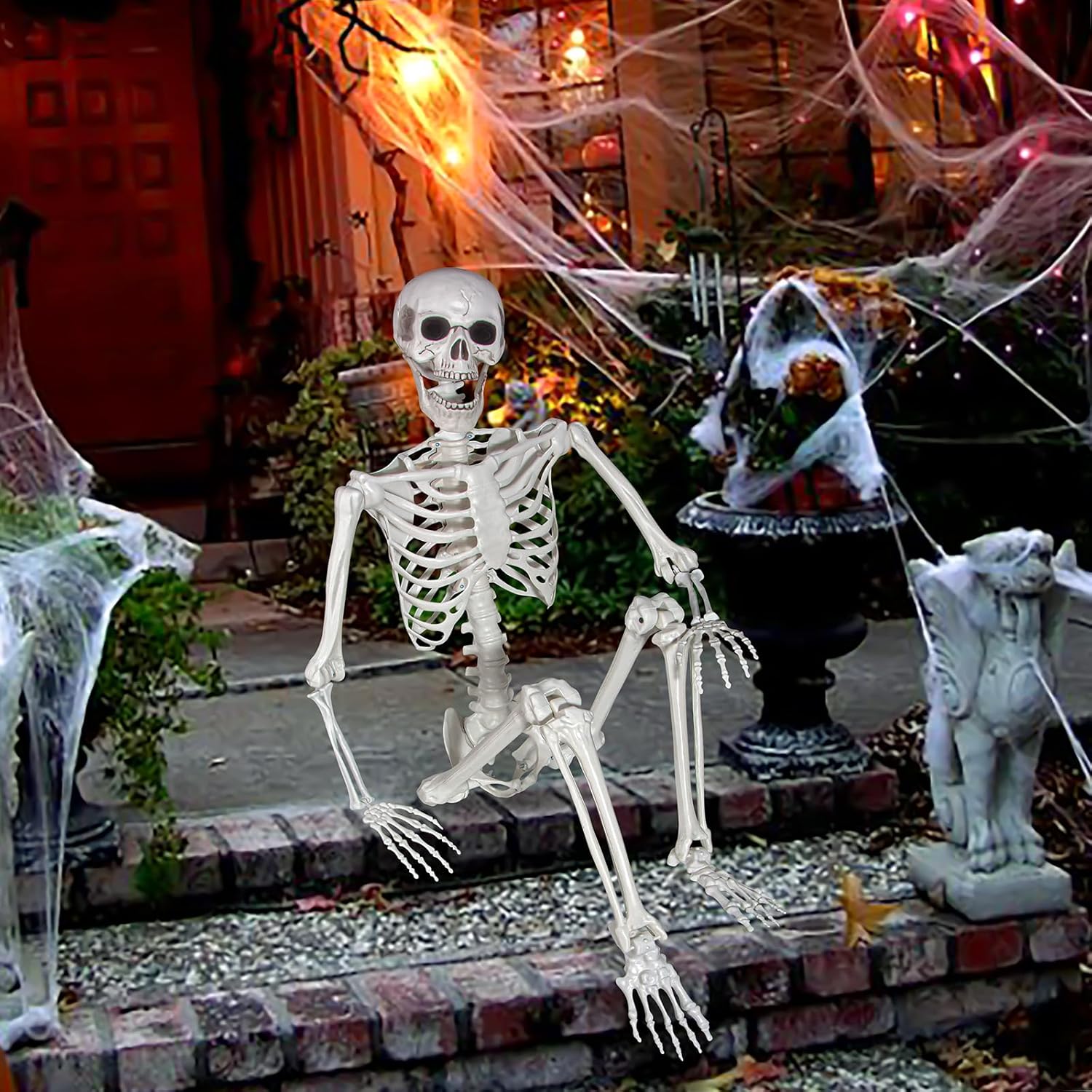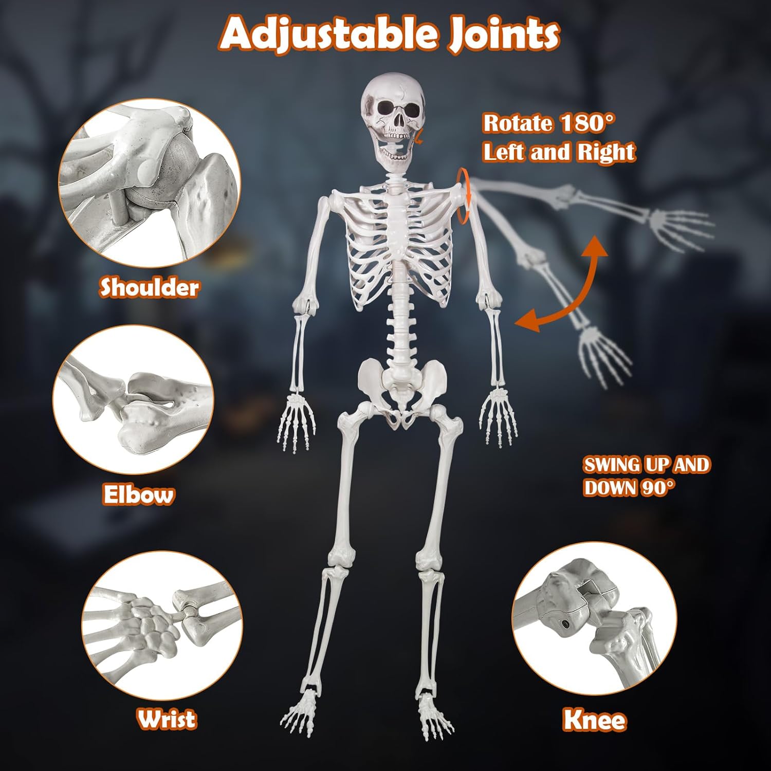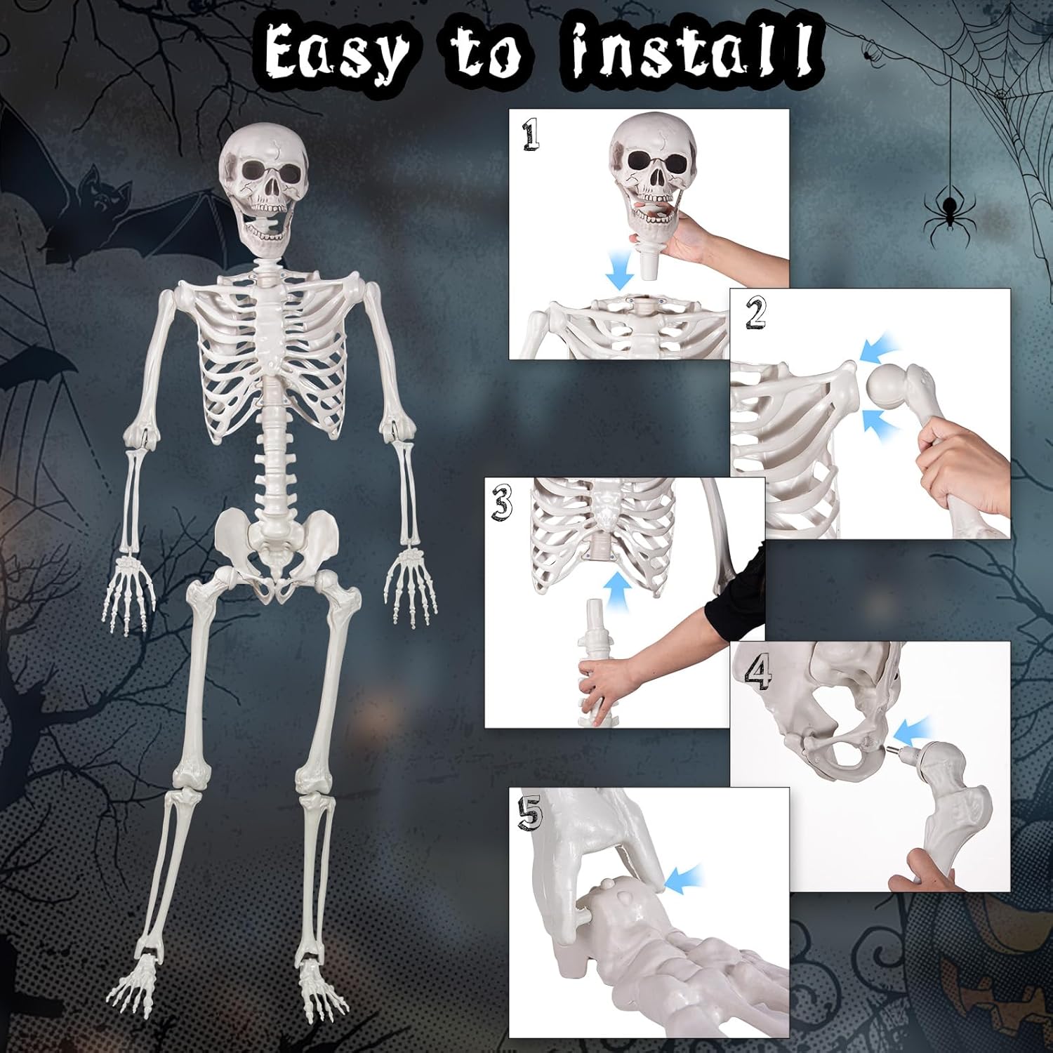 Scheletro integrale di Halloween realizzato in plastica resistente, scheletro per adulti da 165 cm con articolazioni mobili. La testa dello scheletro, la parte centrale del corpo e la parte inferiore del corpo sono smontabili, ma è molto facile da assemblare. Si prega di inserire il collo nella colonna vertebrale, inserire la parte inferiore della colonna vertebrale nella parte superiore della colonna vertebrale e quindi terminare il montaggio. Lo scheletro di Halloween può spaventare i tuoi vicini, la famiglia e altri trucchi o treater, è la decorazione perfetta per case infestate e feste di Halloween. Elementi di scena in plastica a grandezza naturale con testa mobile, mascella, l'articolazione è posabile. Facile installazione di parti del corpo per visualizzare diverse posizioni e pose. Lo scheletro realistico è ottimo per decorazioni interne ed esterne, progetti, scherzi e molto altro ancora.