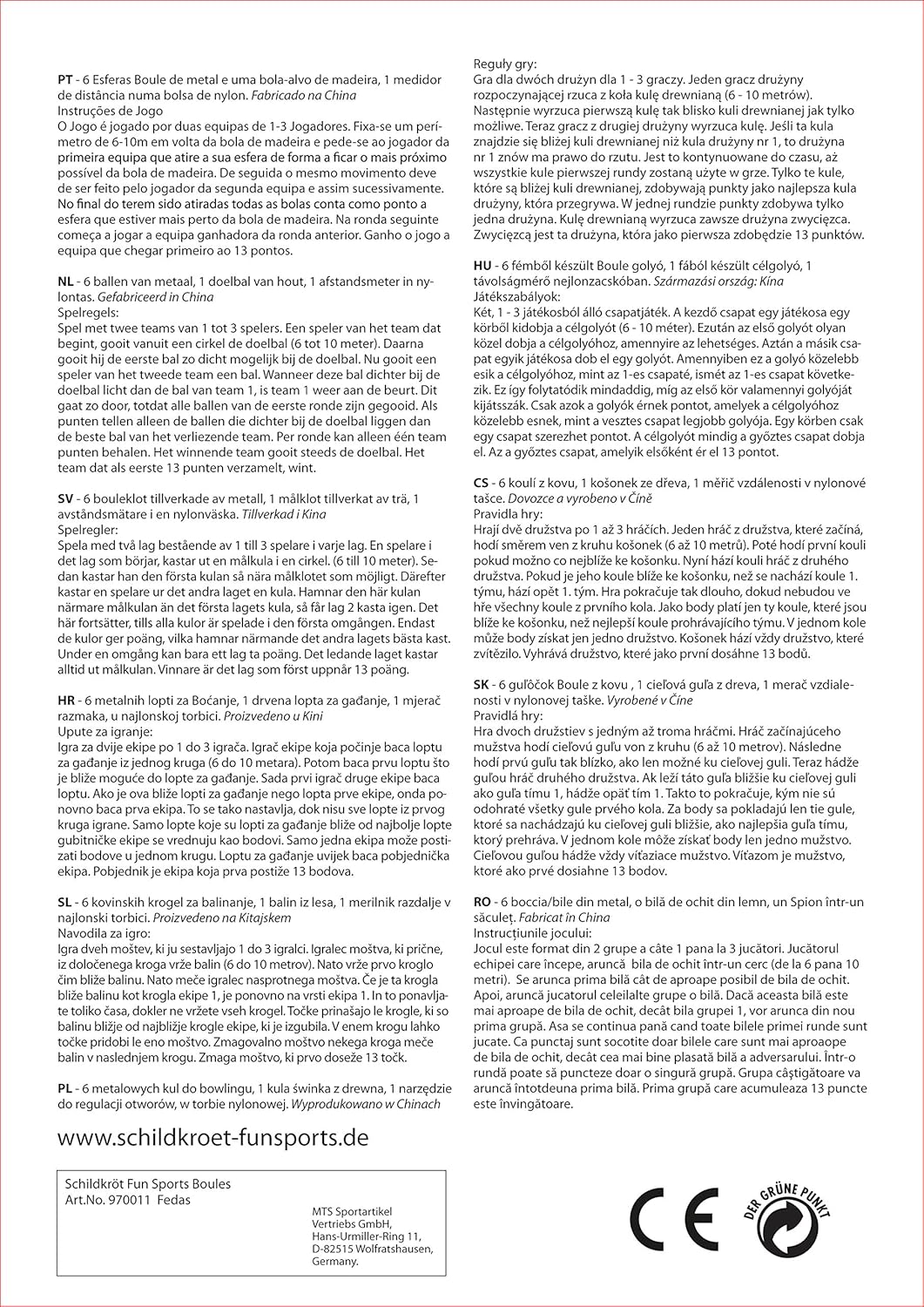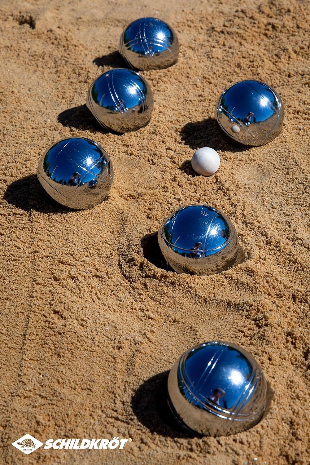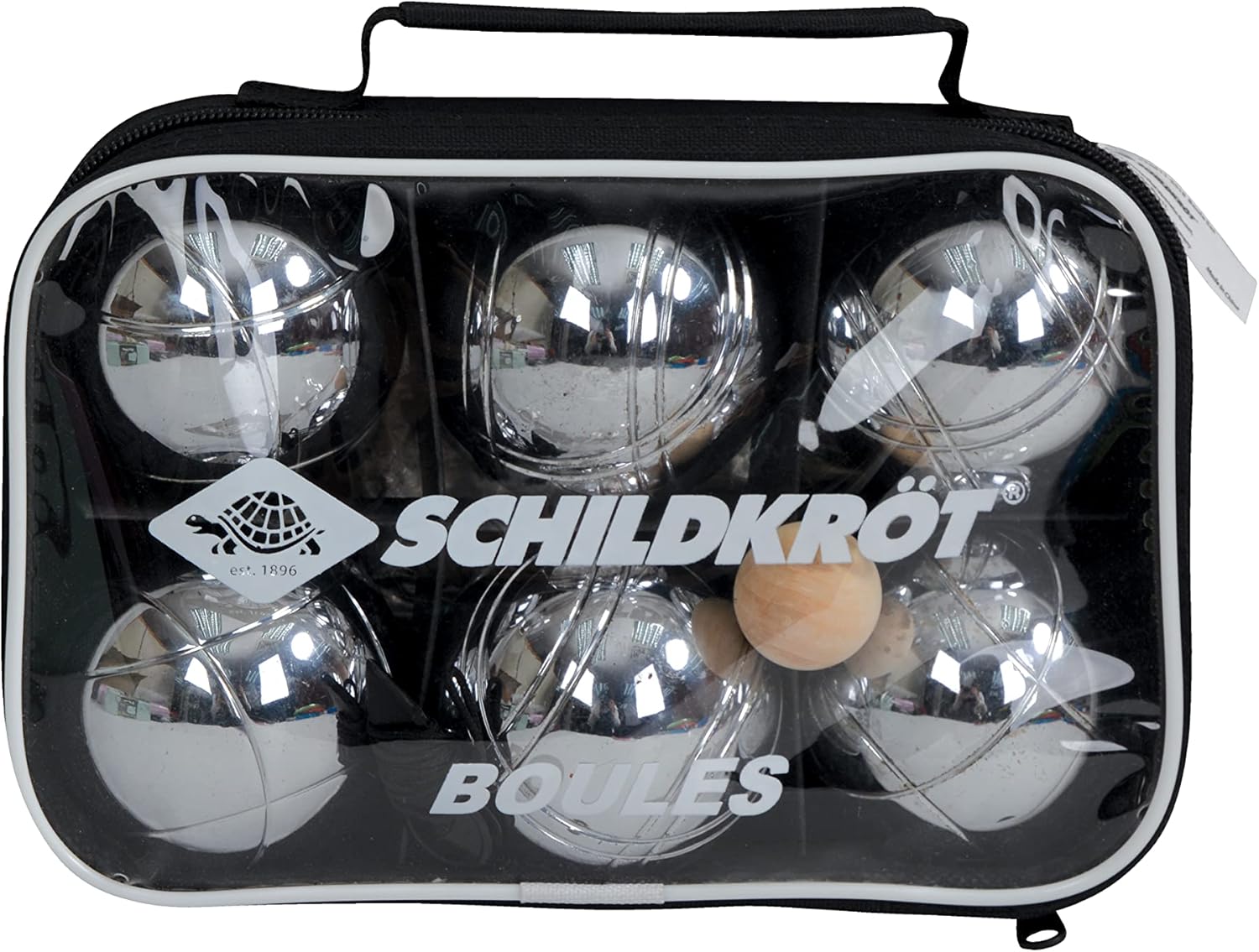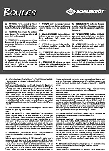 Bel set di bocce per il tempo libero per 2 giocatori 2 x 3 palline con marcatura diversa per una facile differenziazione Le sfere in acciaio sono riempite di sabbia e saldate, diametro 7,25 cm Include palla bersaglio e misuratore di distanza Tutto racchiuso in una borsa di nylon nero di alta qualità con manico e cerniera