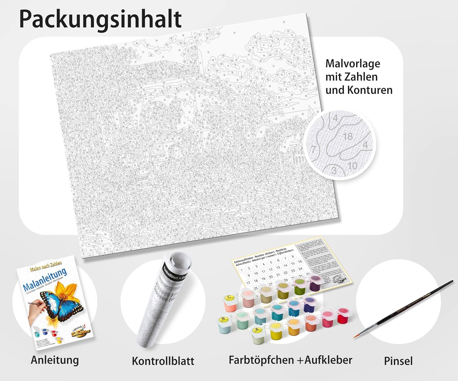 Fantastico modello: con la pagina da colorare Schipper per adulti, ogni pittore amatoriale e principiante ottiene un'opera d'arte sulla tela, che funziona senza alcuna conoscenza preliminare del tema della pittura Dipinto – Portate questo splendido motivo nel vostro salotto. I fantastici colori garantiscono una piacevole atmosfera nelle vostre quattro pareti Effetto olio su tela: la tela finemente prestampata ha una struttura in lino visibile e visibile. Ciò evidenzia ancora una volta il carattere autodipinto dell'immagine dopo il completamento Set completo: la confezione include 24 colori acrilici a base d'acqua, un pennello da pittura, istruzioni (lingua italiana non garantita), un modello e una pagina da colorare con dimensioni di 24 x 30 cm Produttore tedesco: Schipper offre un'ampia scelta di motivi per adulti e bambini. La qualità viene portata al livello successivo e la tecnica della pittura è quasi impossibile da vedere
