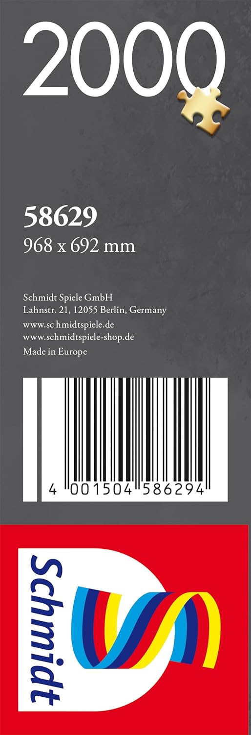SCHMIDT GIOCA Puzzle Premium – con qualità che puoi afferrare Puzzle da 2000 pezzi Dimensioni puzzle: 96,8 x 69,2 cm Età consigliata: a partire da 12 anni Grande varietà di forme grazie ai pezzi del puzzle dalla forma individuale, perfetta coesione grazie al cartone appositamente progettato, perfetta precisione grazie alle fustelle particolarmente sottili, speciale vernice opaca per puzzle senza specchio, struttura in lino.