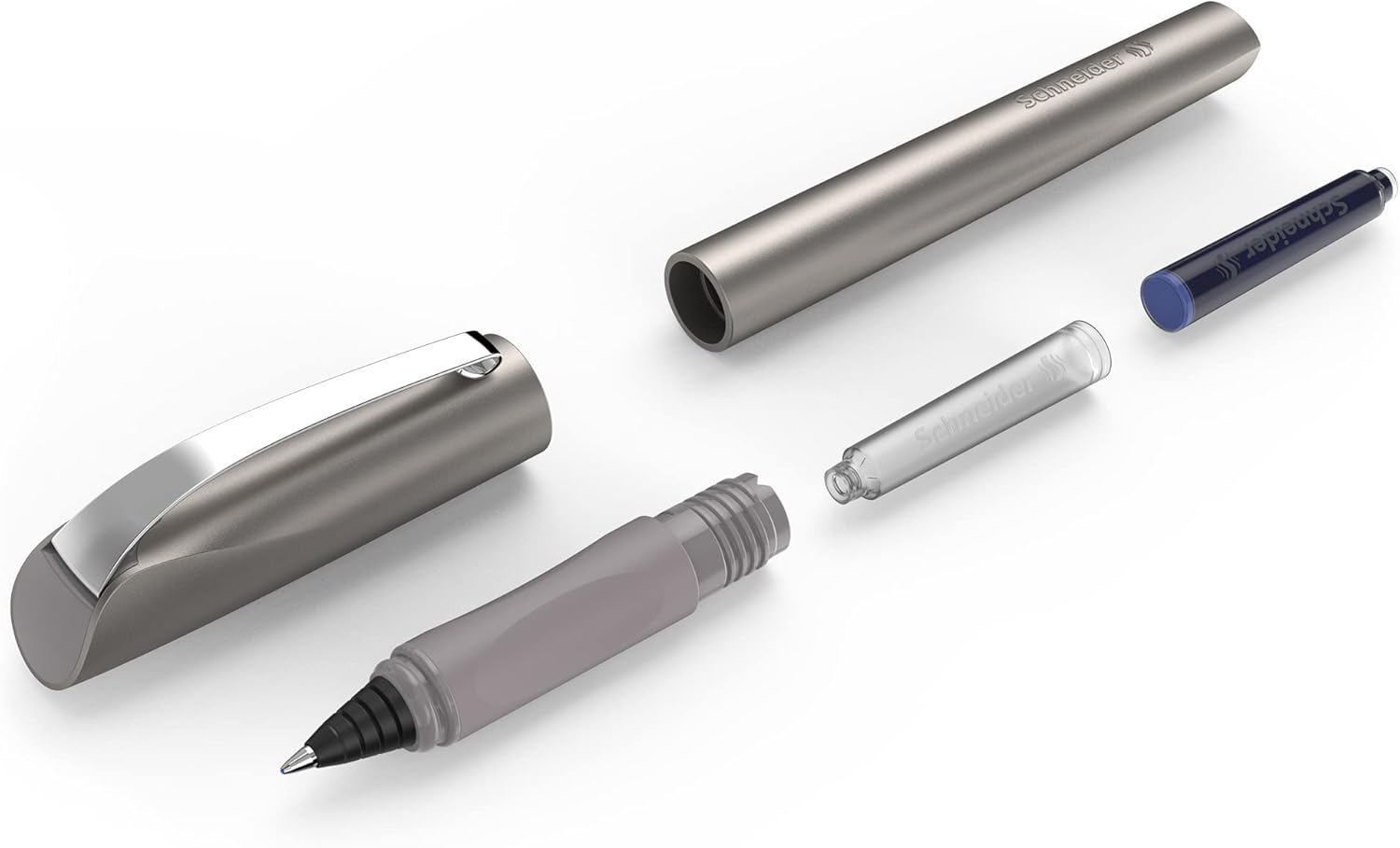 Profilo ergonomico dell'impugnatura gommato e pennino in acciaio inossidabile resistente all'usura Design moderno con elegante aspetto metallico e curve sorprendenti Ugualmente adatto per destrimani e mancini Dotato di una robusta clip in metallo e cartuccia d'inchiostro standard Fa brillare ogni scrittura
