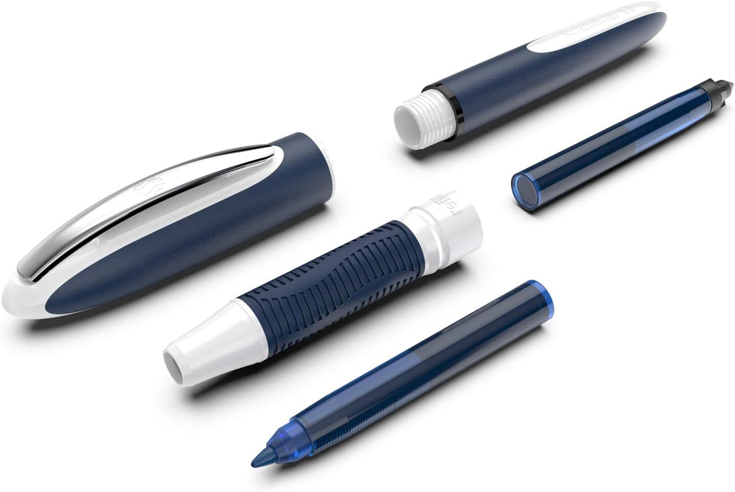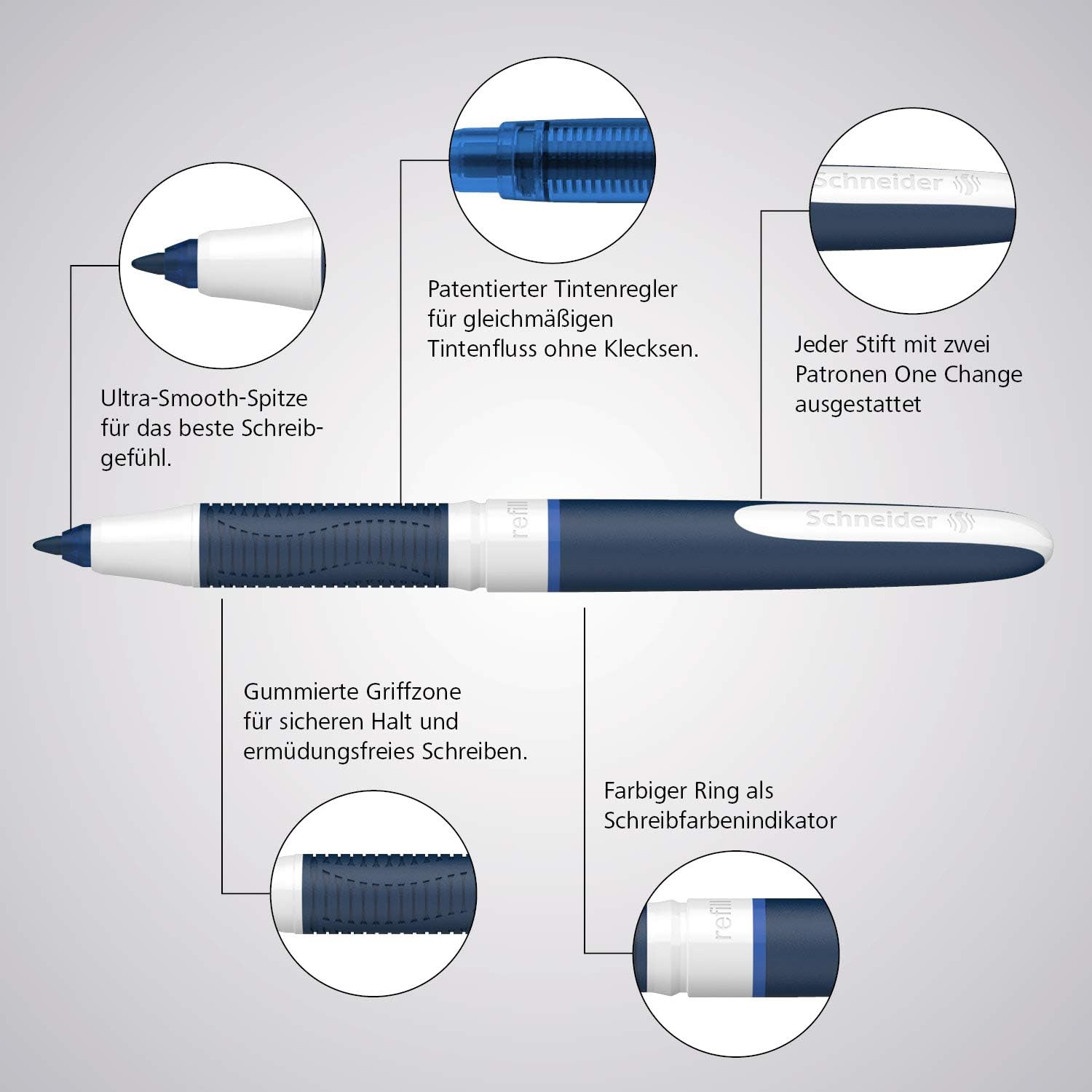 Penna roller con cartuccia sostituibile One Change con punta ultra liscia per la migliore sensazione di scrittura. Ogni penna è dotata di due cartucce One Change più una cartuccia gratis. Sistema Super Flow per un flusso d' inchiostro uniforme, ad asciugatura rapida e indelebile Cap-Off, può rimanere aperto per 2-3 giorni. Superficie ergonomica gommata Indelebile a norma ISO 14145-2; spessore del tratto circa 0,6 mm. inchiostro nero/corpo penna blu