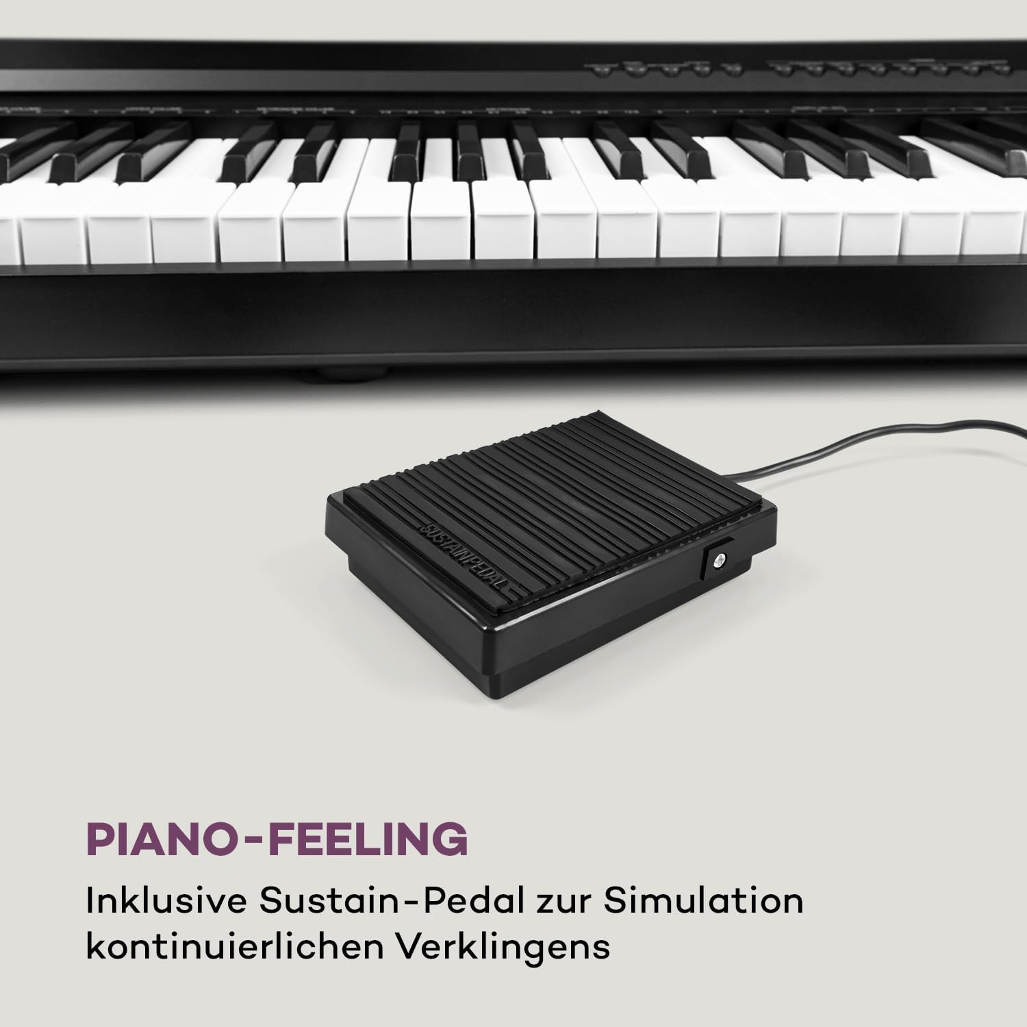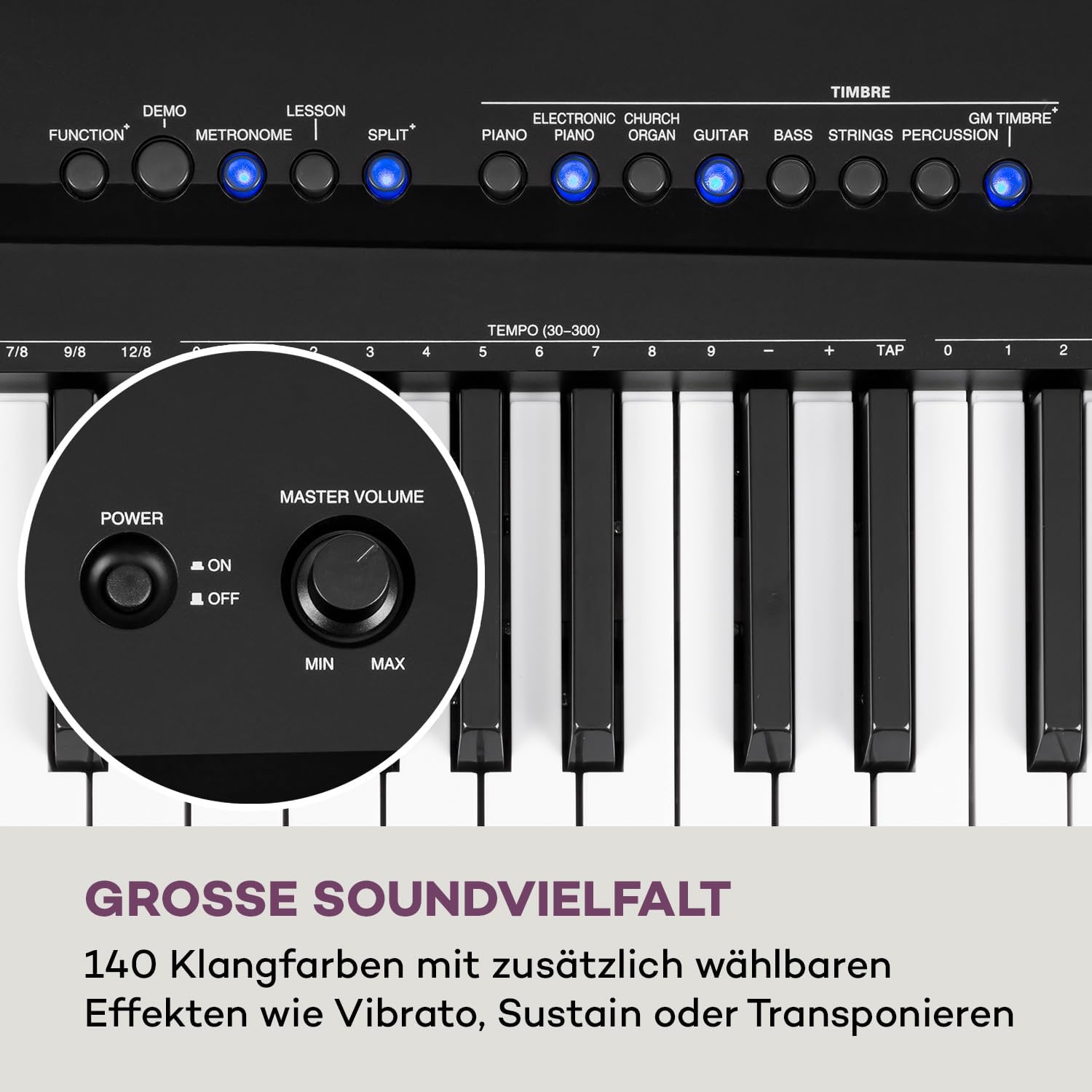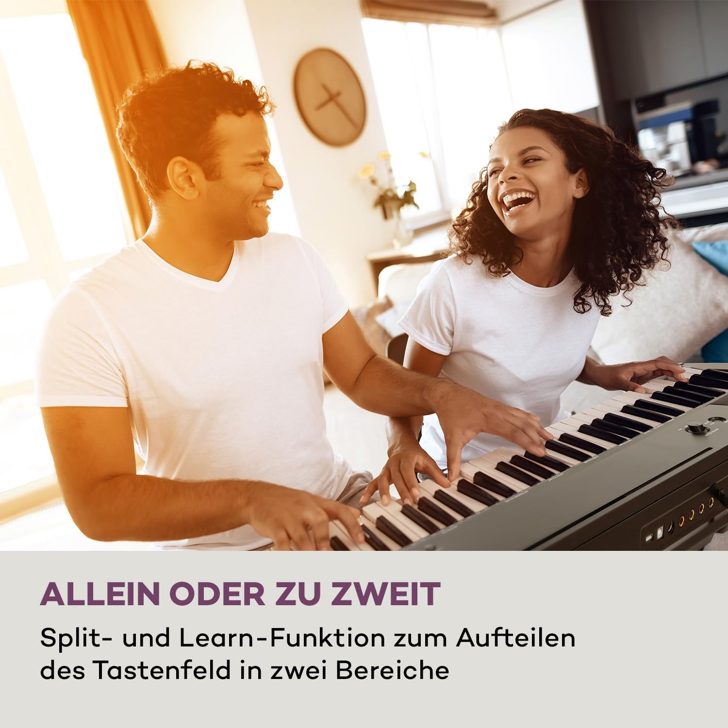 TASTI LUMINOSI: con 61 tasti illuminati sensibili al tocco, la tastiera didattica USB Schubert Etude 450 mostra la strada nel magico mondo dei toni e invita i principianti e coloro che ritornano al gioco a riprodurre ed esercitarsi con le proprie melodie. SUONARE SULLA TASTIERA È FACILE: con i suoi 88 tasti, la tastiera Schubert Preludio offre ai principianti, ai rimpatriati e ai musicisti avanzati numerose opportunità per entrare rapidamente nel mondo della musica e sviluppare il proprio modo di suonare. SPETTRO TONO: Ci sono 88 tasti pesati per lo spettro tonale, la cui dinamica del tocco può essere regolata su 3 livelli. Sono disponibili 140 toni, tempo regolabile e numerosi effetti sonori per adattarsi ai tuoi desideri musicali. CREATIVITÀ: Ciò garantisce creatività e buone opportunità di sviluppo quando si suona la tastiera Schubert Preludio. Il pedale di sostegno incluso offre una sensazione ancora più pianistica, dandoti il controllo sul decadimento degli attacchi, proprio come su un vero pianoforte. PRATICO: la funzione di apprendimento integrata offre ai principianti un'introduzione rapida e di successo al mondo della musica per pianoforte. Soprattutto i musicisti beneficiano della pratica funzione di apprendimento, in cui la tastiera è divisa in due aree che suonano allo stesso modo.