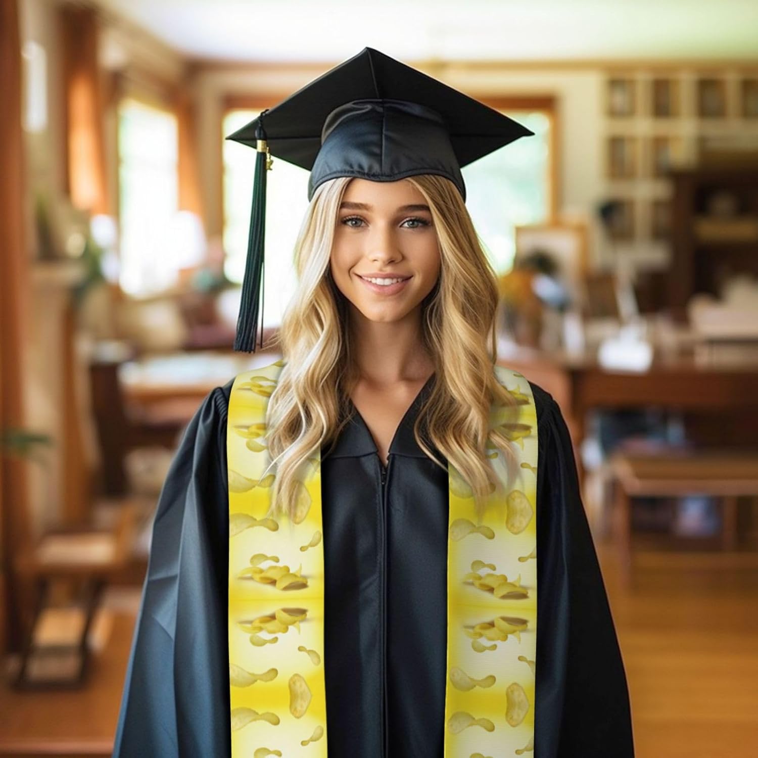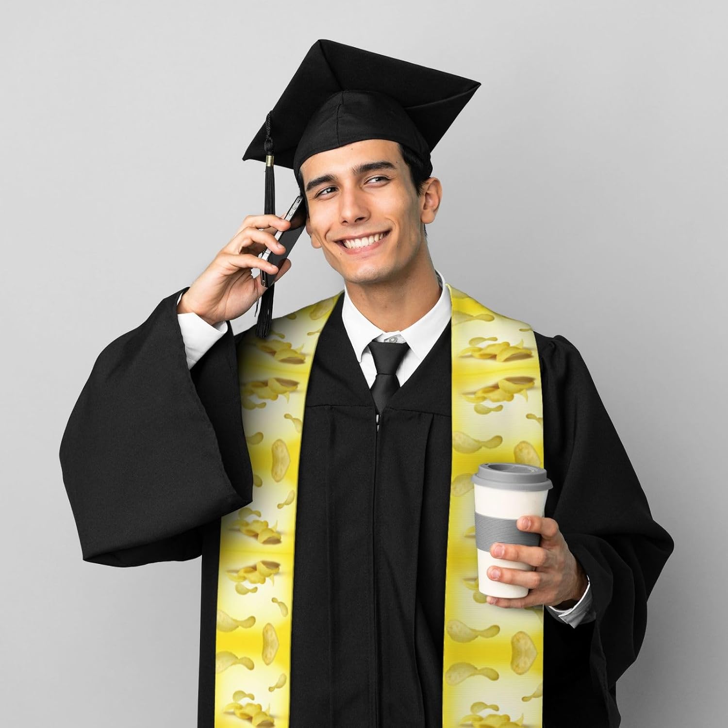 Questo nastro per scialle di laurea con patatine fritte è realizzato in raso colorato di alta qualità, leggero, ha un buon drappeggio, è lucido e non si deforma facilmente. Lo squisito design del motivo rende lo scialle molto adatto per abiti da laurea, senza scivolare. Questo è un importante regalo di laurea, che è molto adatto per parenti, figli, figlie, amici e sorelle. Design ad angolo acuto su entrambe le estremità, con una rottura nel mezzo