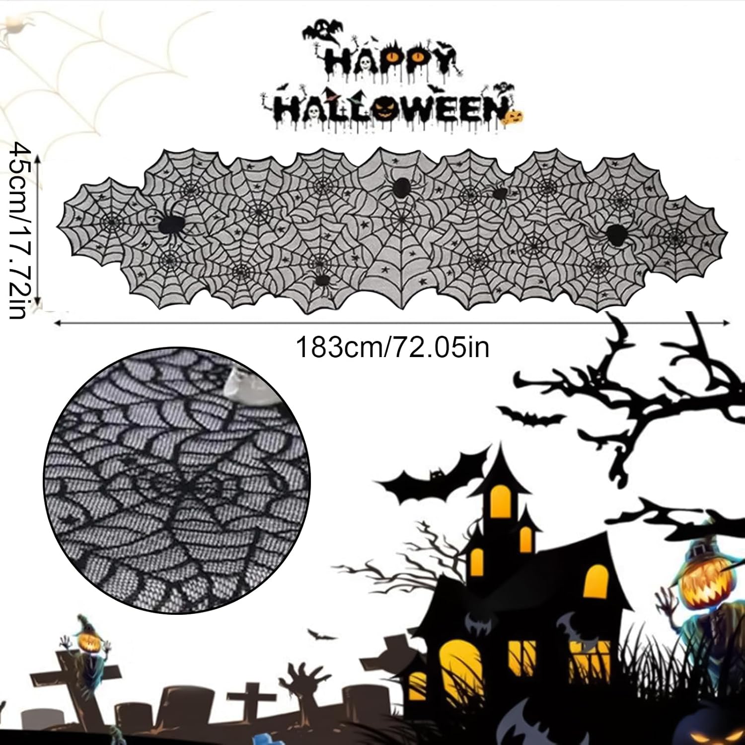 Design classico di Halloween: caratterizzato dal tradizionale pizzo nero decorato con motivi intrecciati e dettagli a ragnatela per migliorare l'atmosfera misteriosa e cerimoniale durante le celebrazioni. Qualità durevole: realizzato in poliestere resistente all'usura, questo runner da tavolo offre scelte di materiali convenienti resistendo agli impigliamenti e mantenendo la sua forma dopo un uso ripetuto, garantendo un'eleganza duratura per le tue decorazioni di Halloween. Spazio dinamico incoraggiato: esplora diverse opzioni di disposizione degli stili che si adattano a diversi. Fornisce compatibilità con le decorazioni della stanza e consente il posizionamento flessibile su tavoli o mensole in diverse scene con facilità e versatilità. Facile da riporre. Dimensioni: progettato per comodità con dimensioni compatte e imballaggio leggero che garantisce un facile trasporto e una conservazione piatta senza compromettere l'usabilità del tuo runner da tavolo di Halloween Installazione semplice: prova l'uso immediato con questo runner da tavolo che fornisce un effetto drappeggio naturale dei bordi migliorando al tempo stesso il fascino visivo del tuo allestimento di Halloween senza sforzo e senza passaggi complicati