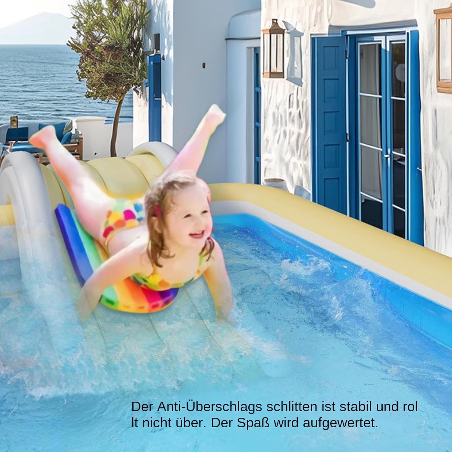 La sicurezza ha la priorità: goditi un tempo di gioco senza preoccupazioni con questo scivolo acquatico gonfiabile stabile e robusto, che utilizza una struttura a tre livelli migliorata e una pellicola estesa da 80 cm + 30 cm per una maggiore protezione di sicurezza. Massima durata: il nostro scivolo gonfiabile è costruito con tre PVC a triplo spessore da 270 g/m². È eccezionalmente forte e non si danneggia facilmente. Fornisce una protezione duratura contro abrasioni e graffi mantenendoti al sicuro e rispettoso dell'ambiente. Divertimento delicato sulla pelle: goditi ore di gioco con il nostro scivolo acquatico gonfiabile, progettato con tecnologia ad acqua morbida a 4 strati per un tocco delicato. Mantieni la pelle delicata dei tuoi bambini coccolata e al sicuro mentre scivolano con beato abbandono. Divertimento senza fine: questo scivolo acquatico gonfiabile per bambini di tutte le età sviluppa l'interazione e l'intrattenimento genitore-figlio. Assicurati un'esperienza di gioco divertente, indipendentemente dal fatto che tu sia all'aperto durante le calde giornate estive o al chiuso per l'eccitazione a bordo piscina. Design salvaspazio: lo scivolo acquatico gonfiabile è perfetto per le famiglie e i piccoli parchi giochi e occupa pochissimo spazio. La funzione pieghevole consente di riporlo facilmente quando non viene utilizzato, rendendolo la scelta ideale per chi desidera divertimento e comodità allo stesso tempo.