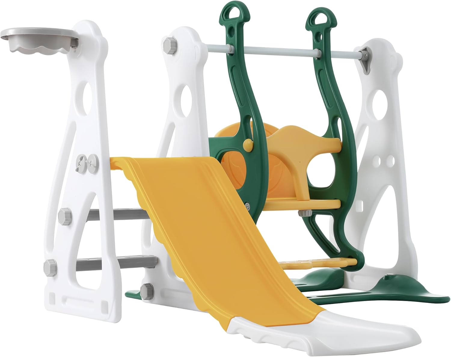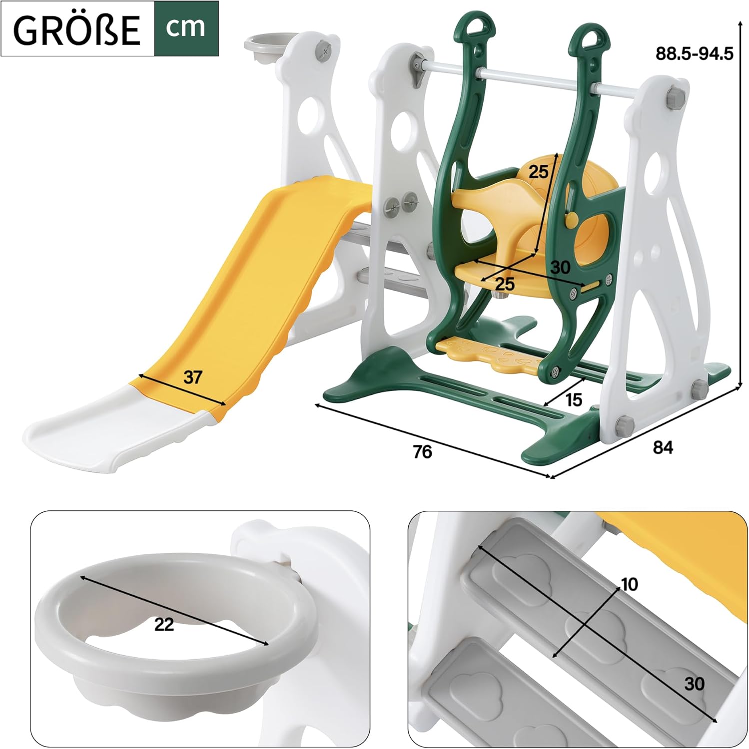 Versatile antiscivolo per bambini 4 in 1: l'avventura definitiva del parco giochi. Questo scivolo non è solo uno scivolo, è un intero mondo di divertimento. Con uno scivolo, un'altalena, una scala e un canestro da basket in uno, i tuoi piccoli non usciranno mai le attività emozionanti. Guardali scivolare, dondolare, arrampicarsi e lanciare canestri da basket - e tutto questo nella sicurezza del tuo giardino. Altalena regolabile in altezza: regalate ai vostri bambini il regalo di alzarsi con il nostro dondolo regolabile in altezza. Sappiamo che i bambini crescono a velocità diverse, ed è per questo che la nostra altalena è stata progettata pensando alla flessPuoi facilmente regolare l'altezza dell'altalena in base alle preferenze e al livello di sviluppo del tuo bambino. La sicurezza è la nostra priorità assoluta: il nostro scivolo per bambini è stato accuratamente realizzato con caratteristiche di design studiate per garantire la sicurezza del vostro bambino. La scala a tre livelli garantisce una salita sicura e lo scivolo allungato offre una discesa regolare e controllata. Puoi stare tranquillo perché sai che i tuoi figli stanno giocando su un dispositivo progettato per il loro benessere. Facile da montare e mantenere: sappiamo che i genitori apprezzano la comodità. Ecco perché il nostro scivolo per bambini è facile da montare e mantenere. Le nostre istruzioni di facile comprensione rendono il montaggio un gioco da ragazzi, in modo che lo scivolo sia pronto all'uso in un batter d'occhio. E la pulizia è un gioco da ragazzi grazie ai materiali resistenti e facili da pulire. Trascorri più tempo con i tuoi figli e meno tempo a costruire e mantenere. Materiale sicuro: la sicurezza del vostro bambino è al primo posto, per questo abbiamo utilizzato solo i materiali più sicuri per la costruzione dei nostri scivoli per bambini. È realizzata con materiali atossici di alta qualità che resistono a ore di gioco senza compromettere la sicurezza. Sii rassicurato sapendo che i tuoi figli stanno giocando su uno scivolo costruito con un occhio sulla loro salute e felicità Servizio: se avete domande sui nostri prodotti, vi preghiamo di contattarci direttamente. Ti aiuteremo sicuramente a risolvere questi problemi.