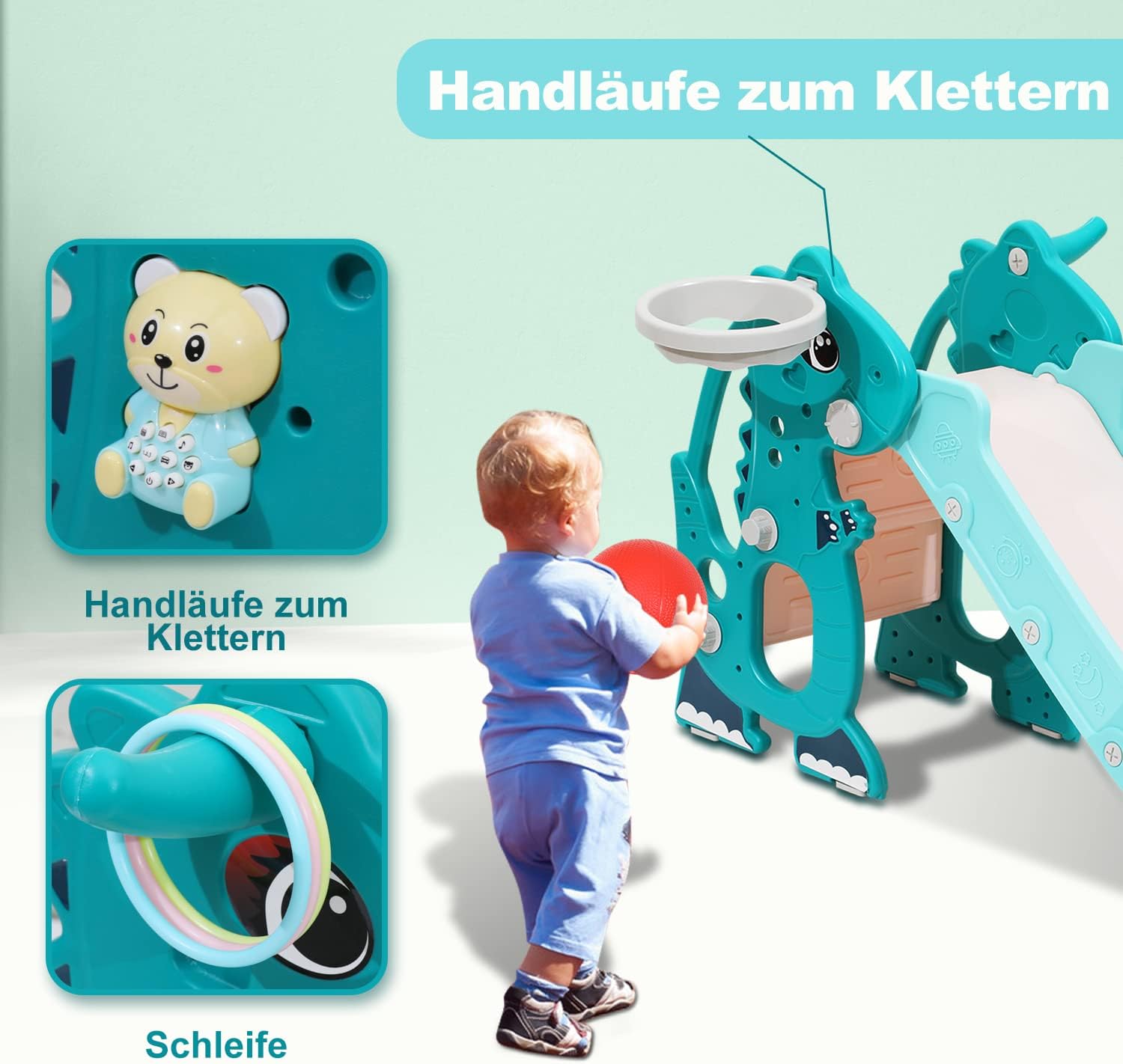 Scivolo 4 in 1 per bambini autoportante: questo scivolo per bambini non solo offre divertimento durante lo scivolo, ma anche un canestro da basket, lazo e una macchina per l'apprendimento precoce inglese. Il giardino diventa quindi un parco giochi avventura! ✿ Sicuro e non tossico: lo scivolo è realizzato in materiale HDPE ecologico, non tossico e innocuo. Angoli arrotondati e bordi lisci per una maggiore sicurezza. ✿ Design intelligente: lo scivolo da giardino dispone di un fissaggio in gomma antiscivolo nella parte inferiore per aumentare la stabilità e prevenire lo scivolamento o il ribaltamento durante il gioco. La scala da arrampicata ha una trama profonda per evitare scivolamenti. Una protezione a forma di T sull'altalena garantisce una maggiore sicurezza. ✿ Sport alternativi con la palla: con il canestro da basket e il design ad anello, il bambino può migliorare la coordinazione occhio-mano e divertirsi allo stesso tempo. Ideale per interni ed esterni ✿ Facile da montare e pulire: lo scivolo per bambini è facile da montare senza attrezzi e la superficie liscia è facile da pulire. Il carrello per giocattoli è pieghevole e può essere riposto nell'angolo quando non in uso.