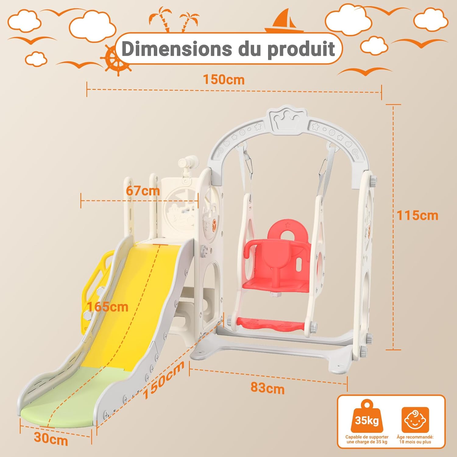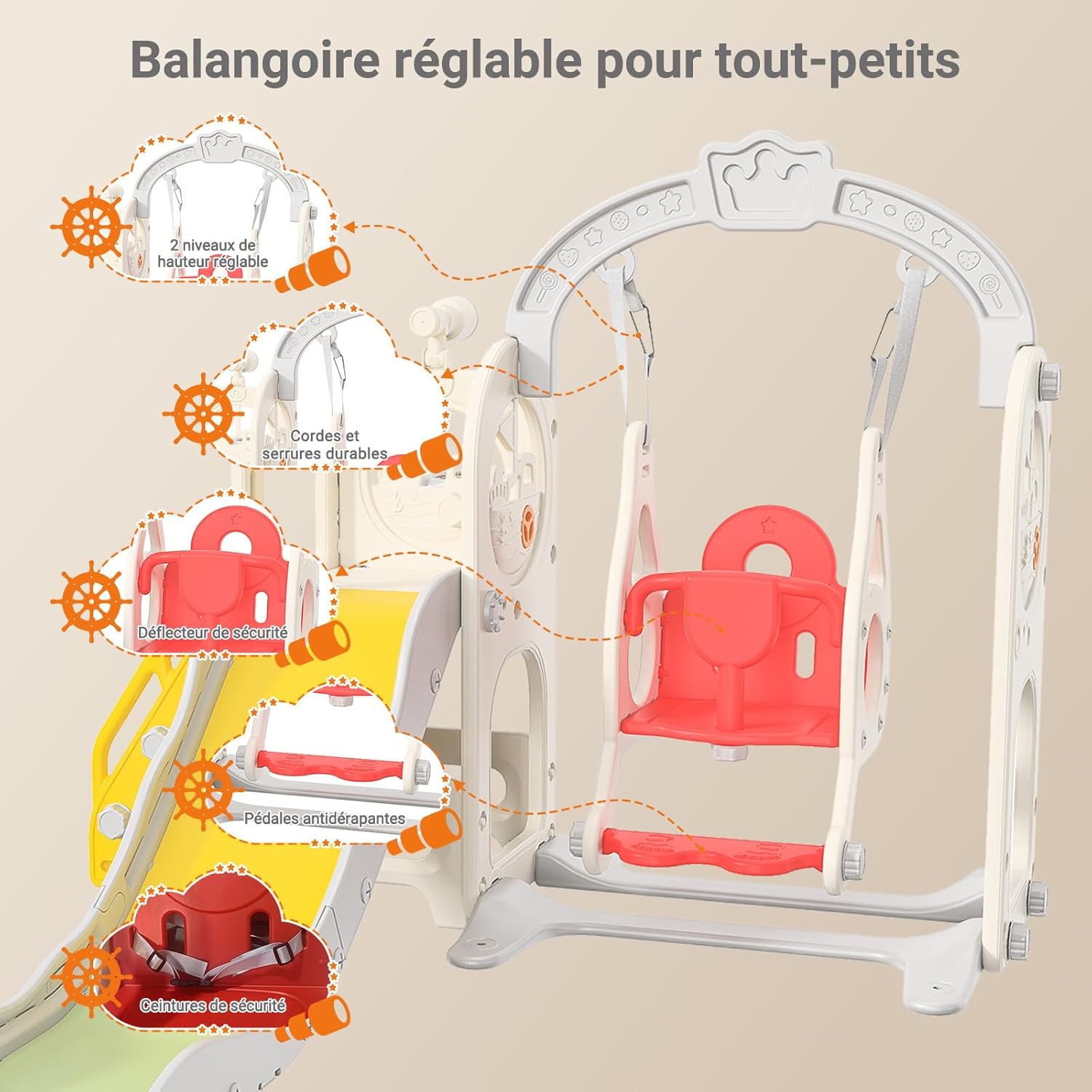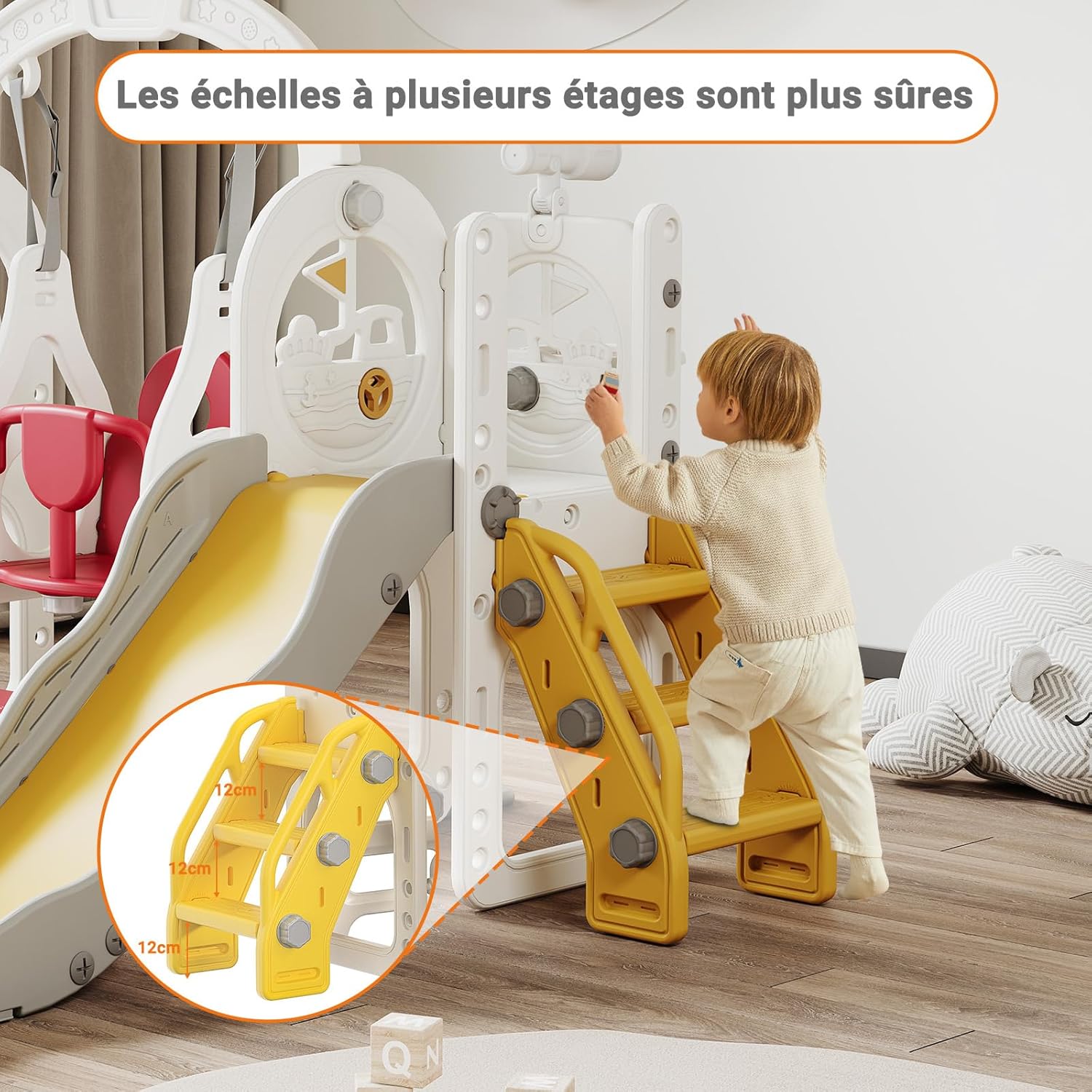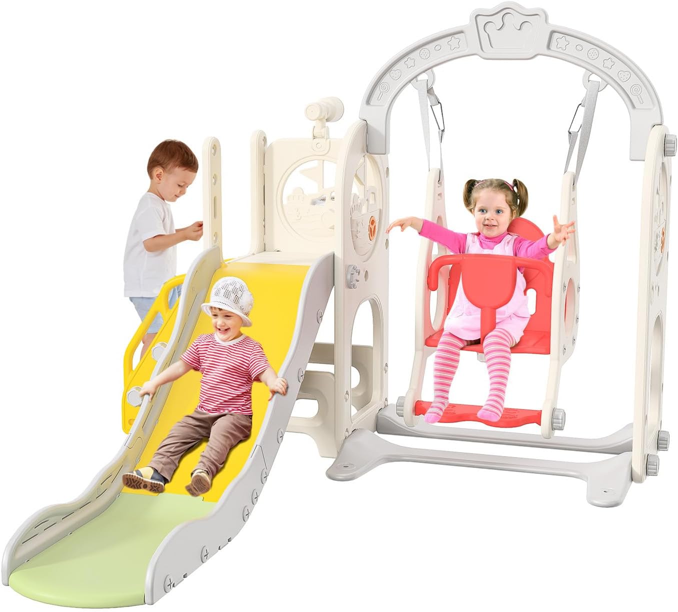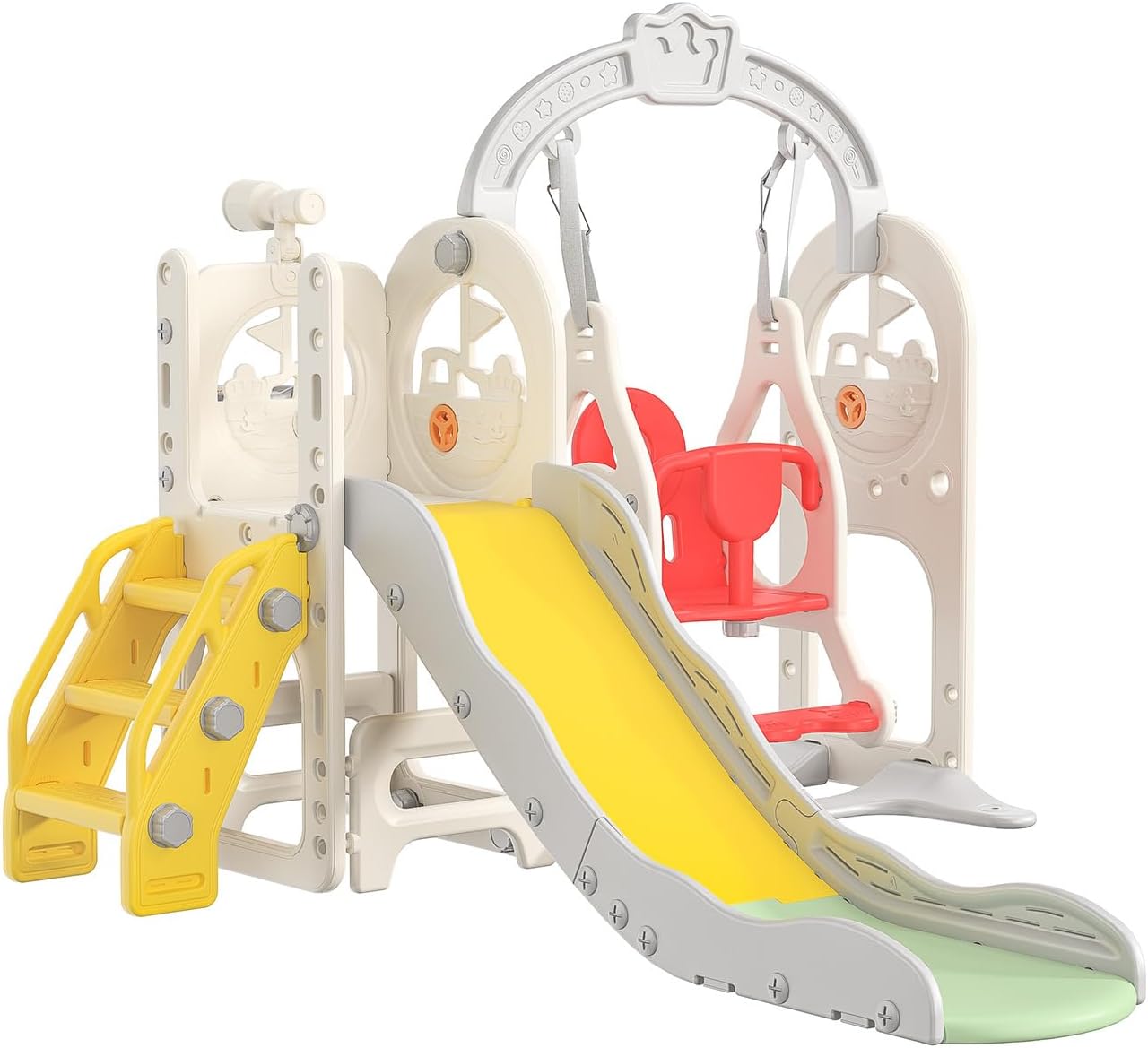 【Scivolo interno/esterno/giardino】Che si tratti di uno scivolo per bambini, uno scivolo per bambini o uno scivolo da giardino, i nostri scivoli per bambini accompagneranno i tuoi bambini. Lasciate libero sfogo alla loro immaginazione, arrampicate, scorri e goditi un divertimento infinito in un ambiente sicuro e piacevole. 【Tutto in uno】Questo scivolo multifunzionale per bambini comprende diverse aree di attività: portico, scivolo, cestino da basket, telescopio e tunnel strisciante. Progettato per essere stimolante e stimolante, il nostro scivolo per bambini è ideale per sviluppare abilità fisiche, cognitive e sociali in un ambiente sicuro e divertente. 【Scivolo sei in uno】Questo scivolo per bambini è dotato di altalena, scivolo, scala da arrampicata, cestino da basket, telescopio e spazio di archiviazione. Offri ai tuoi bambini avventure divertenti ed emozionanti e sviluppa le loro capacità motorie, equilibrio e creatività! 【Scivolo di sicurezza esteso】Il nostro scivolo è dotato di un ampio cuscinetto sul fondo per una maggiore sicurezza. Le ringhiere laterali rialzate su entrambi i lati garantiscono ai bambini un'esperienza di velocità e brividi in modo sicuro. Facile da montare: il nostro set include tutti gli strumenti necessari e istruzioni di montaggio dettagliate. Per qualsiasi domanda, non esitate a contattarci! Questo scivolo per bambini è facile da spostare ed è adatto per uso interno ed esterno. Suggerimenti di sicurezza: le guide della diapositiva devono essere serrate durante il montaggio e si prega di verificare che le viti non siano allentate durante l'uso.