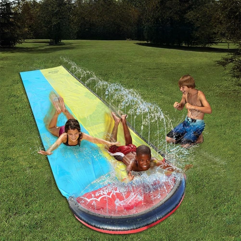 【Incluso】 Questo doppio scivolo d'acqua include uno scivolo da 480 x 145 cm, 2 tavole gonfiabili, 2 picchetti di fissaggio, irrigatori integrati e una piscina per bambini all'estremità. È un ottimo giocattolo estivo. 【Doppio scivolo】 Scivolo d'acqua con un design a due tracce, permettendo a due bambini di giocare contemporaneamente, riducendo così il tempo di attesa e permettendo loro di divertirsi sullo scivolo acquatico. Materiale: questo scivolo d'acqua è realizzato in PVC spesso di alta qualità, durevole, con una superficie liscia e piacevole per la pelle dei vostri bambini. Evitare spine, pietre affilate, ecc., per evitare lesioni. 【Installazione facile】La pista d'acqua da giardino per bambini si apre rapidamente, fissa il bordo dello scivolo e si collega a un tubo da giardino, in modo che possa essere completamente gonfiata prima che lo scivolo inizi a schizzare l'acqua e scivoli sulla tavola. 【Divertimento del giardino estivo】 Lo scivolo d'acqua è dotato di fori di irrigazione su tre lati, un'eccellente copertura dell'acqua, garantendo la massima umidità e scivolamento veloce, portando ore di divertimento alla tua famiglia e ai tuoi bambini nelle calde giornate estive!