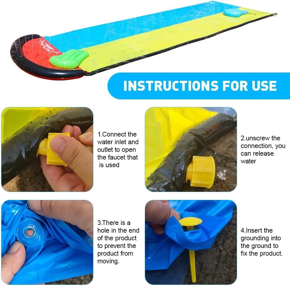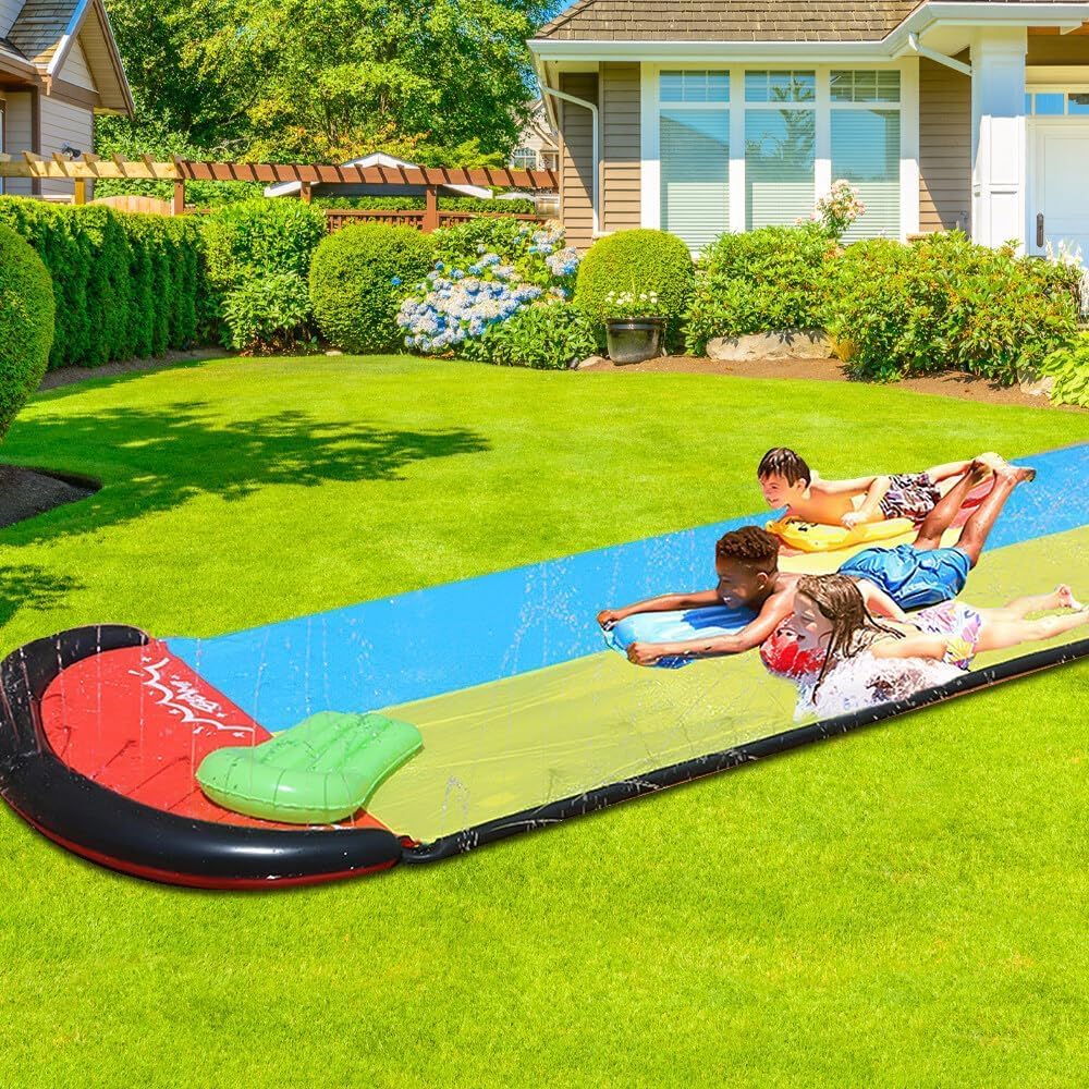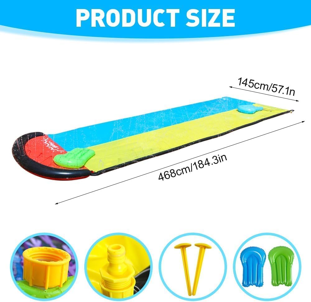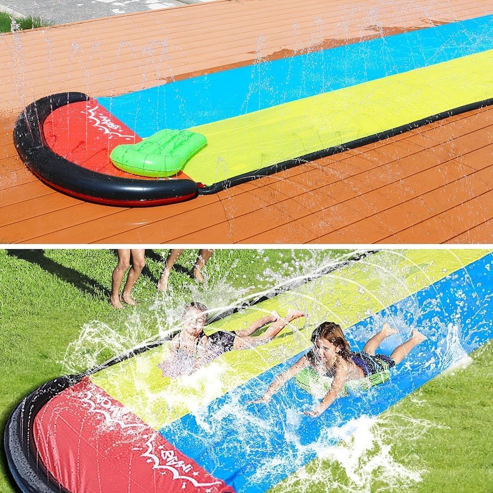 【Scivolo acquatico con piscina per tuffi】 Il nostro scivolo acquatico a doppia onda (468 x 145 cm) offre il doppio del divertimento con una piscina per tuffi integrata, irrigatori al centro e 2 tavole gonfiabili. Include 6 picchetti per la stabilità. Consigliato per il miglior effetto spray: flusso d'acqua 16 L/min. 【Superficie in PVC ultra liscia per un divertimento scorrevole rapido】 Lo speciale materiale antiscivolo garantisce uno scorrimento super veloce. Il sistema di irrigazione integrato mantiene la superficie perfettamente bagnata per un divertimento alla massima velocità: ideale per le corse o le avventure in solitaria! 【Colori vivaci e facilità di montaggio】 I colori vivaci rendono ogni giardino un punto culminante. Si installa in pochi minuti: srotola, fissa, collega al tubo da giardino (non è necessaria la pompa) e imposta l'irrigatore. Divertimento acquatico istantaneo! 【Divertimento per tutta l'estate】 Perfetto per feste di compleanno, feste in giardino o per rinfrescarsi. La piscina per bambini integrata all'estremità rende ogni scivolo perfetto. PVC di alta qualità per ore di divertimento. 【Garanzia di soddisfazione Joyin】 La tua soddisfazione è il nostro obiettivo. In caso di domande, contattaci tramite Amazon. Sicurezza testata per bambini dai 3 anni in su (si consiglia la supervisione di un adulto).