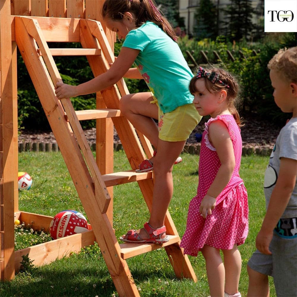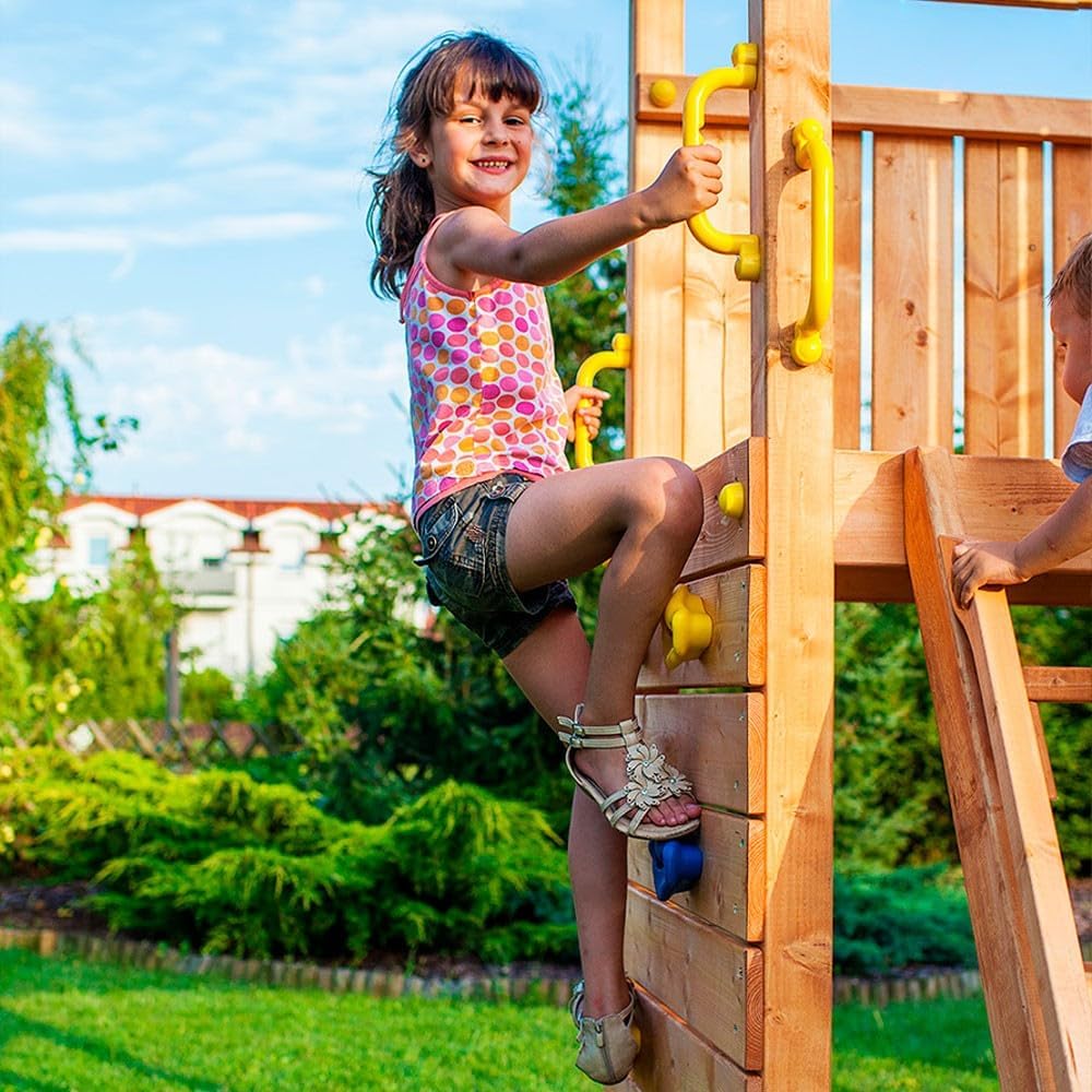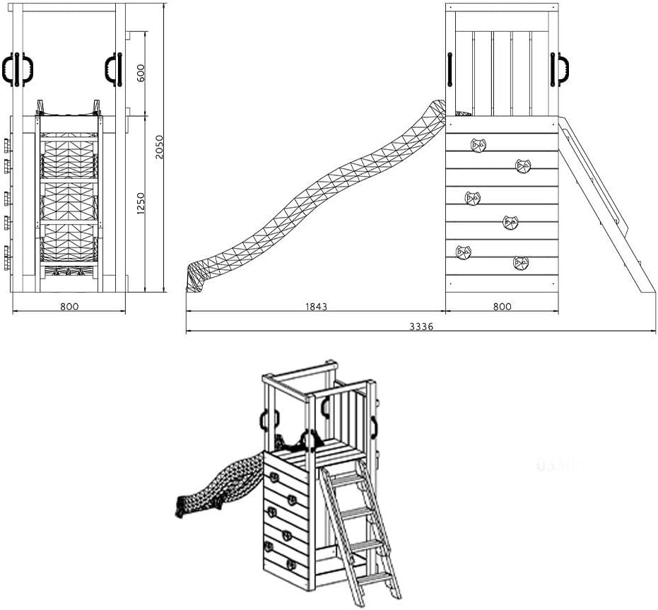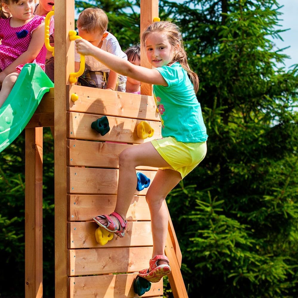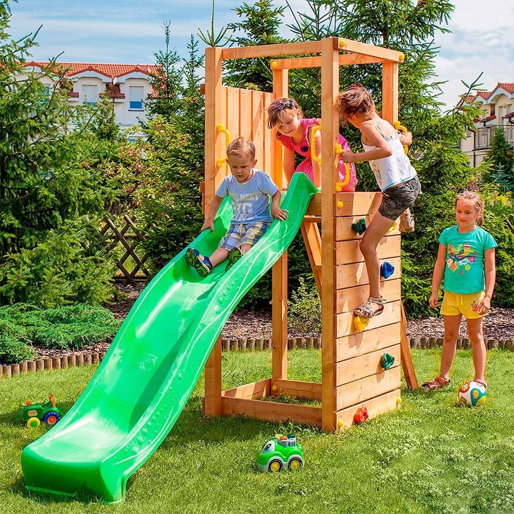 Parco giochi salvaspazio con torretta, scivolo e arrampicata. Perfetto per giardini di piccole dimensioni, unisce gioco attivo e fantasia. Scivolo da 2,2 metri incluso per discese emozionanti. La lunghezza ideale per bambini dai 3 ai 10 anni, in totale sicurezza. Struttura robusta in legno trattato color teak. Resiste a sole, pioggia e umidità: adatto all’uso in esterno tutto l’anno. Sistema di montaggio stabile con ancore e giunti metallici. Studiato per garantire sicurezza e stabilità durante ogni attività. Montaggio semplice con istruzioni dettagliate incluse. Completamente attrezzato, si installa facilmente anche in autonomia.