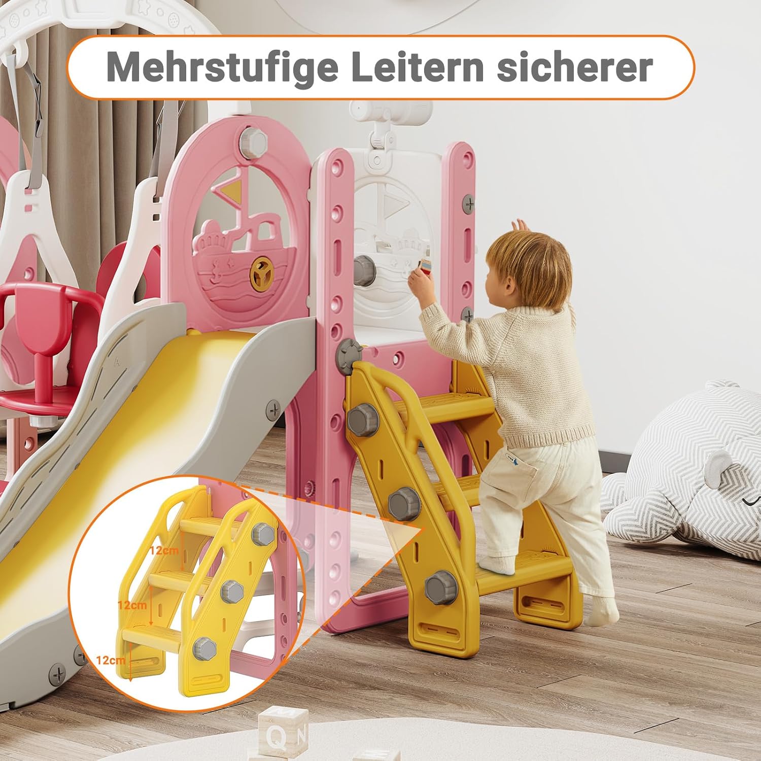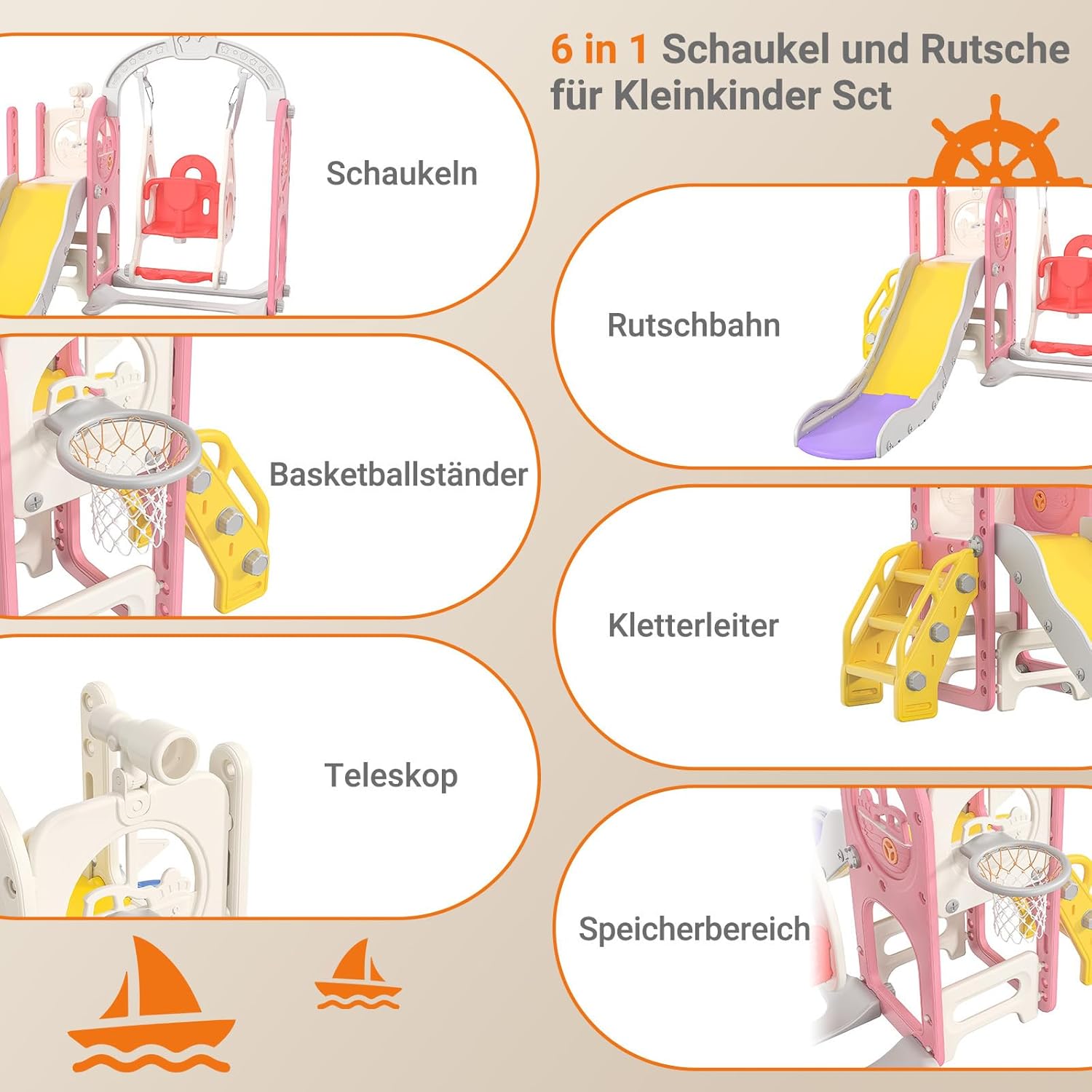 6 in 1 Squadra di gioco: includono struttura di arrampicata, scivolo, altalena, telescopio, canestro da basket e stoccaggio. Fornisce molteplici forme di intrattenimento, garantendo divertimento senza fine per i più piccoli. Sicuro per bambini: lo scivolo include aree di attesa, accelerazione e decelerazione; altalena con capacità di carico di 35 kg e altezza regolabile; i gradini sono testurizzati e antiscivolo. Parco giochi colorato: il castello ha la forma di un coniglio dei cartoni animati/nave pirata, con colori vivaci e vivaci, pieno di divertimento per bambini, perfetto per l'area giochi per bambini. Materiali durevoli: realizzato in HDPE spesso e di alta qualità, con una superficie liscia priva di sbavature e altri bordi ruvidi. I nostri scivoli offrono ai bambini un'esperienza di gioco perfetta. Facile da montare: viene fornito con istruzioni chiare per l'uso, in modo da poter completare facilmente il montaggio. Design modulare, facile da smontare e spostare, tutti i componenti possono essere facilmente smontati e rimontati.