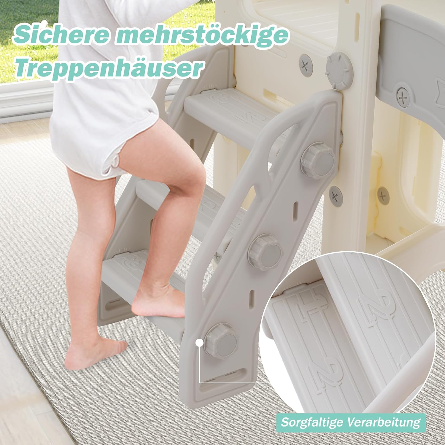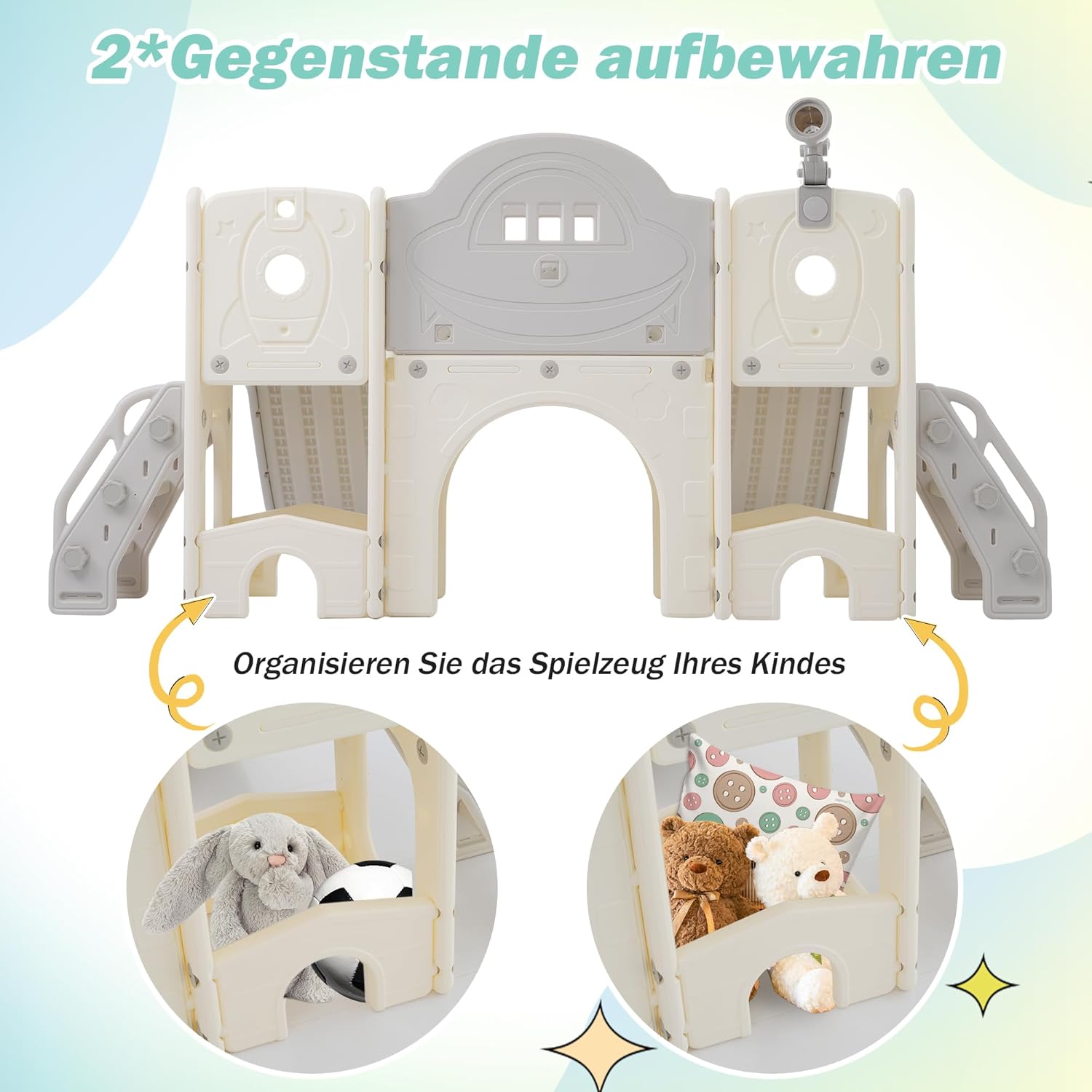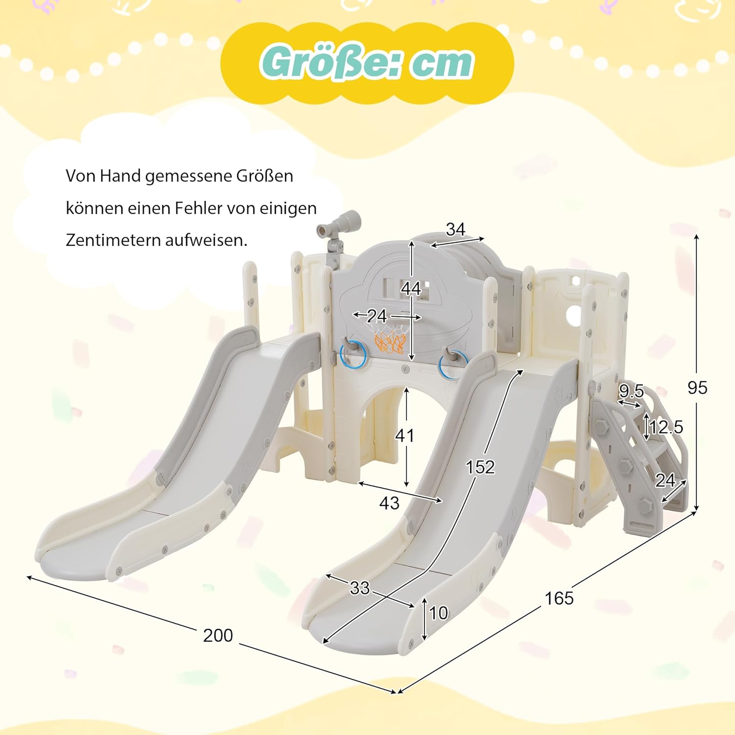 1.8 in 1 il parco giochi definitivo per bambini! Con due emozionanti scivoli, una scala da arrampicata, una piattaforma spaziosa, un emozionante gioco lazo, armadi di stoccaggio, binocolo e persino un canestro da basket, il divertimento non ha fine. E i fori garantiscono una maggiore creatività e gioia da esplorare. 2. Doppio piacere con due scivoli. Perché accontentarsi di uno scivolo quando si può averne due? Con il nostro set di scivoli, più bambini possono scivolare contemporaneamente, raddoppiando il divertimento e la tensione. Guarda le risate dei bambini quando scivolano fianco a fianco e creano ricordi indimenticabili. Con due diapositive, non sarà mai noioso a casa. Preparati a prolungare il tuo tempo di gioco con il nostro set di scivoli doppi! 3. La sicurezza prima di tutto: progettata per la pace della mente. Sappiamo che nei dispositivi di gioco per bambini la sicurezza è al primo posto. Ecco perché i nostri scivoli hanno un design delicato e sicuro con scivoli più lunghi, zone cuscinetto più grandi e corrimano rialzati. Queste caratteristiche ben studiate garantiscono una maggiore stabilità e sostegno, in modo che i vostri piccoli possano scivolare senza paura. Rilassatevi sapendo che i vostri bambini con il nostro set di scivoli orientato alla sicurezza in una sicurezza 4. Sicurezza grazie ai materiali certificati. La fiducia è importante quando si tratta di materiali per giocattoli per bambini. Ecco perché il nostro kit di scorrimento è realizzato con materiali atossici certificati EN71, che garantiscono i più alti standard di sicurezza per la tua famiglia. Puoi stare tranquillo perché sai che i tuoi bambini giocano con materiali sicuri e durevoli. 5. Facile installazione e manutenzione. Sappiamo quanto sia importante il comfort per i genitori impegnati. Ecco perché i nostri scivoli sono progettati per essere facili da montare e pulire, in modo da dover passare meno tempo a montare e avere più tempo per divertirsi con la famiglia. Grazie alla semplice guida e alla manutenzione senza problemi, non è mai stato così facile installare e mantenere il tuo scivolo.