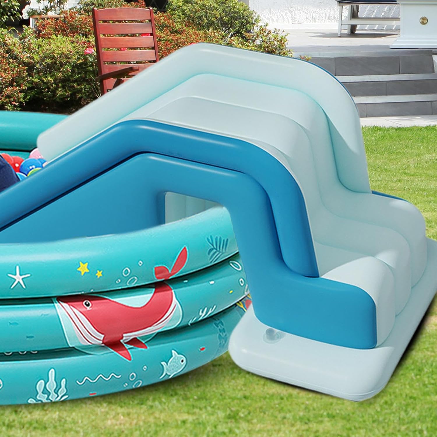 Look dinamico: la tavolozza di colori vivaci con motivo a onde aumenta l'intrattenimento interattivo e crea esperienze genitori-figli indimenticabili quando giocano all'aperto. Svuotamento e trasporto rapidi: grazie al design pieghevole e alla funzione di svuotamento rapido, lo scivolo del castello gonfiabile può essere riposto nella borsa per il trasporto per risparmiare spazio. Ciò consente un facile trasporto e stoccaggio, ideale per un rapido montaggio e smontaggio. Sistema idrico integrato: questa versatile struttura di gioco collega facilmente gli spazi interni ed esterni. L'elemento acqua integrato crea varie esperienze di gioco per un'ampia varietà di scopi. Materiale robusto: Lo speciale PVC multistrato con un avanzato sistema di distribuzione della pressione conferisce allo scivolo gonfiabile la massima stabilità e antinfortunistica ad ogni utilizzo. Comoda protezione dei bordi: i bordi precisi e senza sbavature e la finitura liscia a 360 gradi garantiscono una sensazione morbida - protegge anche la pelle estremamente delicata dei bambini attraverso una sicurezza ben studiata