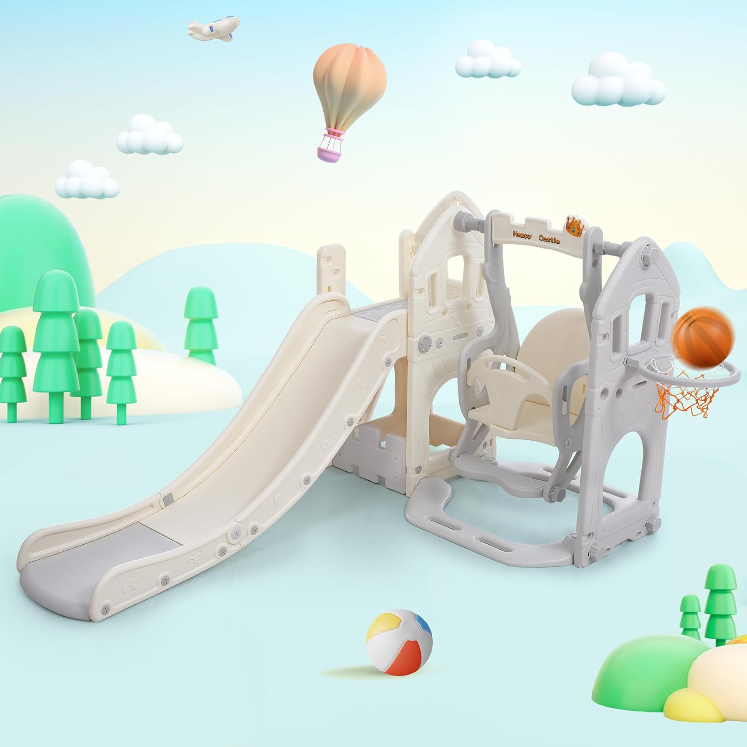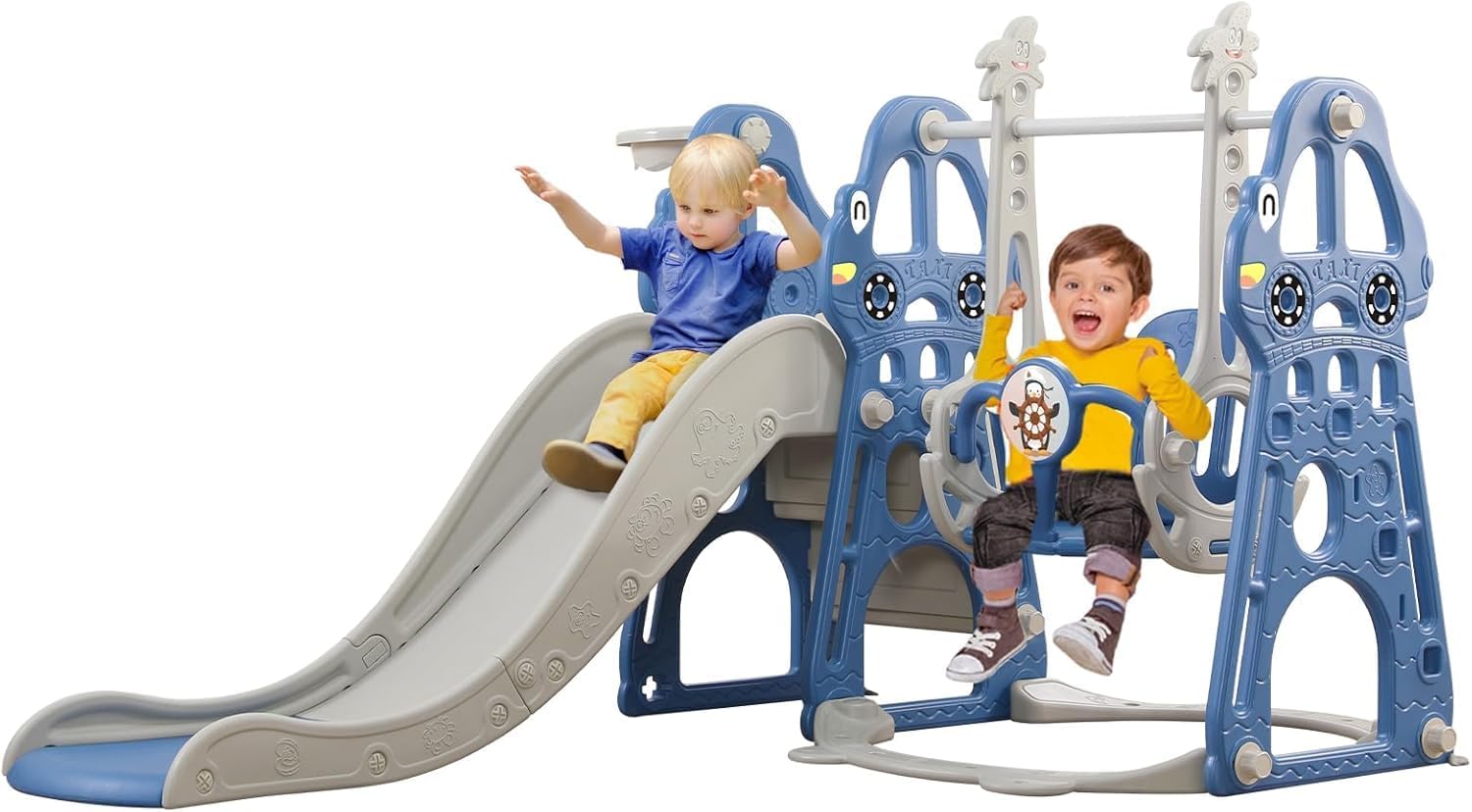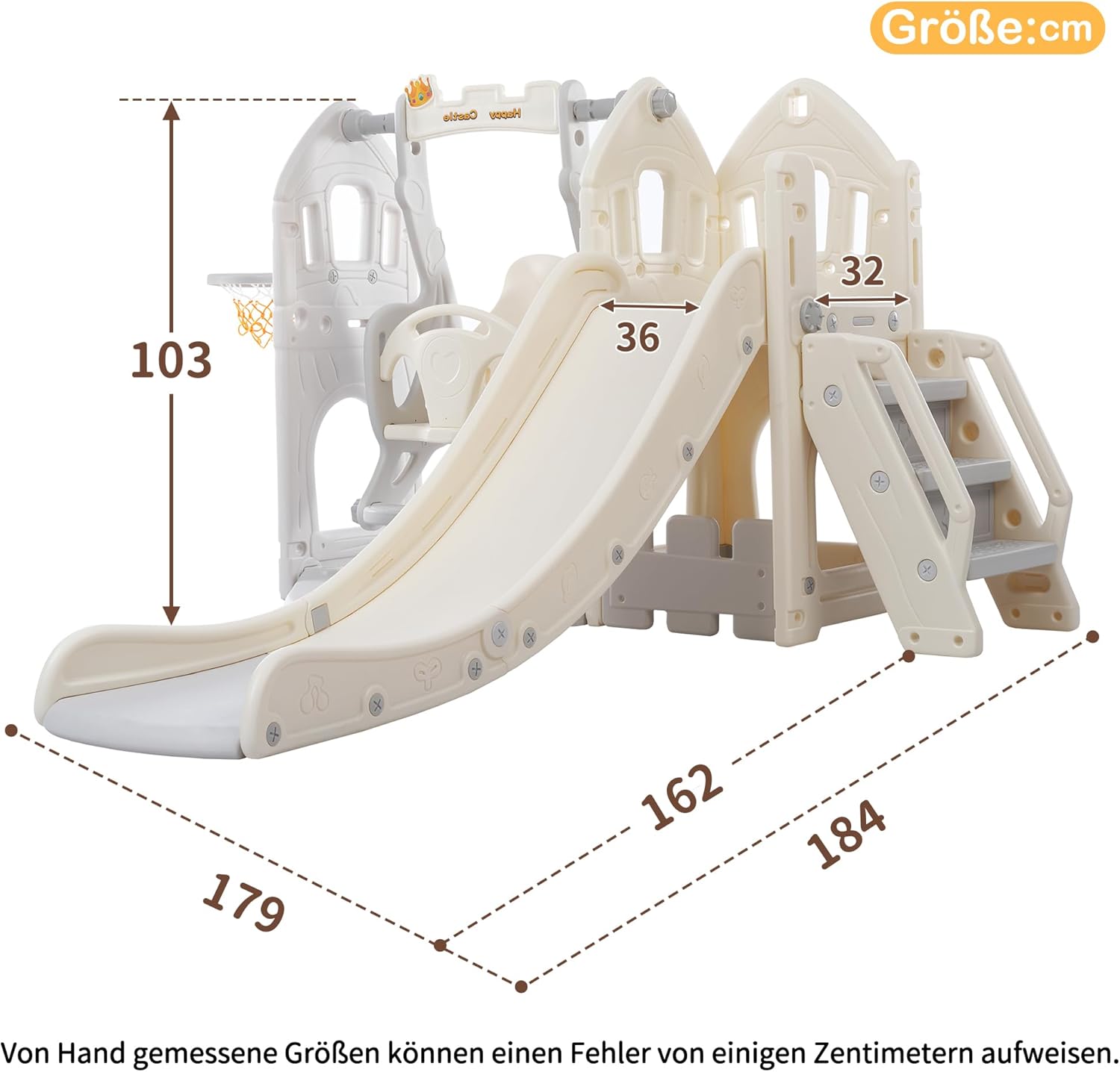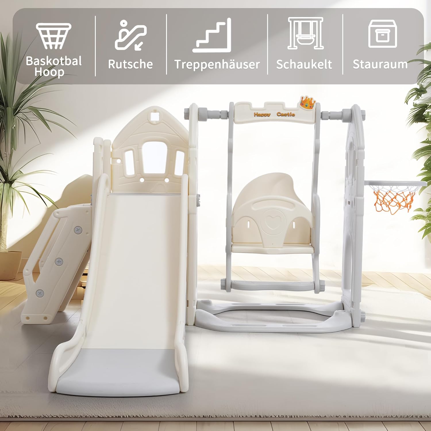 Scivolo per bambini 5 in 1: scivolo, altalena, scale, canestro da basket e armadietti: scopri l'ultimo scivolo per bambini che offre più di un semplice divertimento. Questo scivolo per bambini 5 in 1 porta varietà e gioia ai tuoi bambini. Con scivolo, altalena, scale, canestro da basket e un pratico armadietto in uno, offre intrattenimento senza fine e favorisce l'attività fisica. Nuove forme e motivi: il nostro scivolo per bambini convince con il suo design unico con nuove forme e motivi. I tuoi bambini adoreranno i colori allegri e il design innovativo. Non è solo un giocattolo, ma anche un richiamo visivo nel tuo giardino o nella cameretta dei bambini. Design sicuro e ben congegnato: la sicurezza di tuo figlio è la nostra massima priorità. Questo scivolo ha tre gradini stabili e un'area imbottita sullo scivolo per evitare incidenti. Il design ben studiato assicura che il bambino sia protetto divertendosi. Facile da installare e pulire: questo scivolo per bambini è facile da montare. Tutte le parti e le istruzioni necessarie sono incluse nella confezione. È facile da montare ed è altrettanto facile da pulire. In questo modo potrai concentrarti sullo stare con i tuoi figli. Materiali sicuri: per questo scivolo per bambini utilizziamo solo materiali sicuri e di alta qualità. È robusto e durevole, in modo che i tuoi bambini lo apprezzino a lungo senza doverti preoccupare per loro.
