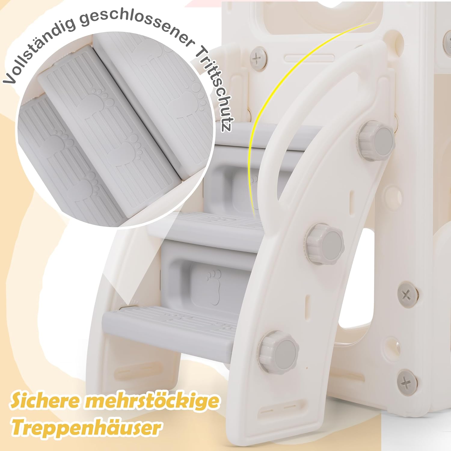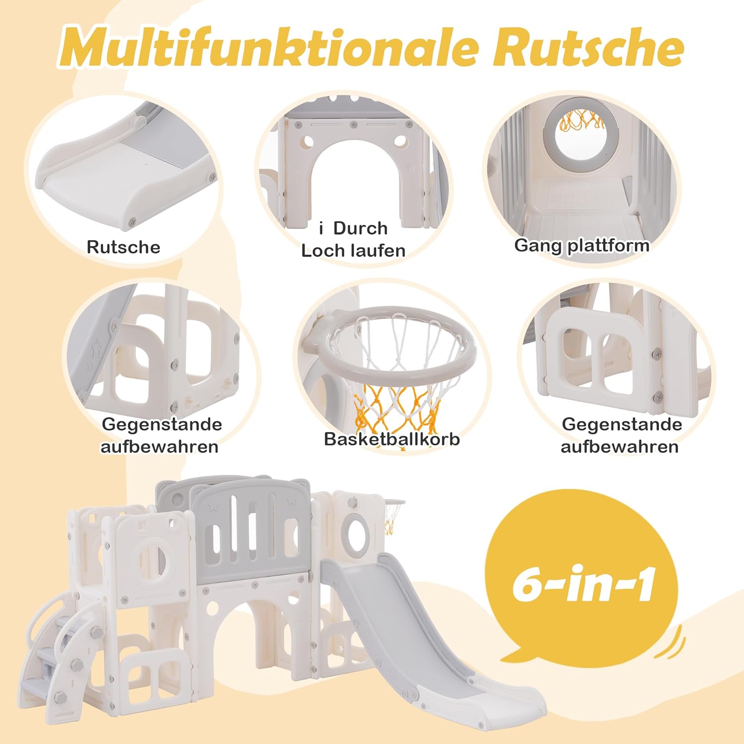 Centro di gioco multifunzionale: questo scivolo 6 in 1 per bambini combina scivoli, arrampicata, giochi di basket, giochi creativi a tunnel e soluzioni di archiviazione in un unico dispositivo. Due piattaforme consentono giochi variegati su più livelli e stimolano l'immaginazione e l'attività fisica dei bambini. Un dispositivo di gioco all-in-one ideale per sale giochi o interni. Sicurezza grazie alla certificazione EN71: l'intera struttura è conforme ai requisiti di sicurezza europei secondo la norma EN71. La scala chiusa con ampie pedane offre una presa stabile, mentre i bordi arrotondati e il design morbido antiscivolo riducono al minimo i rischi di lesioni e danno sicurezza e fiducia ai genitori. Combinazione di gioco salvaspazio: il design compatto misura 174 × 150 × 95 cm e combina sei aree di gioco senza inutili sprechi di spazio. I bambini sperimentano il massimo divertimento su una superficie minima: ideale per la cameretta dei bambini o le sale giochi al chiuso senza lasciare ingombrare lo spazio abitativo. Struttura stabile e elevata capacità di carico: realizzato in polietilene ad alta densità, lo scivolo ha una portata massima di 40 kg. La costruzione robusta di alta qualità garantisce un divertimento duraturo con più bambini contemporaneamente e supporta il gioco attivo, l'arrampicata e lo scivolamento nella vita di tutti i giorni. Giochi creativi di perforazione e arrampicata: le aperture e i tunnel integrati invitano i bambini a gattonare, nascondersi e giocare. L'apertura del foro funge da elemento di movimento emozionante che stimola la curiosità e la creatività, un vero paradiso avventura per i piccoli esploratori. Esperienza di gioco con canestro da basket integrato: il canestro da basket montato lateralmente porta slancio sportivo nella vita di tutti i giorni. I bambini possono praticare la loro precisione di destinazione pur rimanendo fisicamente attivi. Un extra ideale per un movimento giocoso in casa. Due ampi scomparti: gli scomparti inferiori offrono spazio per riporre i giocattoli e tenere in ordine la cameretta dei bambini. La struttura aperta consente un rapido accesso ai giocattoli e favorisce la pulizia autonoma dei bambini.