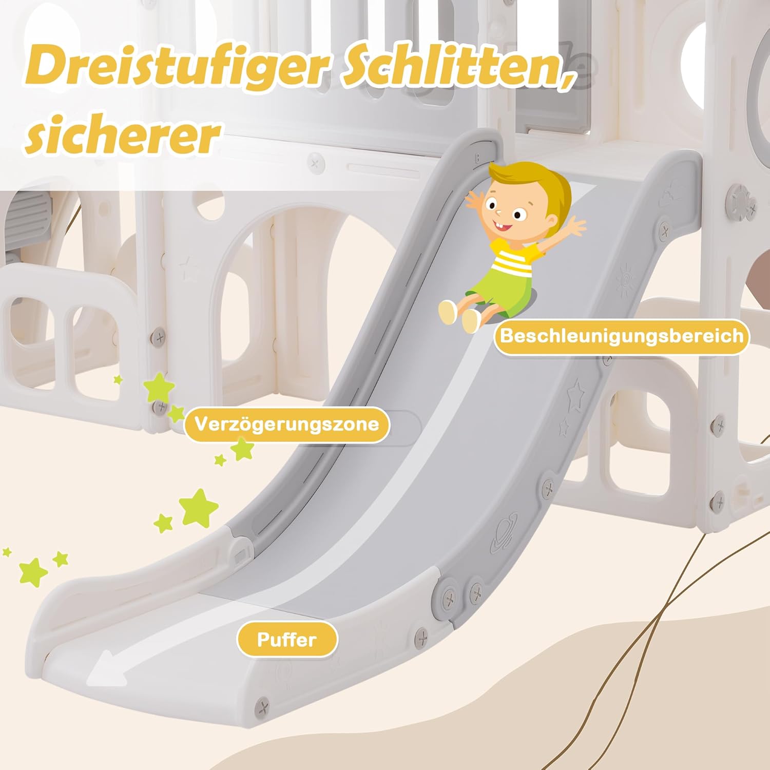 Possibilità di gioco 6 in 1 per avventure illimitate: questo impressionante scivolo per bambini unisce sei emozionanti attività di gioco in un design compatto. Include uno scivolo divertente, un canestro da basket, una scala accessibile, due pratici scomparti per il pavimento per riporre e due piattaforme di ingresso. Un gioco di foratura integrato garantisce una maggiore varietà e favorisce la creatività dei più piccoli. Design accattivante e molteplici applicazioni: con il suo splendido design e la colorazione accattivante, questo scivolo conquista il cuore di tutti i bambini. Non è solo un punto forte in ogni cameretta come scivolo per interni, ma è anche ideale come scivolo da giardino per esterni, offrendo la massima flessibilità per il gioco e il divertimento. Sicurezza testata e materiali resistenti: la sicurezza dei tuoi bambini è la massima priorità. Il nostro scivolo per bambini è certificato EN71, che conferma la conformità ai più severi requisiti di sicurezza. Realizzato in polietilene ad alta densità (HDPE), garantisce stabilità, durata e un'esperienza di gioco allegra per i più piccoli. Facile da montare, pulire e mobilità senza sforzo: grazie al suo peso ridotto, questo scivolo è facile da montare e altrettanto facile da pulire. La mobilità senza sforzo consente di regolare in modo flessibile l'area di gioco e di spostare il divertimento facilmente dall'interno all'esterno e viceversa. Promuove lo sviluppo e il tempo condiviso genitore-figlio: questo scivolo è più di un semplice dispositivo di gioco, favorisce lo sviluppo fisico, la coordinazione e la creatività dei bambini. Allo stesso tempo, crea un'opportunità perfetta per genitori e figli di vivere insieme momenti indimenticabili pieni di gioia e avventura.