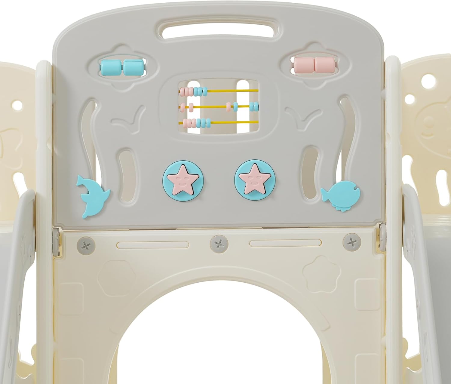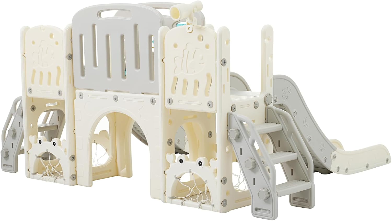 Parco giochi per bambini 8 in 1: scivolo per i più piccoli, questo set di scivoli con motivi marini convince per il suo aspetto squisito e meraviglioso, offre un sacco di divertimento infantile ed è molto popolare tra i bambini, include due scivoli, un passaggio, un telescopio, un abaco, un pulsante sonoro, un interessante giocattolo da pesca in mare, una piccola porta da calcio e due componenti da arrampicata, gli otto componenti funzionali sono integrati in un corpo di scivolo. e offrire ai bambini e agli amici Divertimento Materiale sicuro: scivolo per interni, il materiale di scorrimento è realizzato in polietilene ad alta densità certificato (HDPE), che è assolutamente atossico e adatto ai bambini, i bambini non solo sperimentano un divertimento emozionante scivolare, ma possono anche stimolare la loro immaginazione e diventare audaci ricercatori marini. Design di protezione pensato: scivolo per bambini indoor, la struttura stabile e sicura di questo scivolo combinato è stata accuratamente sviluppata, i componenti per l'arrampicata dispongono di corrimano facili da usare e gradini chiusi, che sono più sicuri e ragionevolmente alti, il design antiscivolo della superficie del gradino impedisce efficacemente lo scivolamento dei bambini. Scivolo sicuro: lo scivolo ha un'area di attesa aggiuntiva e un corrimano rialzato per evitare che il bambino scivoli lateralmente, lo scivolo è progettato in modo confortevole e dispone di una zona di accelerazione, un'area di scorrimento e una zona cuscinetto che protegge efficacemente il bambino da lesioni, inoltre, la parte inferiore dello scivolo per bambini offre un ampio spazio per riporre i giocattoli per bambini. Facile da installare: lo scivolo per bambini viene fornito con istruzioni dettagliate e accessori passo-passo, possono completare rapidamente l'installazione e lasciare che i bambini godano del divertimento che lo scivolo porta, queste attività aiuteranno i tuoi bambini a sviluppare meglio le loro capacità fisiche e mentali.