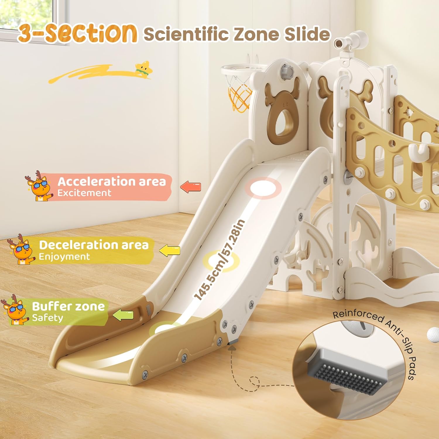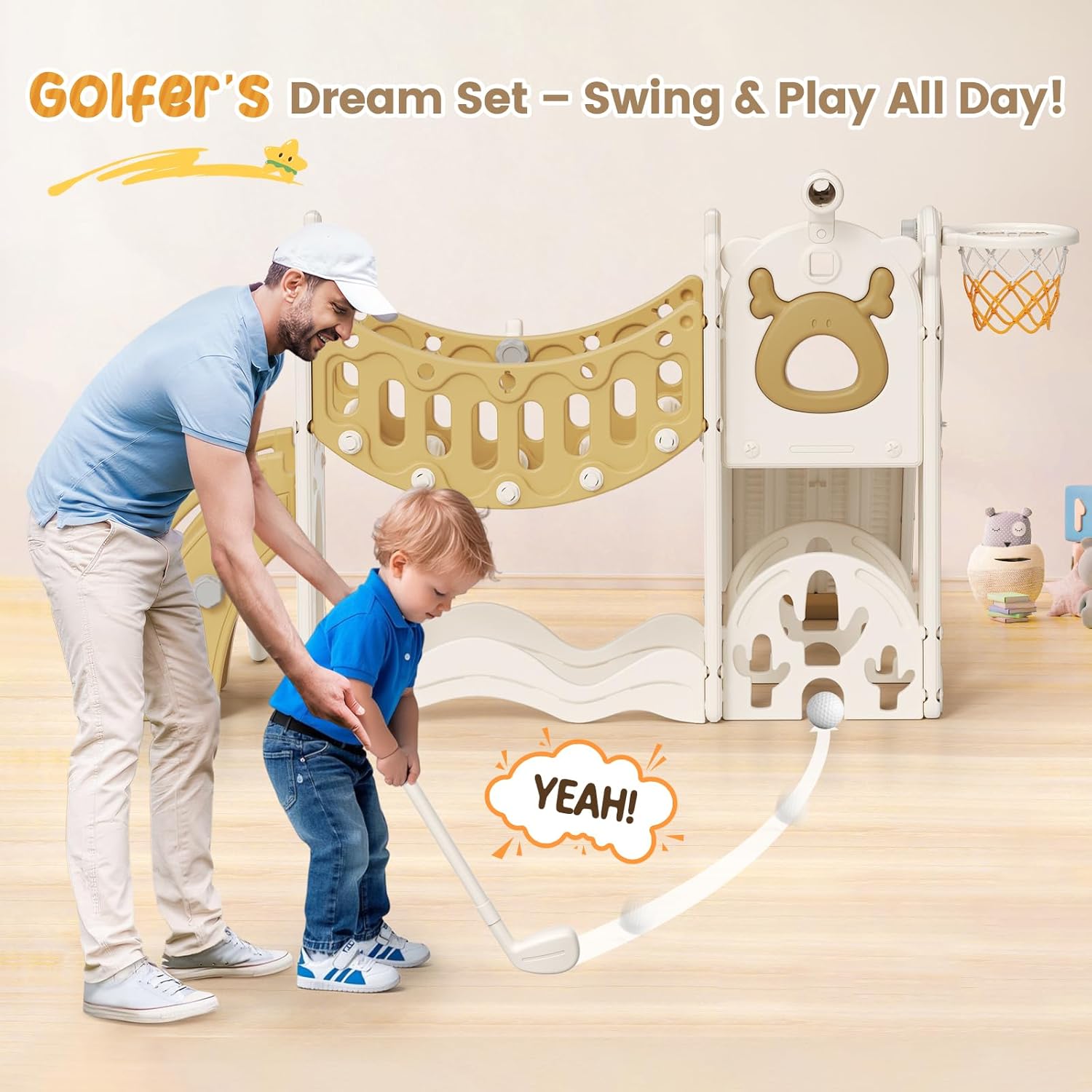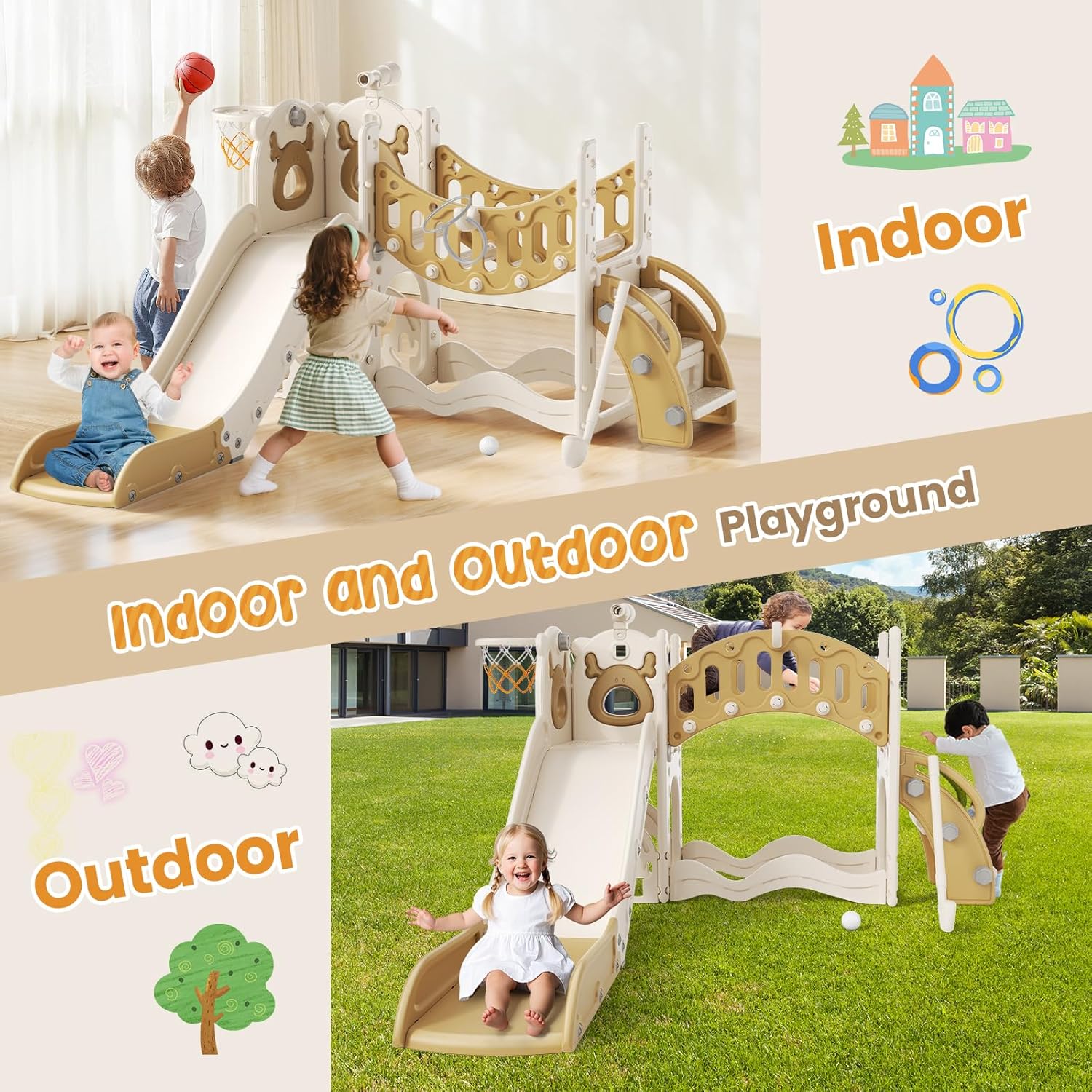 Versatilità 8 in 1: lo scivolo per bambini offre 8 funzioni di gioco interattive tra cui uno scivolo per bambini, un ponte da arrampicata, un lancio dell'anello, un canestro da basket, un telescopio, una scala, un set da golf e uno spazio di archiviazione, promuovendo il gioco attivo e lo sviluppo generale per i più piccoli. Ponte da arrampicata migliorato: progettato per migliorare la coordinazione, l'equilibrio e lo sviluppo muscolare del bambino, questo versatile ponte da arrampicata può essere installato in entrambi i modi, verticale o capovolto, per raddoppiare il divertimento e più modi di giocare. Una zona di avventura perfetta per i piccoli esploratori! Materiali HDPE sicuri e durevoli: realizzato con materiali HDPE di alta qualità, questo set di scivoli per bambini garantisce sicurezza e durata durante il gioco, consentendo ai bambini di godersi le loro avventure in tranquillità. Design sicuro: ogni elemento del set dà la priorità alla sicurezza, caratterizzato da uno scivolo con cuscinetti antiscivolo, gradini di arrampicata completamente chiusi e robusti corrimano sia sullo scivolo che sulle scale, garantendo un ambiente di gioco sicuro per i bambini. Facile installazione: il set di guide è progettato per un facile montaggio, consentendo a genitori e bambini di collaborare alla configurazione. È adatto sia per giochi interni che esterni, rendendolo l'aggiunta perfetta a qualsiasi area giochi.
