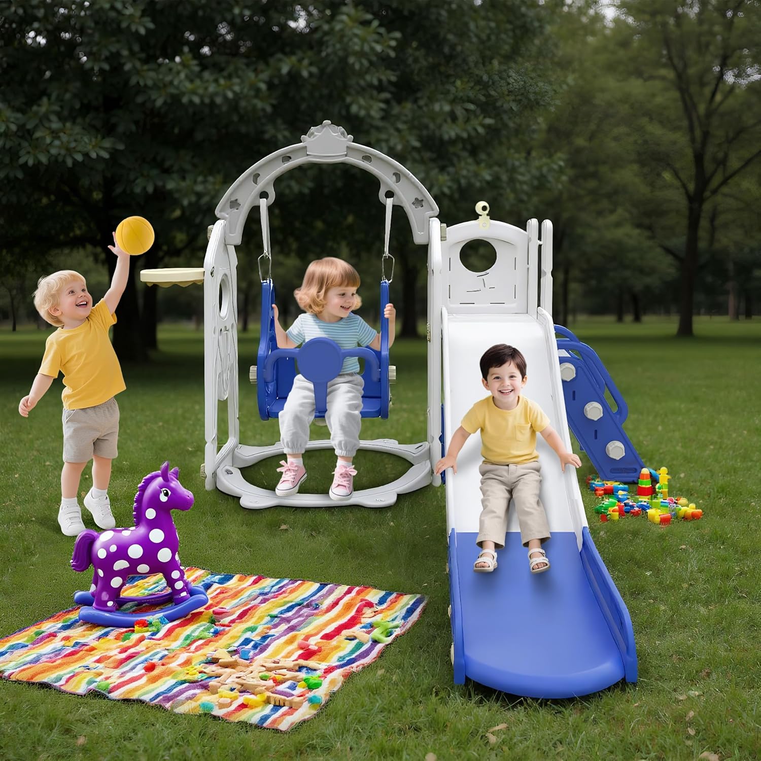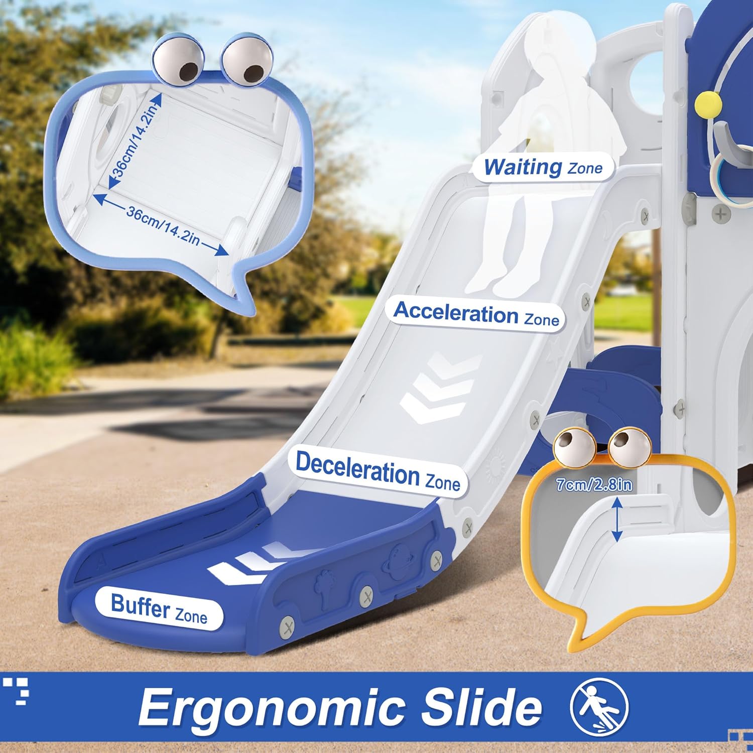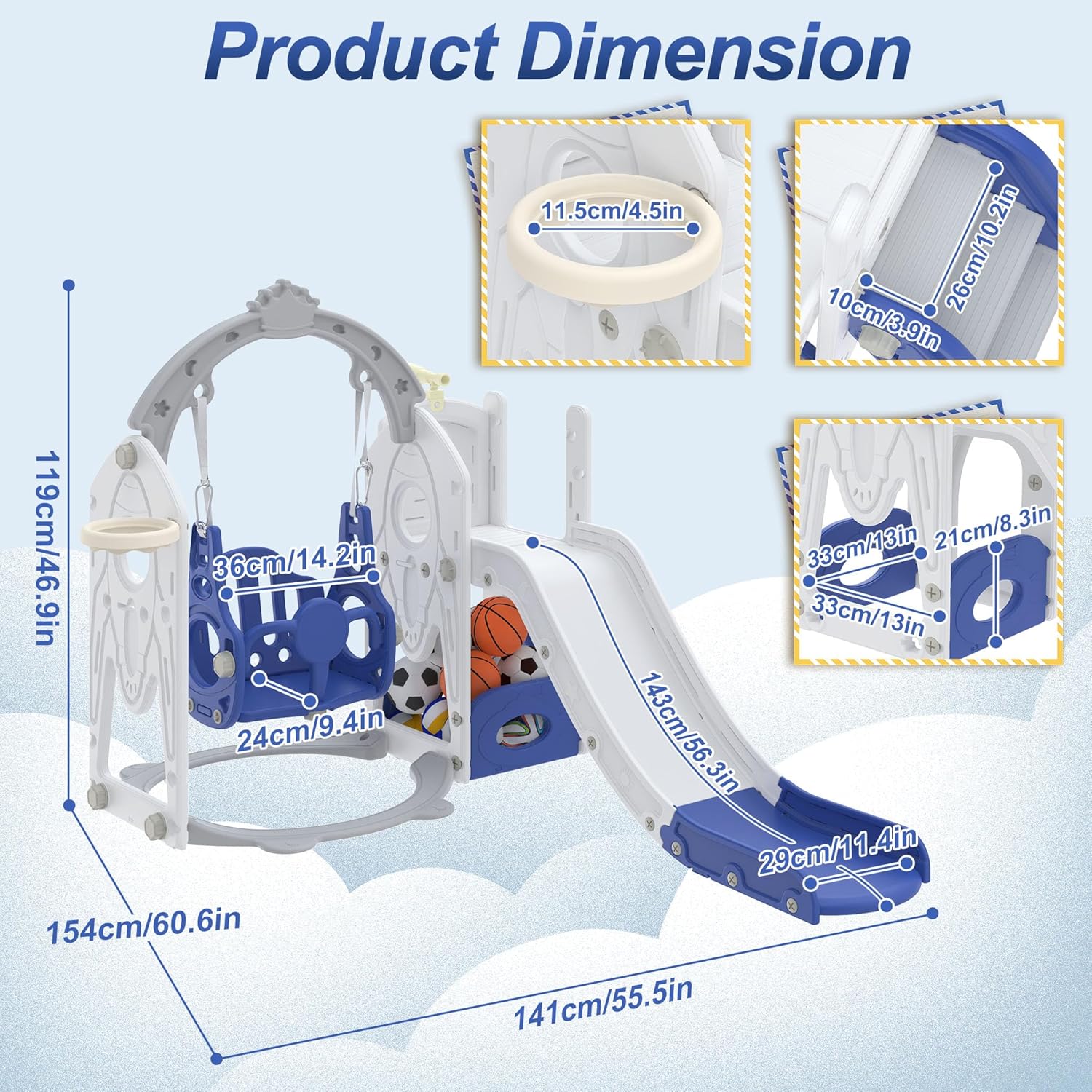 Set da gioco compatto: questo set combina scivolo, altalena, nascondiglio e foro da basket in un design compatto, ideale per piccoli spazi o giardini. Materiali resistenti: realizzato in HDPE di alta qualità e PP, il set offre una portata fino a 50 kg. I bordi arrotondati e i gradini antiscivolo garantiscono la sicurezza del tuo bambino. Promuovere lo sviluppo: oscillando, scivolando e nascondendo le capacità motorie, l'equilibrio e la creatività del tuo bambino vengono promosse. Design accattivante: la combinazione blu e bianco dona un aspetto allegro e invitante, che farà una bella figura sia nella stanza dei bambini che in giardino. Facile da usare: il montaggio è semplice grazie alle istruzioni in dotazione. Le superfici lisce sono facili da pulire con un panno umido.