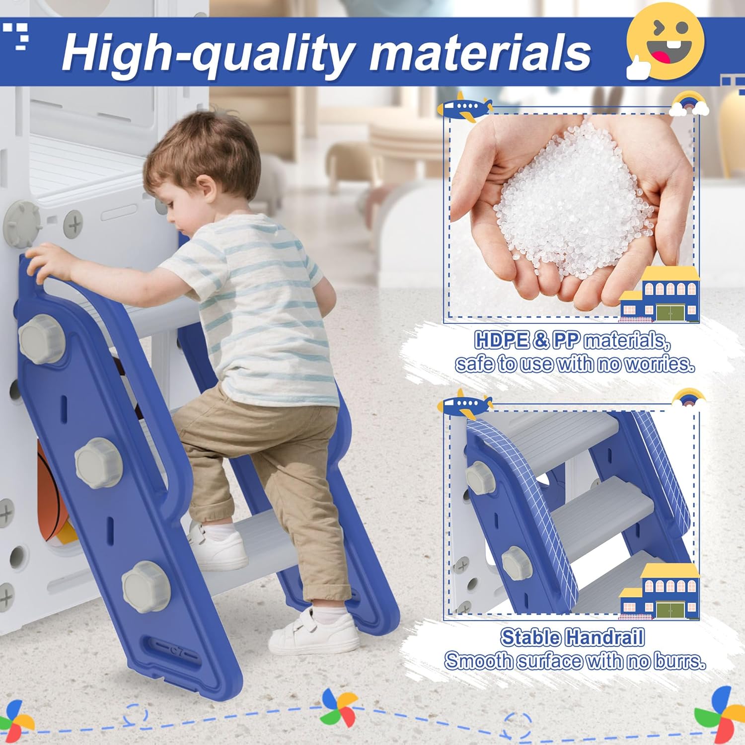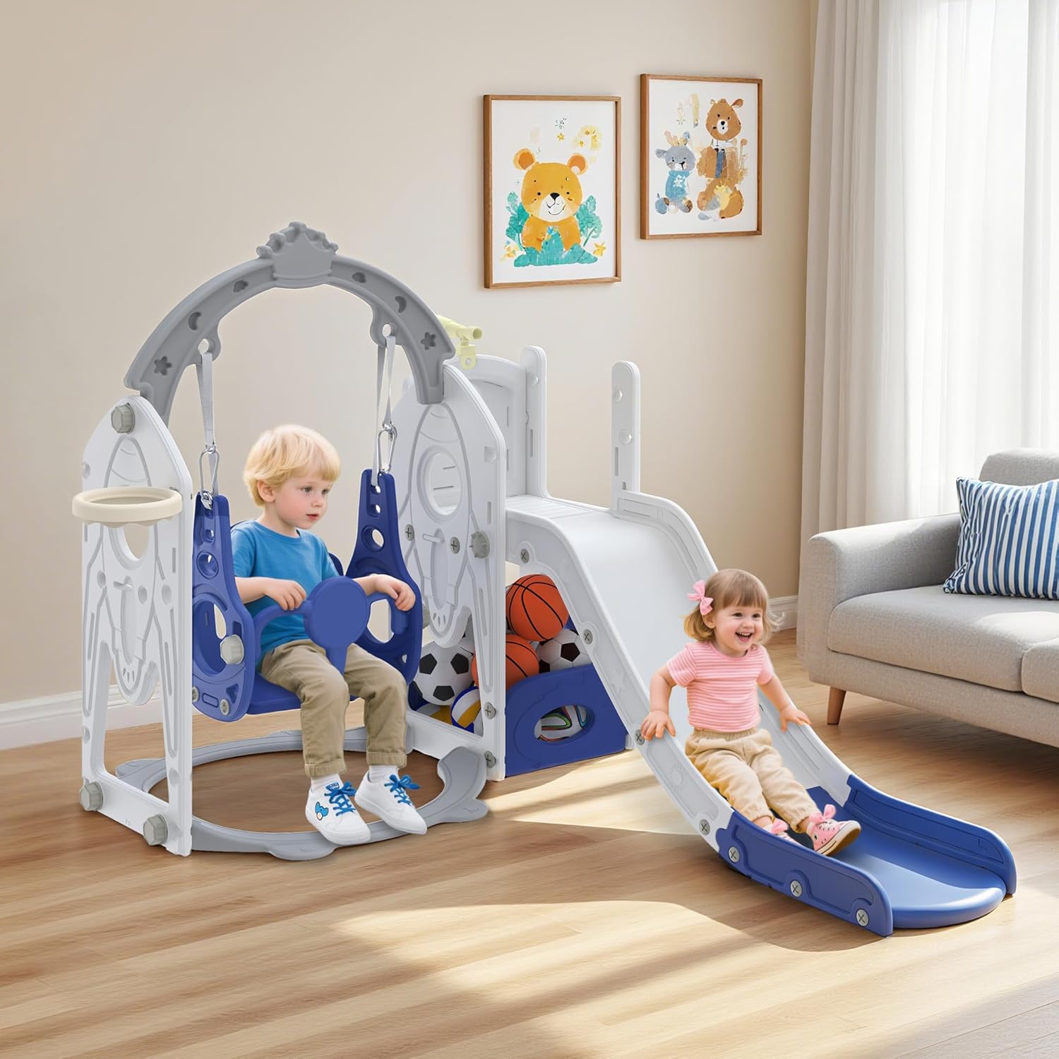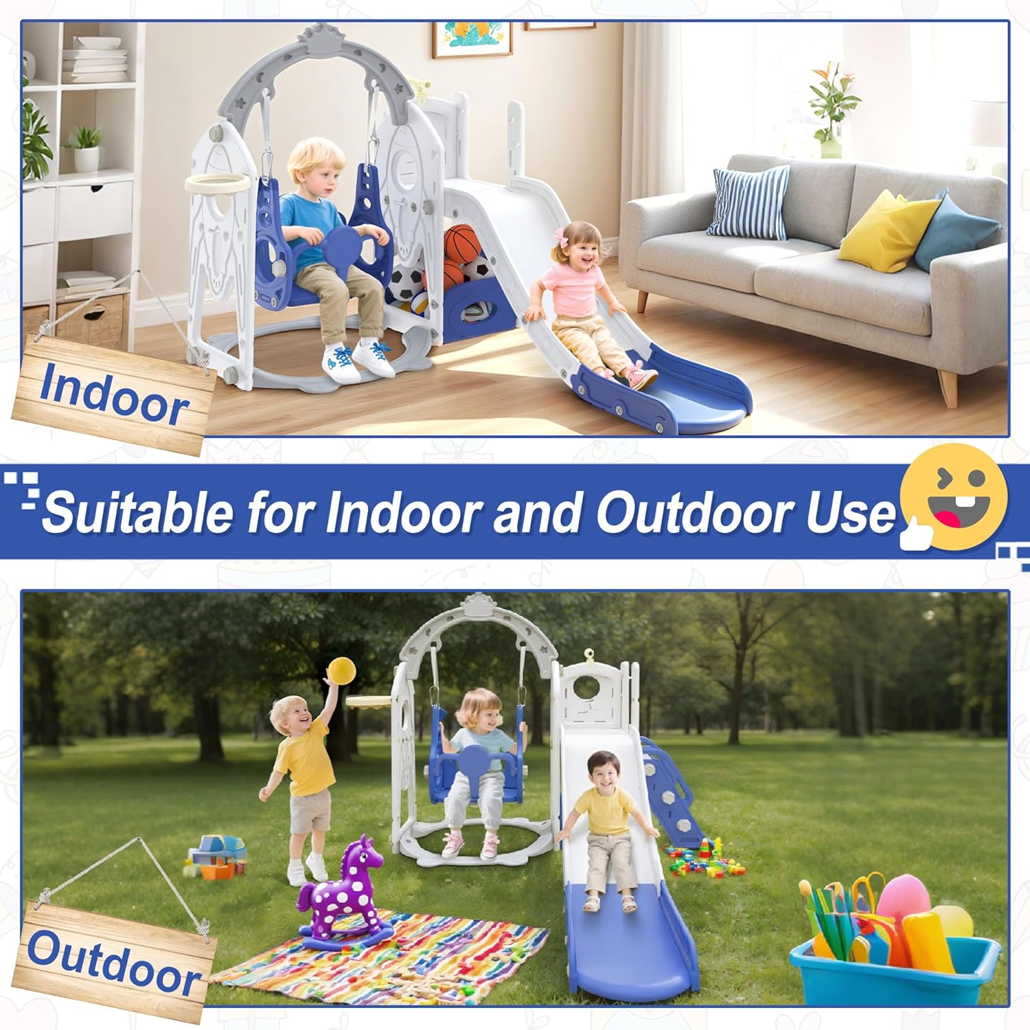Set da gioco compatto: questo set combina scivolo, altalena, nascondiglio e foro da basket in un design compatto, ideale per piccoli spazi o giardini. Materiali resistenti: realizzato in HDPE di alta qualità e PP, il set offre una portata fino a 50 kg. I bordi arrotondati e i gradini antiscivolo garantiscono la sicurezza del tuo bambino. Promuovere lo sviluppo: oscillando, scivolando e nascondendo le capacità motorie, l'equilibrio e la creatività del tuo bambino vengono promosse. Design accattivante: la combinazione blu e bianco dona un aspetto allegro e invitante, che farà una bella figura sia nella stanza dei bambini che in giardino. Facile da usare: il montaggio è semplice grazie alle istruzioni in dotazione. Le superfici lisce sono facili da pulire con un panno umido.