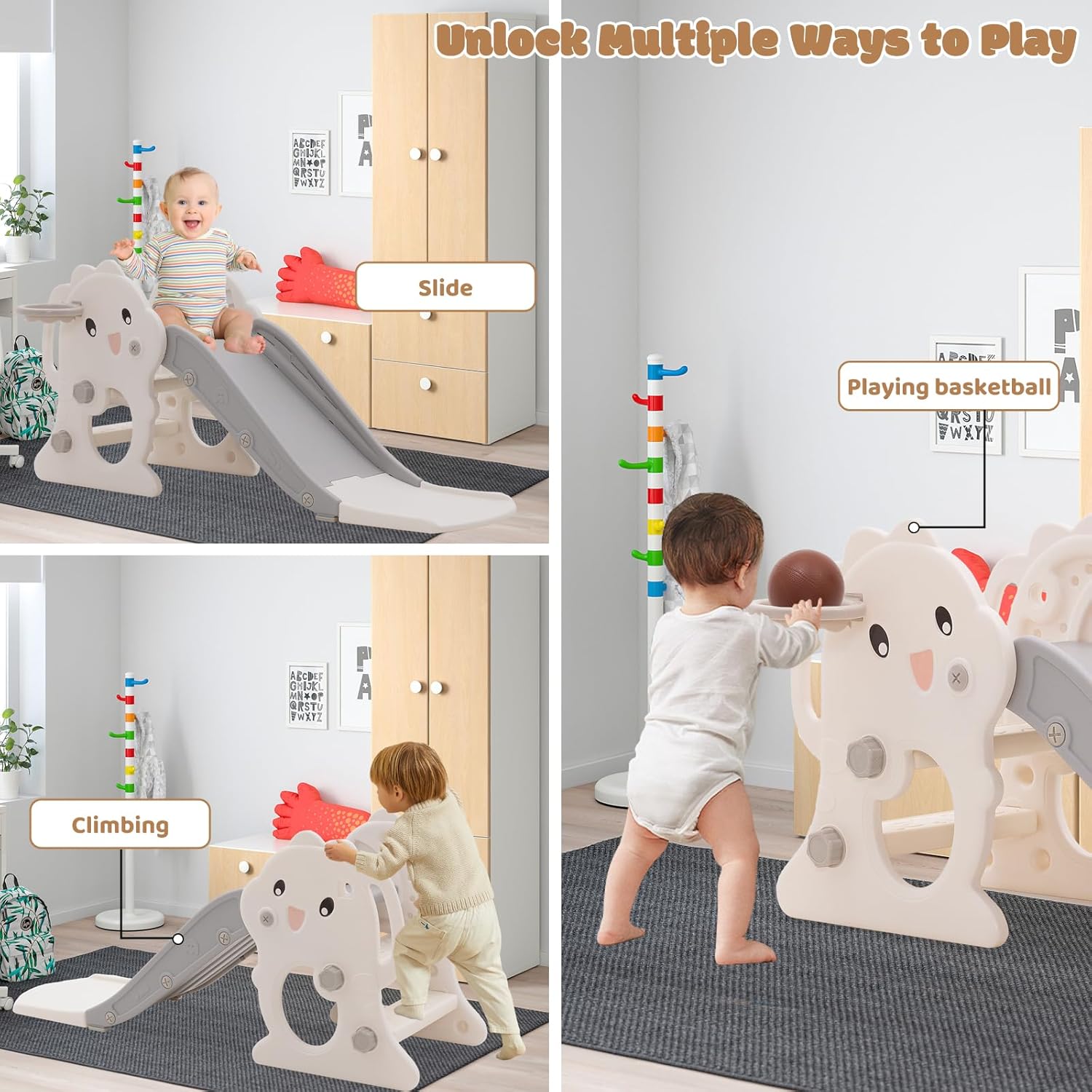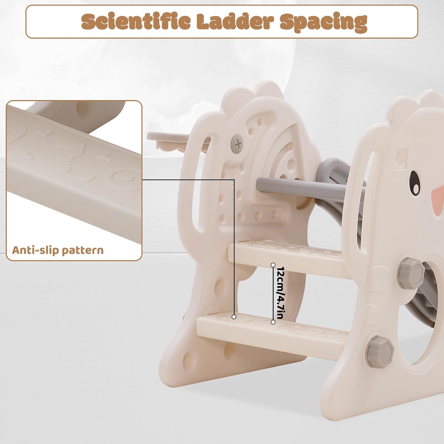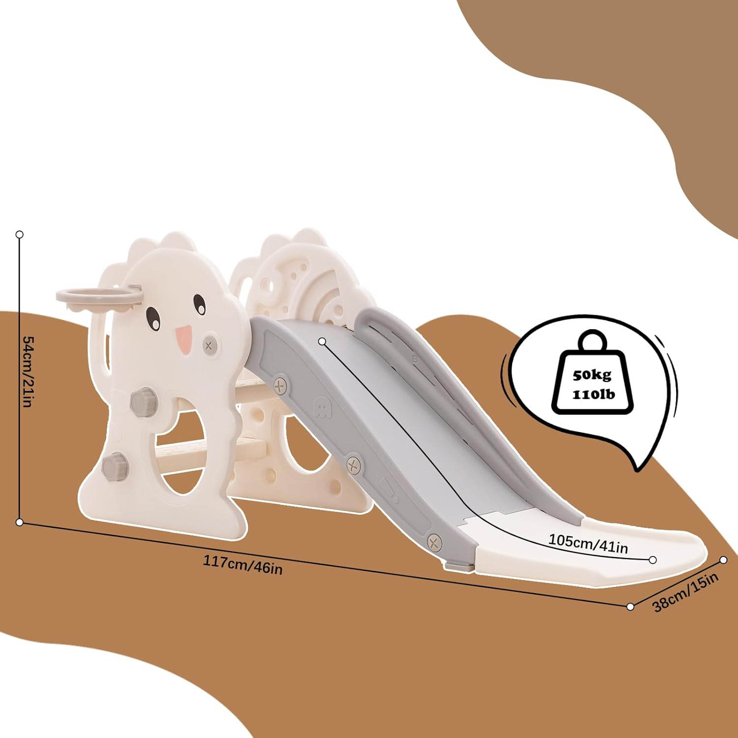 Design pieghevole: l'innovativo scivolo pieghevole può essere facilmente riposto in un angolo o sotto il letto, risparmiando spazio e rendendo superfluo il fastidioso montaggio e smontaggio. Ideale per piccoli spazi Grazie al semplice montaggio è perfetto anche per i viaggi Scivolo allungato e allargato: con le dimensioni di 117 x 38 x 53,5 cm (46 x 15 x 21 pollici), lo scivolo è ideale per i bambini. Il design a tre livelli assicura che i bambini abbiano un'esperienza emozionante ma sicura quando scivolano. La transizione graduale riduce al minimo gli urti offrendo un'esperienza emozionante Sicurezza prima di tutto: la robusta struttura triangolare dello scivolo garantisce sicurezza e stabilità in qualsiasi momento durante il gioco. Le ringhiere di protezione rialzate e i bordi arrotondati proteggono le mani piccole da lesioni. Gli speciali gradini antiscivolo con una distanza di 12 cm sono perfettamente adatti alle esigenze dei bambini piccoli e promuovono la loro fiducia durante l'arrampicata e le loro capacità motorie Set da basket: mentre i bambini giocano sullo scivolo, possono camminare, arrampicarsi e lanciare cestini allo stesso tempo! Questo giocattolo multifunzionale non solo favorisce l'attività fisica, ma anche la coordinazione degli occhi della mano Divertente motivo dinosauro: il design carino rende lo scivolo particolarmente attraente per i bambini e aggiunge un ulteriore divertimento nella stanza dei giochi. Perfetto per diverse occasioni come feste di compleanno, Natale o altre celebrazioni: una vera attrazione che entusiasma i bambini
