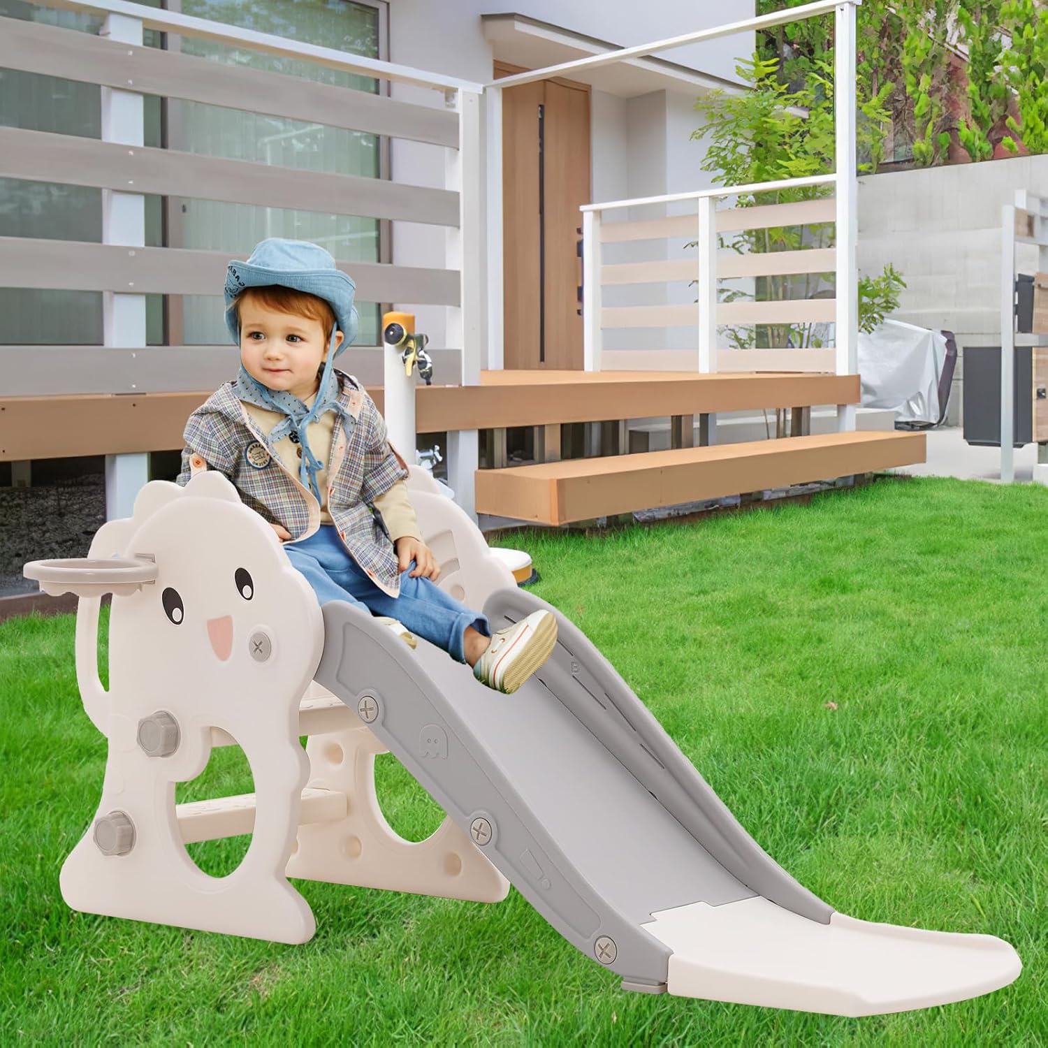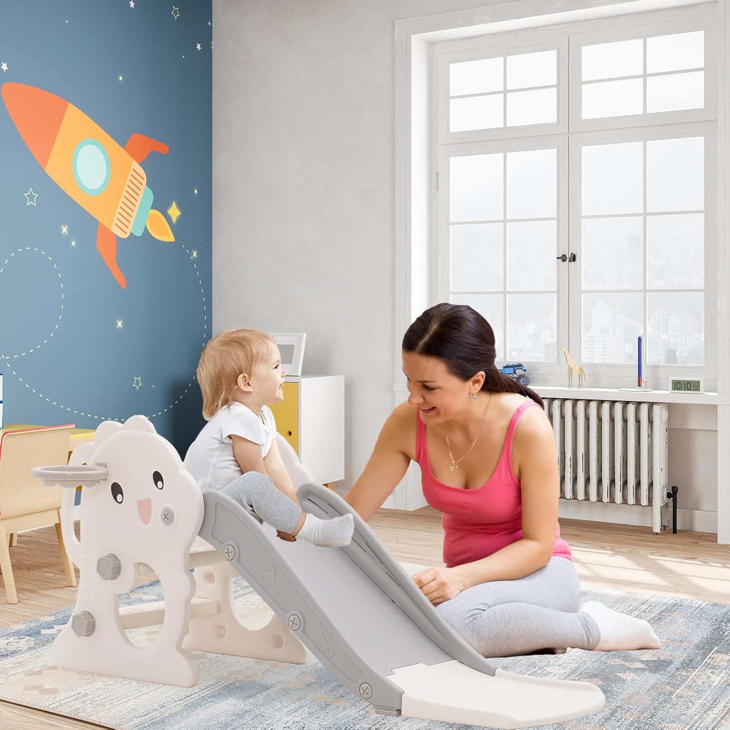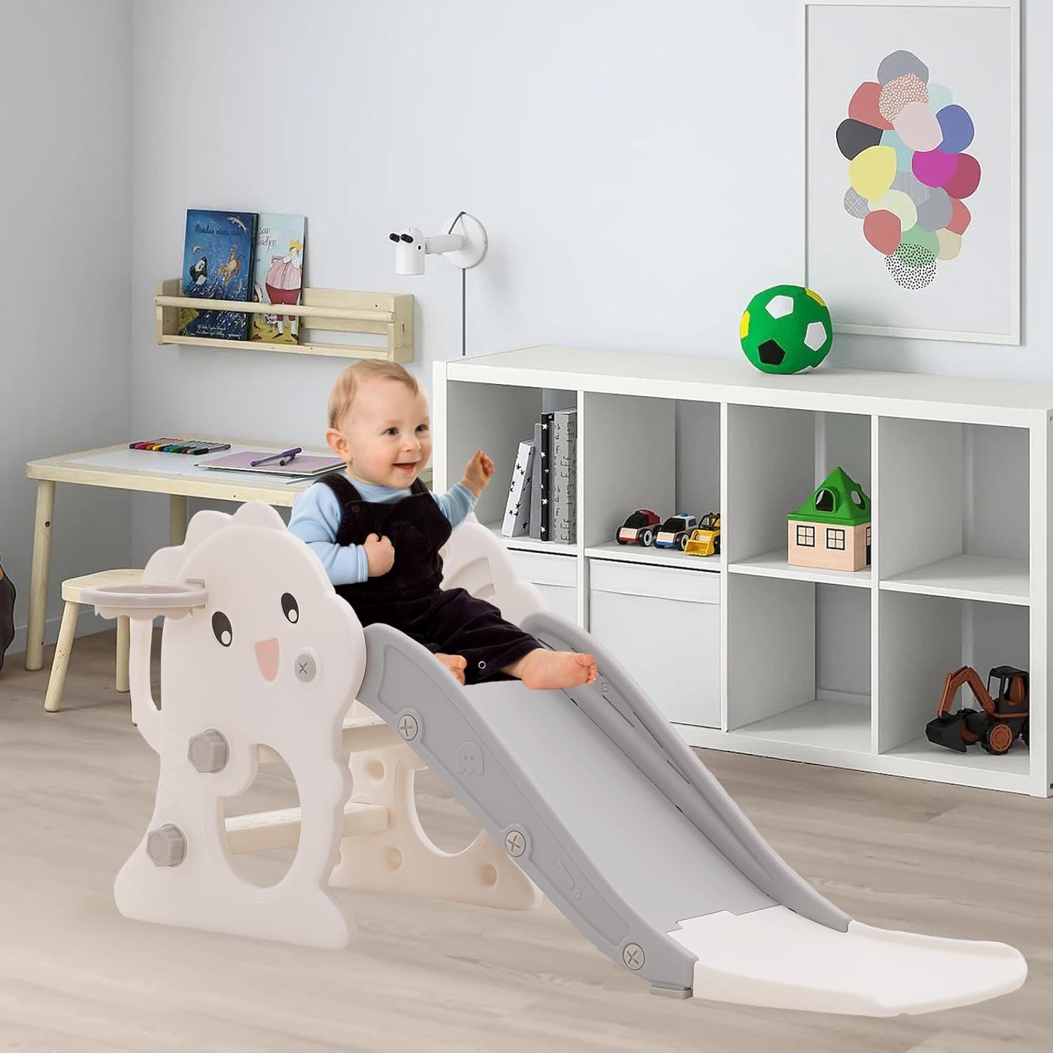 Design pieghevole: l'innovativo scivolo pieghevole può essere facilmente riposto in un angolo o sotto il letto, risparmiando spazio e rendendo superfluo il fastidioso montaggio e smontaggio. Ideale per piccoli spazi Grazie al semplice montaggio è perfetto anche per i viaggi Scivolo allungato e allargato: con le dimensioni di 117 x 38 x 53,5 cm (46 x 15 x 21 pollici), lo scivolo è ideale per i bambini. Il design a tre livelli assicura che i bambini abbiano un'esperienza emozionante ma sicura quando scivolano. La transizione graduale riduce al minimo gli urti offrendo un'esperienza emozionante Sicurezza prima di tutto: la robusta struttura triangolare dello scivolo garantisce sicurezza e stabilità in qualsiasi momento durante il gioco. Le ringhiere di protezione rialzate e i bordi arrotondati proteggono le mani piccole da lesioni. Gli speciali gradini antiscivolo con una distanza di 12 cm sono perfettamente adatti alle esigenze dei bambini piccoli e promuovono la loro fiducia durante l'arrampicata e le loro capacità motorie Set da basket: mentre i bambini giocano sullo scivolo, possono camminare, arrampicarsi e lanciare cestini allo stesso tempo! Questo giocattolo multifunzionale non solo favorisce l'attività fisica, ma anche la coordinazione degli occhi della mano Divertente motivo dinosauro: il design carino rende lo scivolo particolarmente attraente per i bambini e aggiunge un ulteriore divertimento nella stanza dei giochi. Perfetto per diverse occasioni come feste di compleanno, Natale o altre celebrazioni: una vera attrazione che entusiasma i bambini