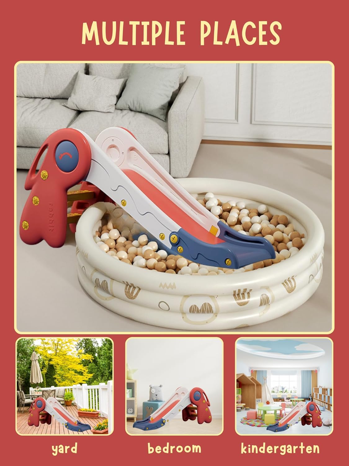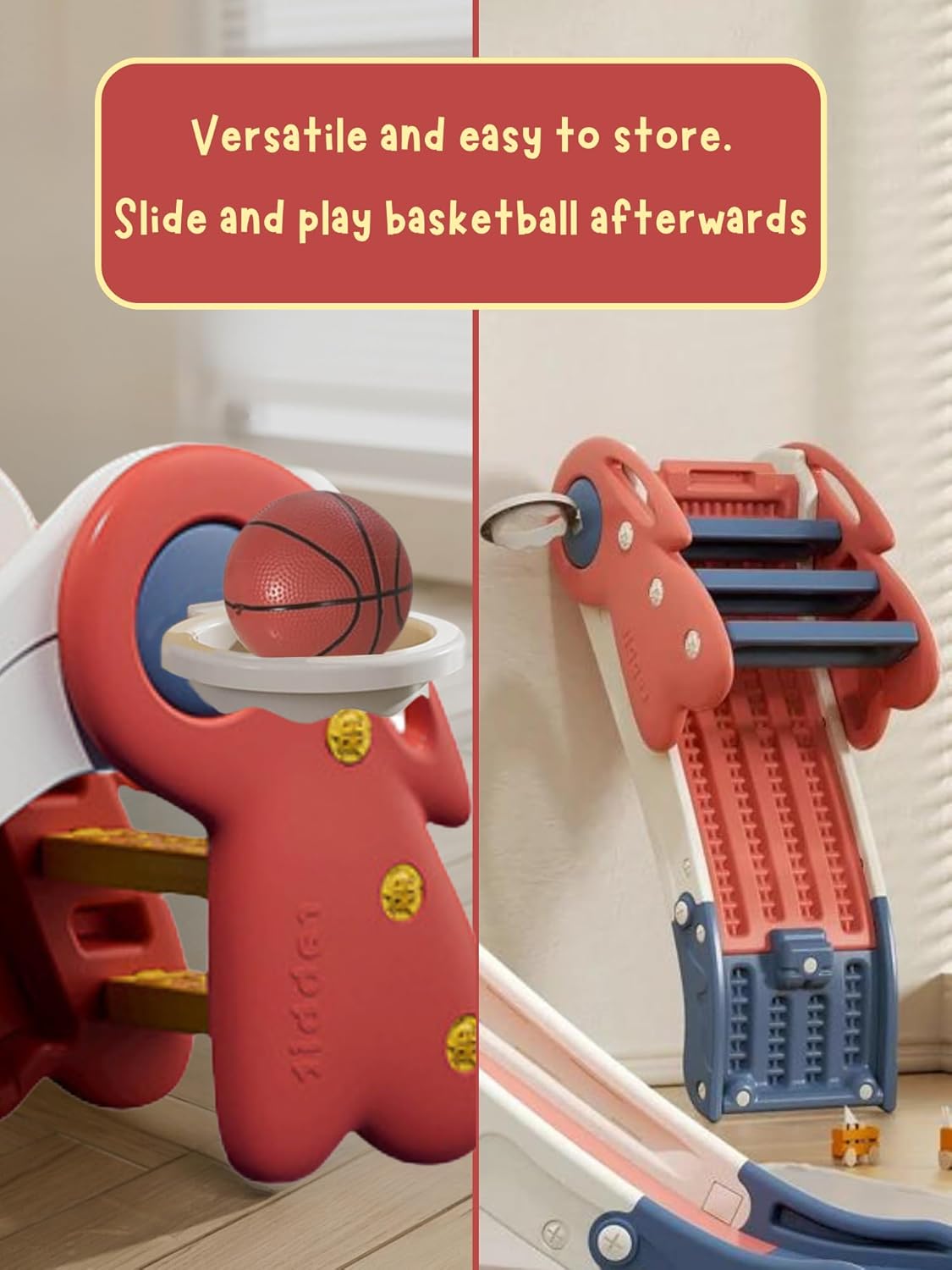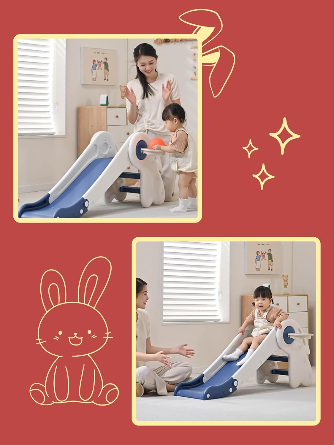 SCIVOLO PIEGHEVOLE PER BAMBINI: questo comodo e sicuro scivolo per bambini si ripiega in modo piatto, consentendo un montaggio rapido e senza attrezzi e un facile stoccaggio quando non in uso. Ideale per interni ed esterni, garantisce ore di divertimento per i più piccoli. DESIGN DIVERTENTE: Con l'aspetto di un adorabile coniglietto e colori vivaci, questo scivolo cattura l'attenzione dei bambini e aggiunge un tocco di fascino a qualsiasi spazio di gioco. Dotato anche di un sistema di struttura triangolare, lo scivolo è robusto, stabile e con bordi arrotondati. I piedini in gomma sulla base proteggono il pavimento e impediscono lo scivolamento. MATERIALE: Realizzato in materiale plastico PP, questo scivolo è sicuro e non contiene BPA, garantendo la protezione dei bambini mentre giocano. FACILE MANUTENZIONE: Mantieni il vetrino pulito con un panno umido ogni volta che vuoi poiché grazie al materiale di cui è composto sarà molto facile mantenerlo in buone condizioni. MISURE E CAPACITÀ: Con lo scivolo aperto le misure sono compatte di 117x55x28cm ed una capacità di carico massima di ca. 25 kg, questo scivolo è adatto ai giochi della prima infanzia, offrendo un'area giochi sicura e spaziosa per attività dinamiche.
