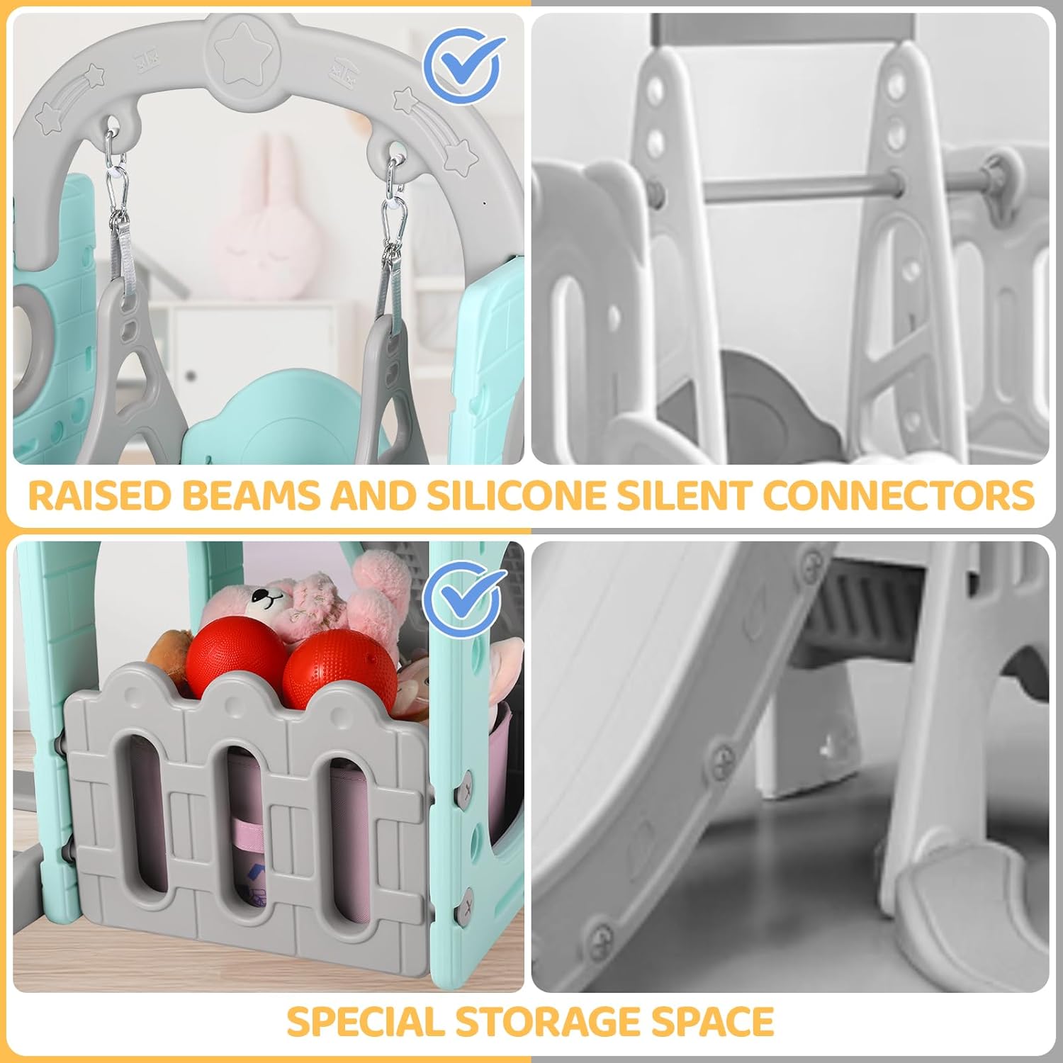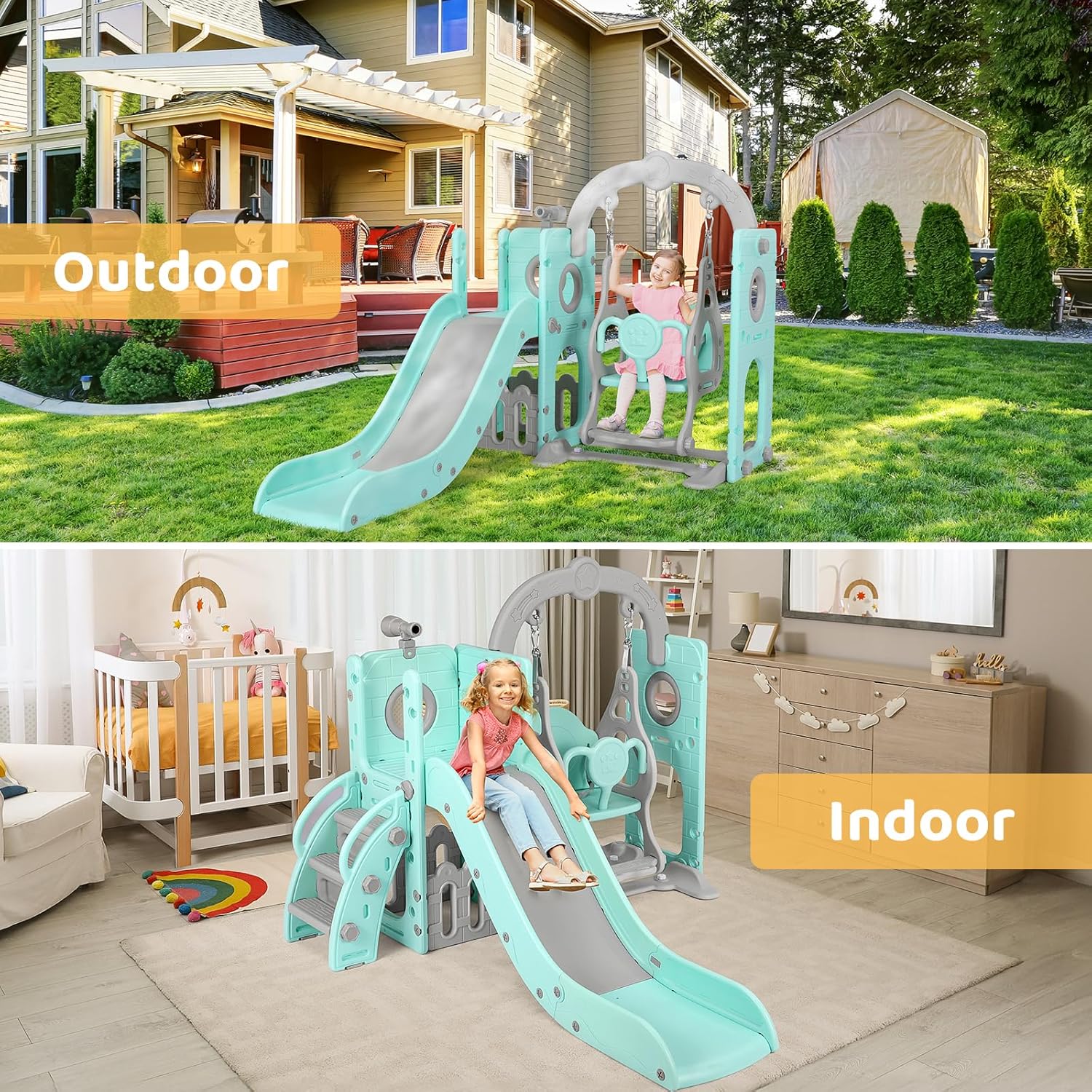 MATERIALE ADATTO AI BAMBINI: lo scivolo per bambini 5 in 1 con altalena è realizzato in HDPE, spesso e robusto. L'intera superficie è ben lucidata e non presenta angoli e bordi taglienti, creando un ambiente di gioco sicuro per i tuoi bambini. Questo parco giochi per bambini è facile da installare e adatto sia per uso interno che esterno. I bambini possono divertirsi per ore sempre e ovunque. È anche una soluzione di stoccaggio per i giocattoli. ALTALENA INNOVATIVA RINFORZATA: l'altalena è una parte che i bambini non possono fermare. L'abbiamo appositamente migliorata per una migliore funzionalità e stabilità. La base dell'altalena è dotata di 4 ventose che possono essere fissate su una superficie piana del pavimento per evitare ribaltamenti accidentali. I braccioli dell'altalena sono collegati con fibbie metalliche con un cuscinetto in silicone per evitare vibrazioni e migliorare la durata. SCIVOLO ROBUSTO PER BAMBINI: il set altalena per bambini piccoli è realizzato con pannelli robusti e ha tappetini antiscivolo sotto i gradini. Sali sulla scala con gradini chiusi antiscivolo e afferra i corrimano rotondi per accedere in sicurezza allo scivolo. L'ampia area anteriore dello scivolo, i corrimano laterali a tutta lunghezza e i lunghi scivoli con zone cuscinetto consentono ai tuoi bambini di divertirsi scivolando in modo emozionante e sicuro. CENTRO ATTIVITÀ 5 IN 1: l'adorabile altalena con scivolo per bambini offre 5 aree attività tra cui struttura per arrampicata, scivolo, altalena, telescopio e spazio di archiviazione. Dondolandosi, arrampicandosi, scivolando e saltando, il bambino sviluppa la coordinazione e il senso dell'avventura mentre gioca. Aiuta anche a migliorare le capacità motorie grossolane, a mantenere la forma fisica e a liberare l'energia in eccesso. PARCO GIOCHI INTERNO-ESTERNO: il set altalena per bambini è facile da smontare e montare e può essere utilizzato all'interno o all'esterno. Ad esempio, in soggiorno, nella stanza dei bambini, nella sala giochi, negli asili nido, negli asili nido, nei parchi giochi, sul prato, nel cortile o in giardino. Crea un parco giochi privato esclusivo per i tuoi bambini. È l'ideale per i compleanni dei bambini. ASSEMBLAGGIO E SERVIZIO: viene fornito con chiare istruzioni per l'uso, in modo da poter completare facilmente l'assemblaggio. Insistiamo nel realizzare buoni prodotti e servizi. In caso di domande, contattaci immediatamente per fornirti una soluzione.