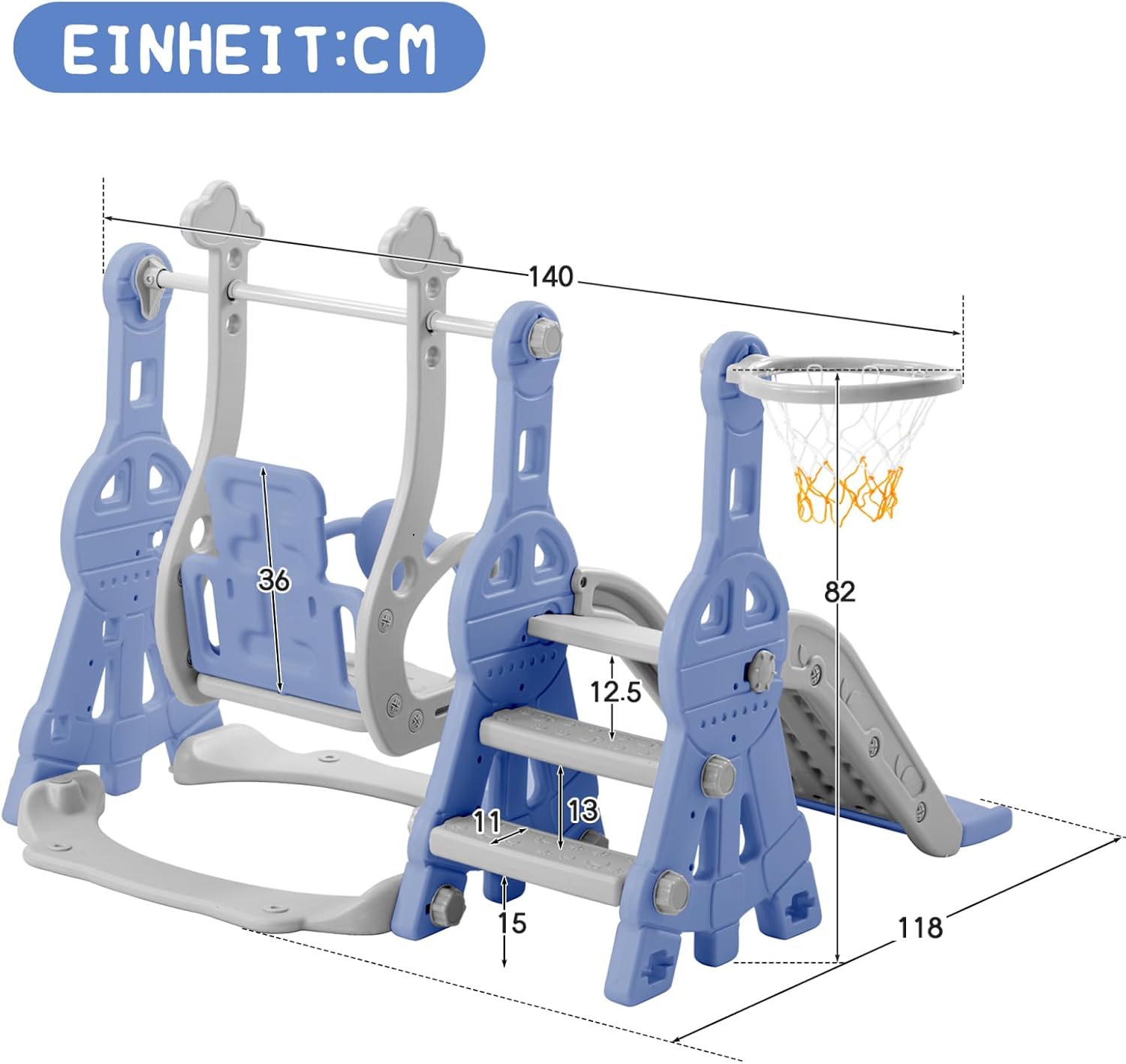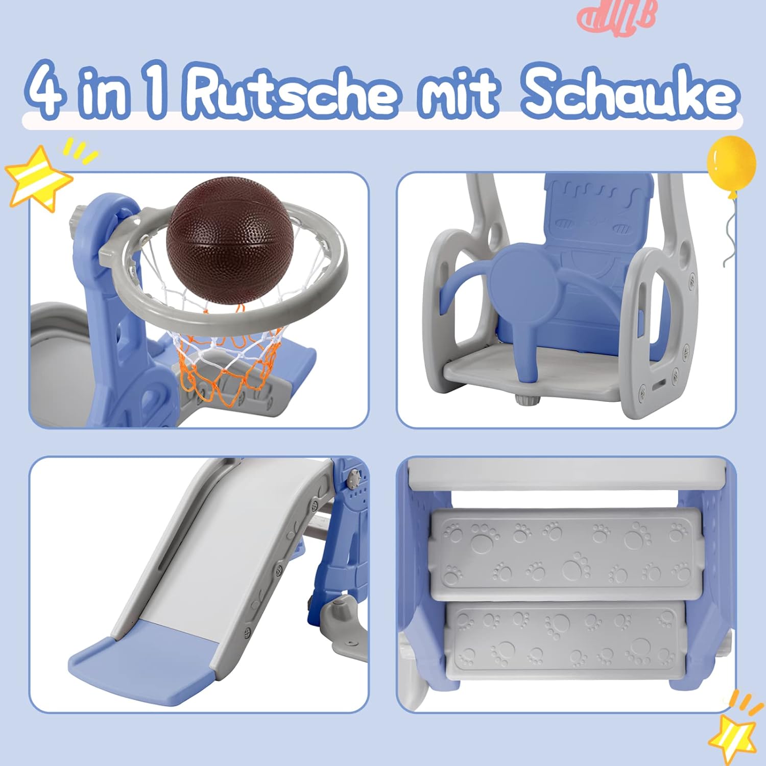 Set da gioco multifunzione 4 in 1: basta questo parco giochi 4 in 1, i vostri bambini possono soddisfare le molteplici possibilità di gioco e sport, perché questa torre da gioco multifunzionale include scivolo, scala, altalena e canestro da basket. I kairnder possono allenare i muscoli, la forza e la coordinazione occhio-mano durante il gioco Scivolo leggero e altalena regolabile: questo scivolo morbido con una gamma di scorrimento estesa e ampia garantisce una perfetta velocità di scorrimento e le ampie staffe e le scale antiscivolo garantiscono sicurezza. L'altalena con forti grucce e corde garantisce un gioco sicuro ed è anche un modo per allenare il coraggio dei bambini Sicuro e durevole: questo set di altalena e scivolo 4 in 1 è realizzato in materiale HDPE resistente e atossico. Il parco giochi per bambini può sopportare un peso di 45 kg, in modo che i bambini possano scivolare in sicurezza. Questo set di altalena utilizza pedali migliorati e chiusi per evitare che il bambino rimanga bloccato. È sicuro e accompagna il tuo bambino fino a quando non è cresciuto Scivolo per bambini per interni ed esterni: utilizzato all'interno o nel cortile, questo set da gioco offre un parco giochi divertente e sicuro per il vostro piccolo. Diverse possibilità di gioco: swing, scivolo, anello da basket, liberate la natura atletica dei bambini, rafforzate il loro entusiasmo per lo sport e godetevi un'infanzia felice Facile da montare e pulire: non sono necessari altri strumenti, una persona può completare il montaggio in 20 minuti. Lo scivolo per bambini è rinforzato con dadi dentati per evitare l'allentamento. La polvere non lascia macchie sulla superficie liscia ed è possibile pulire la pellicola con un panno umido