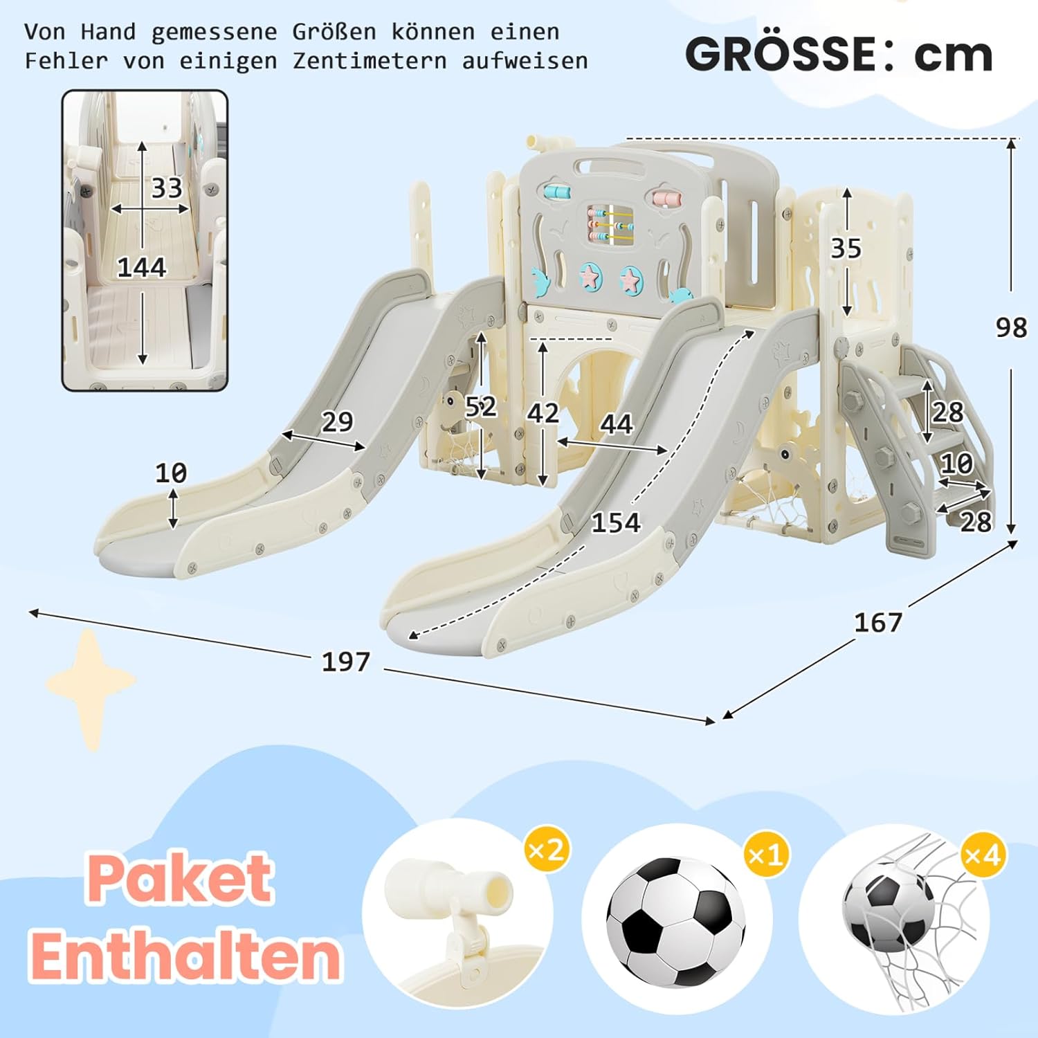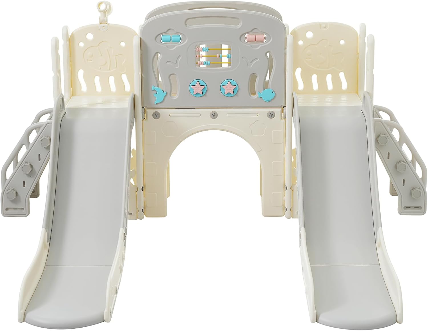 Dettagli notevoli: Parco giochi per bambini utilizza HDPE di alta qualità. Le superfici di questo parco giochi multifunzionale per bambini sono lisce e i bordi sono morbidi e pieni, una parte estesa nella parte inferiore dello scivolo può ridurre efficacemente la velocità di scorrimento e fornire il miglior supporto per la colonna vertebrale e i fianchi del bambino. Facile manutenzione e utilizzo: questo parco giochi multifunzionale per bambini non contiene parti metalliche e tutte le parti possono essere collegate con dadi in plastica. In questo caso, gli utenti possono facilmente installare questo prodotto senza strumenti. Questo prodotto può essere utilizzato sia all'interno che all'esterno. Design accattivante e colorato: i colori vivaci e le forme divertenti lo rendono più coinvolgente per i piccoli. Cesto da basket e altri elementi hanno un design semplice che si adatta bene allo scivolo. Che si tratti di un giardino o nella cameretta dei bambini, questo scivolo dal design accattivante aggiunge un tocco di allegria e divertimento all'ambiente. Diversità delle attività divertenti: hai solo bisogno di questo parco giochi per bambini, i tuoi bambini potranno scoprire le varie opzioni di gioco e sport. Sia all'interno che all'esterno, è un parco giochi completo che offre al tuo bambino una varietà di modi per divertirsi. Adatto a diversi ambienti: lo scivolo interno del bambino è perfetto per i giorni di maltempo o per gli spazi interni. Permette ai bambini di divertirsi e di spendere energia anche quando non possono andare fuori.D'altra parte, lo scivolo all'aperto per bambini è ideale per godersi la vita all'aria aperta.