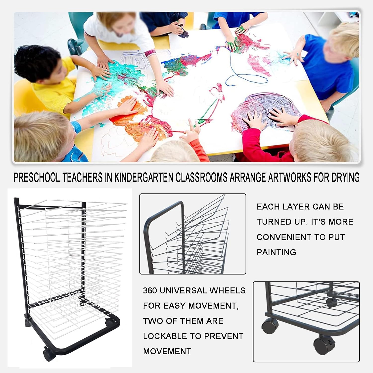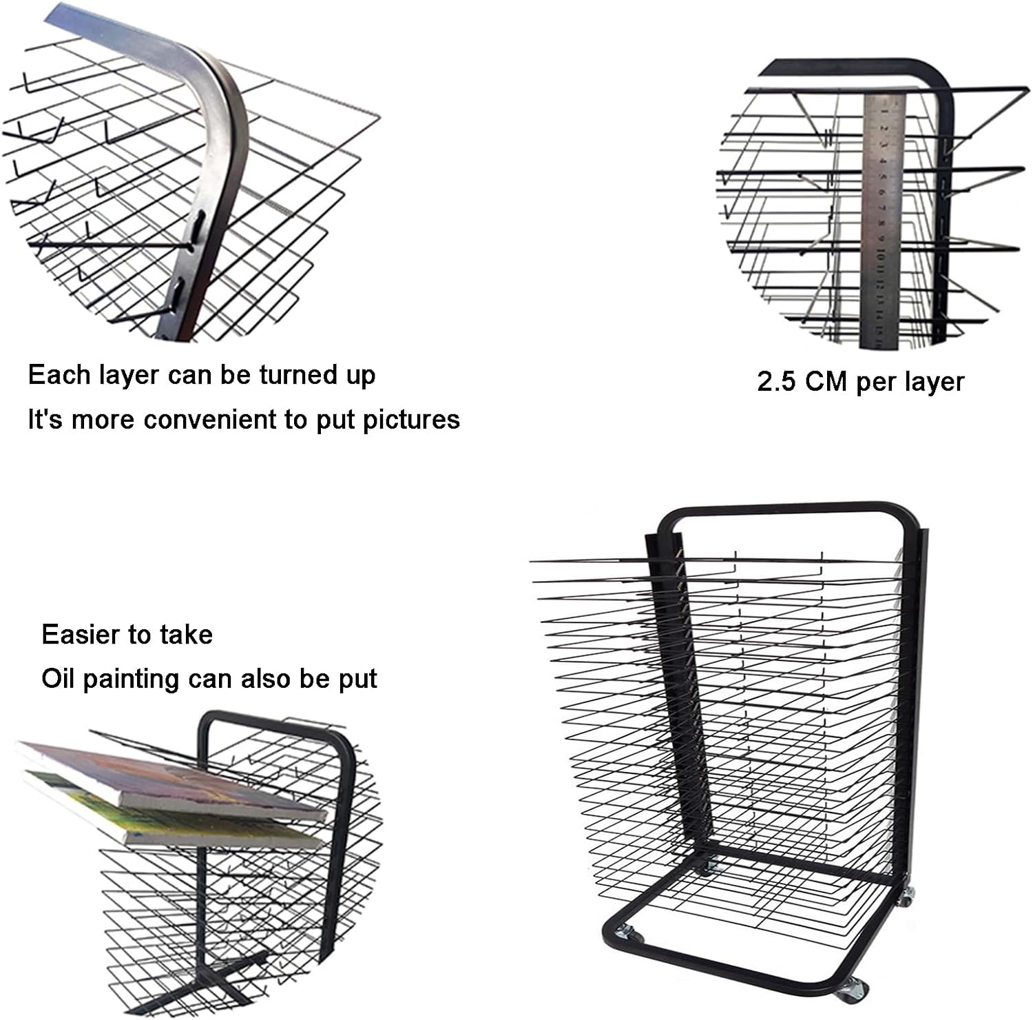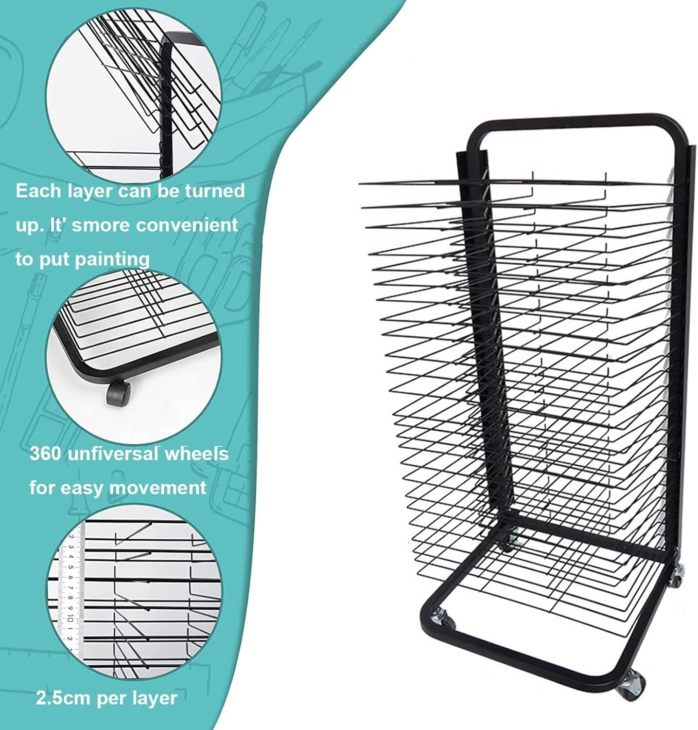 1. La robusta struttura in ferro metallico saldato garantisce un uso duraturo e ampio spazio tra i telai del rack per mantenere le opere d'arte prive di macchie Pulegge universali a 360° per un facile movimento su superfici lisce, con un dispositivo frenante per un posizionamento stabile delle opere d'arte 3· Il telaio sottile del filo e la corretta distanza tra gli strati favoriscono l'asciugatura rapida e la ventilazione per i dipinti 4. Uso versatile in studi, scuole, case, asili e molto altro ancora dove sono necessari oli essiccanti 5· Facile installazione con istruzioni e strumenti inclusi, facile da pulire con un panno umido o un detergente standard