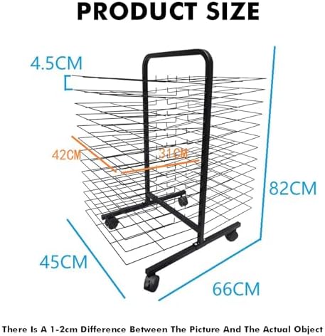 Struttura in acciaio resistente: questo stendibiancheria artistico è realizzato in acciaio di alta qualità, offre 26, 38 o 50 strati di stoccaggio con una distanza di 2,5 cm tra loro, fornendo molto spazio per varie opere d'arte. Il robusto design in metallo garantisce una lunga durata per un uso regolare. Opzioni di dimensioni versatili: disponibile in 26, 38 e 50 strati con rack rimovibili distanziati a 2 o 4,5 cm l'uno dall'altro, questo stendibiancheria può ospitare tavole di tela da 8 a 4,9 m. Il suo ingombro compatto è perfetto per case o studi, facilitando l'asciugatura efficiente e lo stoccaggio di più opere d'arte contemporaneamente. Ripiani girevoli facili da usare: i ripiani rimovibili possono essere facilmente sollevati ad un angolo di 90° per un comodo accesso e organizzazione. Il montaggio è semplice: basta collegare i telai superiore e inferiore e inserirli nel rack senza bisogno di attrezzi. Ventilazione migliorata: dotato di una struttura cava multistrato, questo stendibiancheria per arte garantisce un flusso d'aria costante intorno alla tua opera d'arte. Il design a griglia aperta aiuta a prevenire l'accumulo di umidità consentendo all'aria di circolare liberamente. Un apposito spazio di ventilazione nella parte inferiore accelera l'evaporazione dell'acqua, rendendolo adatto per asciugare pitture, ceramiche e altro ancora. Mobilità e stabilità: dotato di quattro ruote a rullo, tra cui due ruote bloccabili, questo stendibiancheria artistico consente un movimento senza sforzo della stazione di asciugatura mantenendo la stabilità durante il funzionamento. È ideale per regolare lo spazio di lavoro secondo necessità.