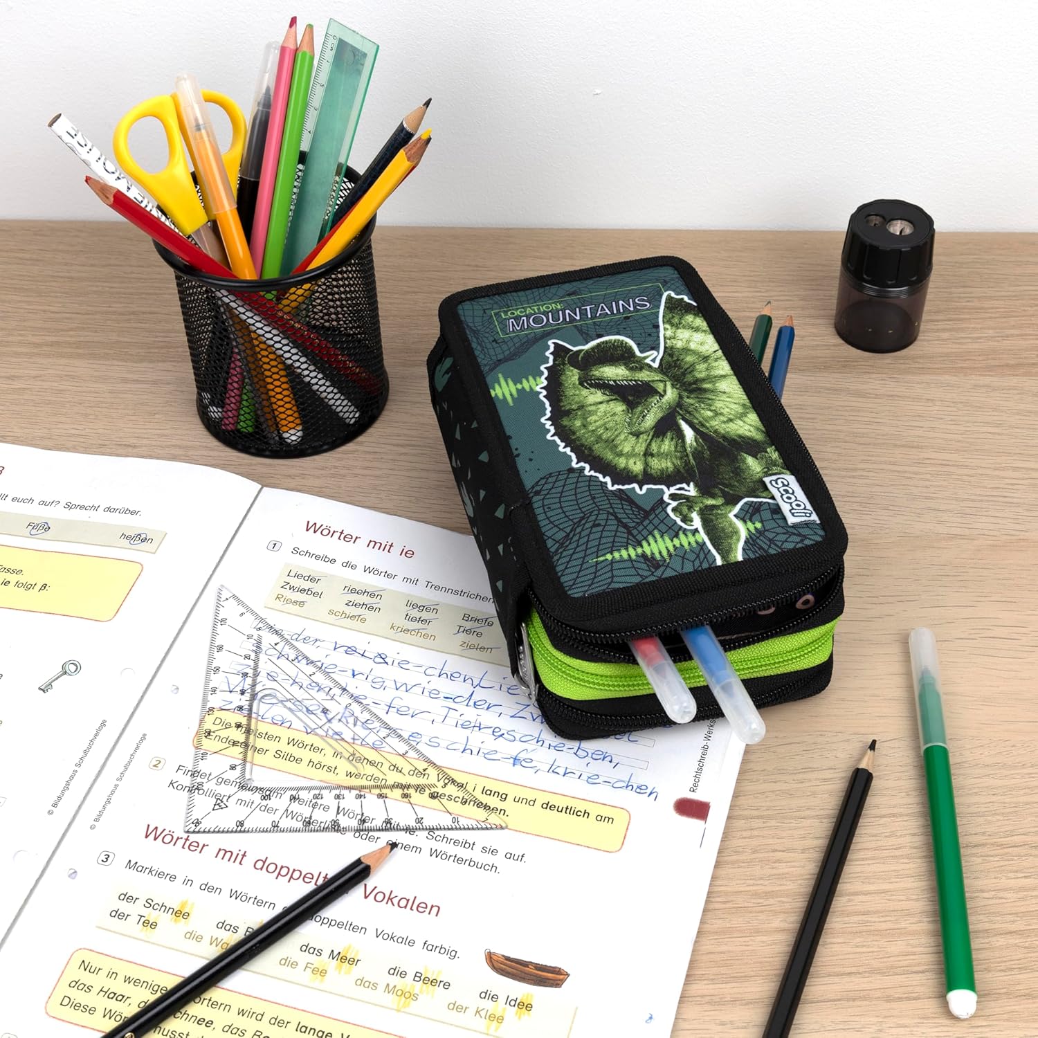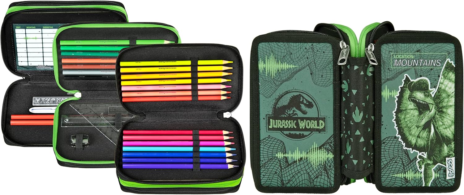 Tutto è lì - la grande custodia per la scuola offre spazio sufficiente per le matite, il righello, la gomma e molto altro. Tutti gli utensili importanti sono ben organizzati e sempre a portata di mano. Forma ergonomica - Il design a tre piani si adatta perfettamente all'ergonomia delle mani piccole. L'apertura e la chiusura facili permettono un utilizzo confortevole. Design resistente - La trousse per la scuola è realizzata in un materiale resistente e quindi resistere alle sollecitazioni quotidiane nello zaino scolastico. È resistente e durevole. Design cool di Jurassic World - Con i motivi popolari di Jurassic World, il kit non è solo pratico, ma anche un punto culminante visivo. Perfetto per tutti i fan di Jurassic World a scuola. Qualità Top Scooli - Diamo priorità a materiali durevoli e verificati in modo indipendente, così come a caratteristiche ben pensate per garantire la durata e l'innocuità dei nostri prodotti nella vita quotidiana colorata della famiglia.