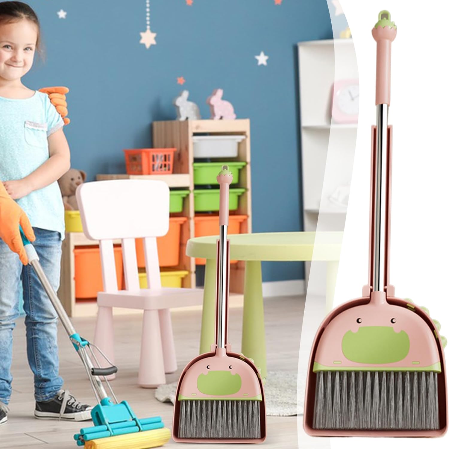 Strumenti di pulizia per bambini: Promuove la responsabilità fornendo una scopa e una delle dimensioni adatte ai bambini, leggera, facile da impugnare e perfettamente adatta per mani piccole, migliorando naturalmente le loro capacità di pulizia durante le attività quotidiane Facile da Usare in Sicurezza:Progettato per eliminare odori forti e garantire sicurezza, questo set include bordi lisci e nessuna punta tagliente. I bambini possono godersi le attività di pulizia in modo sicuro, con manici ergonomici che offrono una presa confortevole. Un accessorio per incoraggiare i bambini a partecipare alle faccende domestiche con fiducia Divertimento Interattivo: Progettato con colori vivaci per attirare l'attenzione, questo set rende le faccende quotidiane una piacevole passione. Ispirando l'entusiasmo dei bambini, promuove momenti di qualità con i genitori durante le sessioni di pulizia giocosa e creativa Facilita l'Igiene Quotidiana: Con superfici lisce e facili da pulire, questo set di scopa e per bambini permette una rapida pulizia evitando l'accumulo di sporco, promuovendo un ambiente più igienico durante le attività domestiche quotidiane. Ideale per insegnare ai bambini l'importanza della pulizia, il set diventa strumento pratico per mantenere la casa in ordine senza aggiuntivi per i genitori Conservazione semplificata: per la casa e gli ambienti educativi come gli asili, il set di scopa e per bambini offre un design compatto che risparmia spazio e semplifica la conservazione. La sua struttura leggera e maneggevole lo rende facile da riporre e utilizzare, senza rinunciare alla praticità necessaria per le attività di pulizia quotidiane.