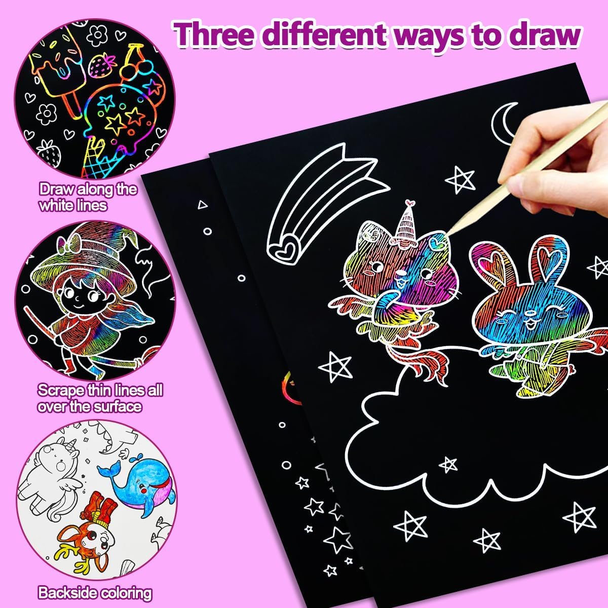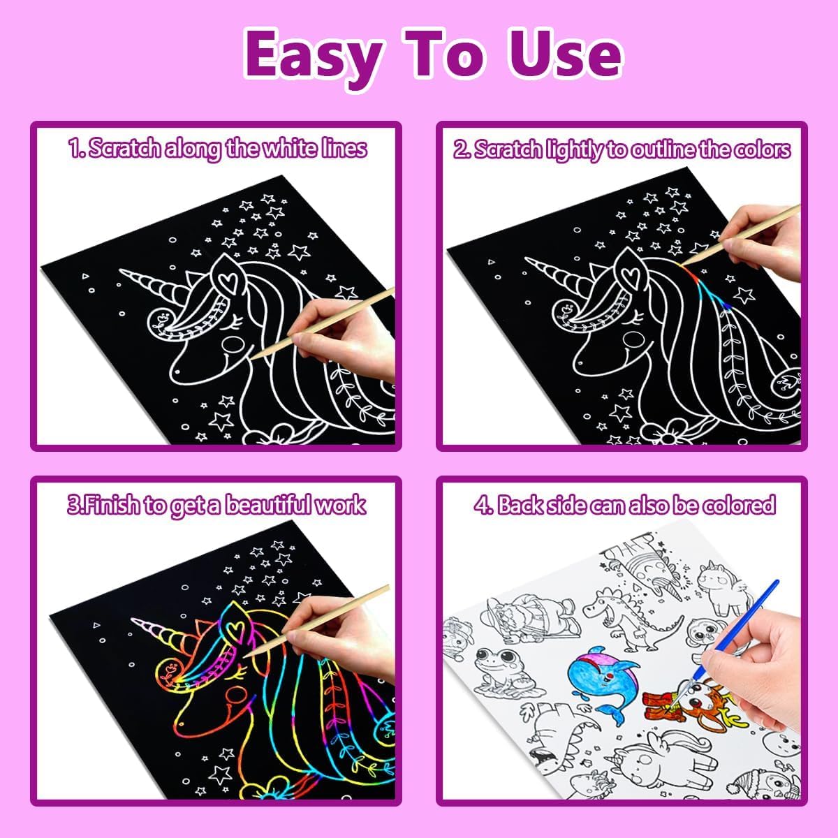 🦄 【Set da grattare Unicorno】Il set contiene 8 fogli da grattare a tema unicorno con motivi diversi, ognuno dei quali è pieno di fantasia e divertimento, ricco di colori e amato dai bambini. È facile da usare con un pennarello in legno e i bambini possono iniziare a creare in qualsiasi momento e immergersi nel magico mondo della pittura a graffio! 🌿 【Materiale sicuro】Utilizza cartoncini di carta spessa ecologica e pennarelli in legno naturale, sicuri e atossici, robusti e resistenti, non facili da strappare e con bordi lisci che non feriscono le mani, permettendo ai bambini di giocare con sicurezza e ai genitori di accompagnarli in tutta tranquillità. 🎨 【Fai da te illimitato】Lo splendido sfondo arcobaleno è nascosto sotto il rivestimento nero. Basta grattarlo delicatamente e i colori appariranno immediatamente. Che si tratti di graffiti liberi o di disegni a motivi, i bambini possono scatenare la loro immaginazione senza limiti, migliorare la loro concentrazione e le loro capacità pratiche e godersi un divertimento creativo immersivo. 📚 【Ampia gamma di usi】I disegni da grattare per bambini non sono adatti solo per i graffiti quotidiani, ma anche per creare biglietti fatti a mano, biglietti di auguri, decorazioni natalizie e altre piccole idee creative. Che si tratti di un corso di pittura, di un momento di svago in famiglia o di giochi di società, possono essere facilmente integrati ed è pieno di divertimento. 🎁 【Regalo perfetto】Il disegno da grattare arcobaleno è carino e offre un gameplay ricco. È un piccolo regalo ideale per compleanni, Natale, Festa dei Bambini e altre occasioni. Che venga regalato ai propri figli, o come regalo per il ritorno a scuola o per una festa, porterà ai bambini sorprese e momenti felici.