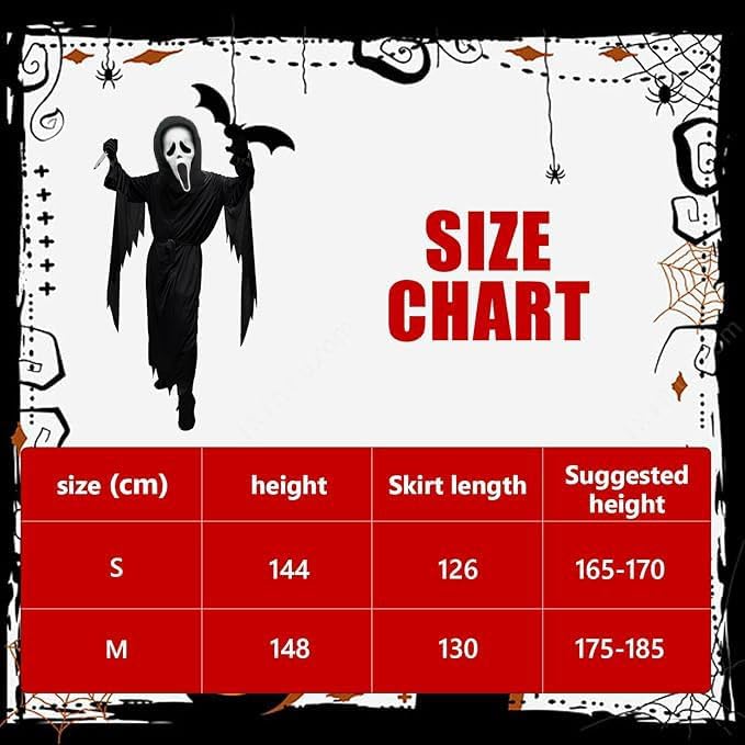 Descrizione prodotto Descrizione prodotto TaiXinYuly Scream Costume, Unisex Scream Costume con Ghostface Mask, Vestito Ghostface Adulto, Vestito Scream per Halloween Carnevale Cosplay Feste Caratteristiche: 1.Costume di Halloween Scream realizzato in tessuto di alta qualità, 100% poliestere. Riutilizzabile e perfetto per un'atmosfera spettrale di Halloween. 2.La maschera fantasma è realizzata al 100% in EVA e presenta fori per il naso e gli occhi per una visione chiara e una respirazione facile. 3.Qualità eccellente - Questo costume è realizzato in poliestere di alta qualità con cuciture superbe, grande elasticità, leggero, molto comodo da indossare. Specifiche: Colore: nero Dimensioni: vedere le foto per i dettagli. ateriale: Abito nero con cappuccio: 100% poliestere maschera da urlo fantasma: 100% poliestere + materiale EVA Coltello: 100% plastica Il pacchetto include: 1 * Costume da urlo 1 * maschera fantasma 1 * paio di guanti 1 coltello 1 * Cintura Note: 1. Si prega di consentire un errore di 0-1 pollici dovuto alla misurazione manuale. Grazie per la comprensione. 2. I monitor non sono calibrati allo stesso modo, il colore dell'articolo visualizzato nelle foto potrebbe essere leggermente diverso dall'oggetto reale. Si prega di prendere quello vero come standard. Avviso di sicurezza No