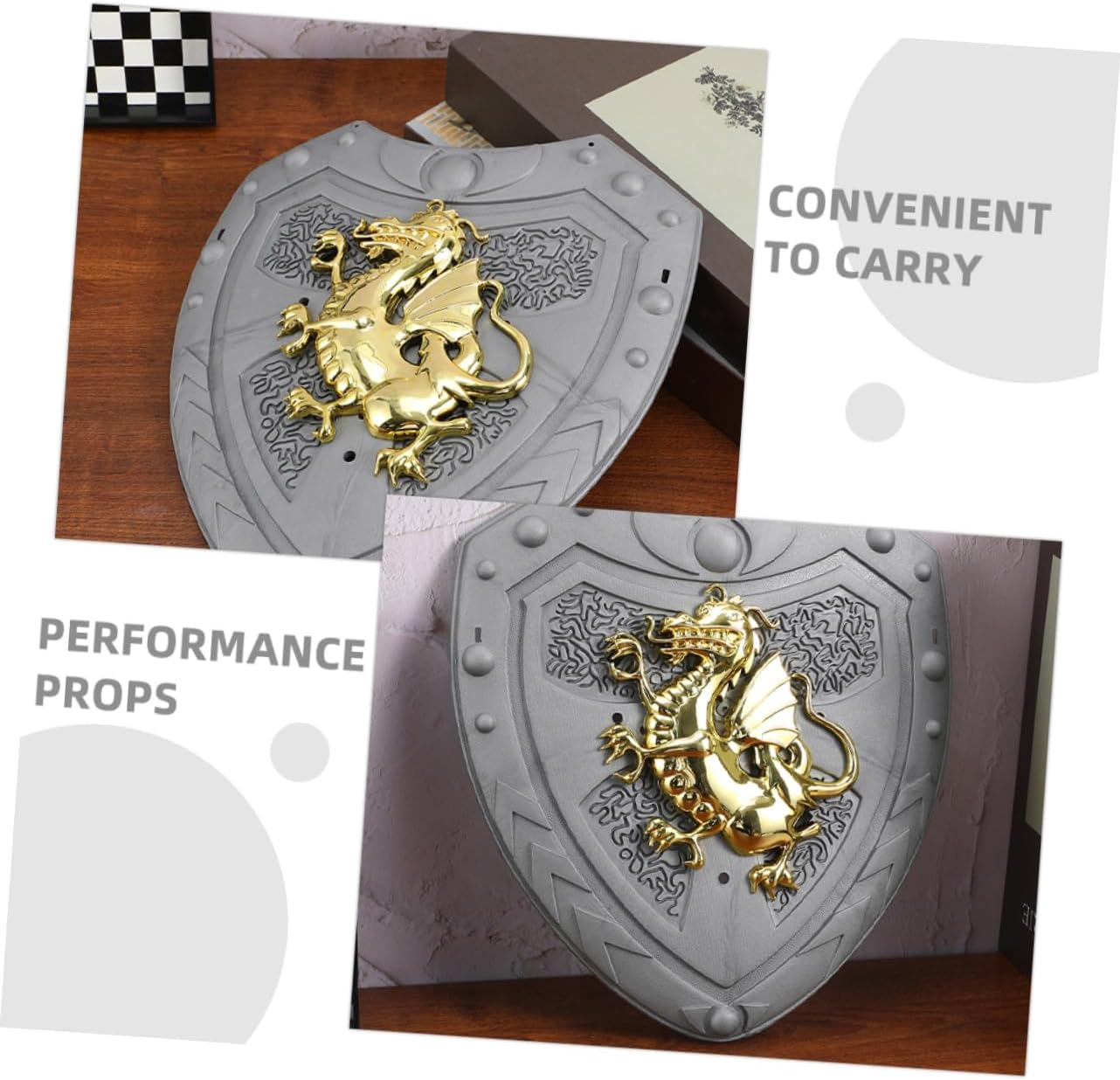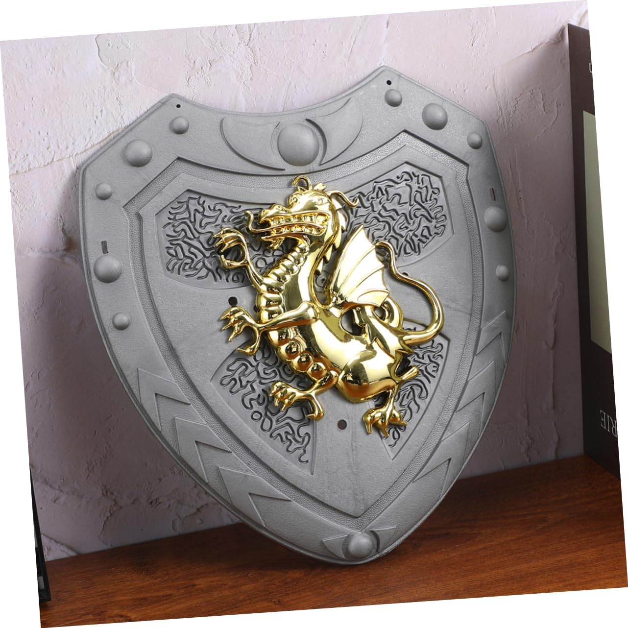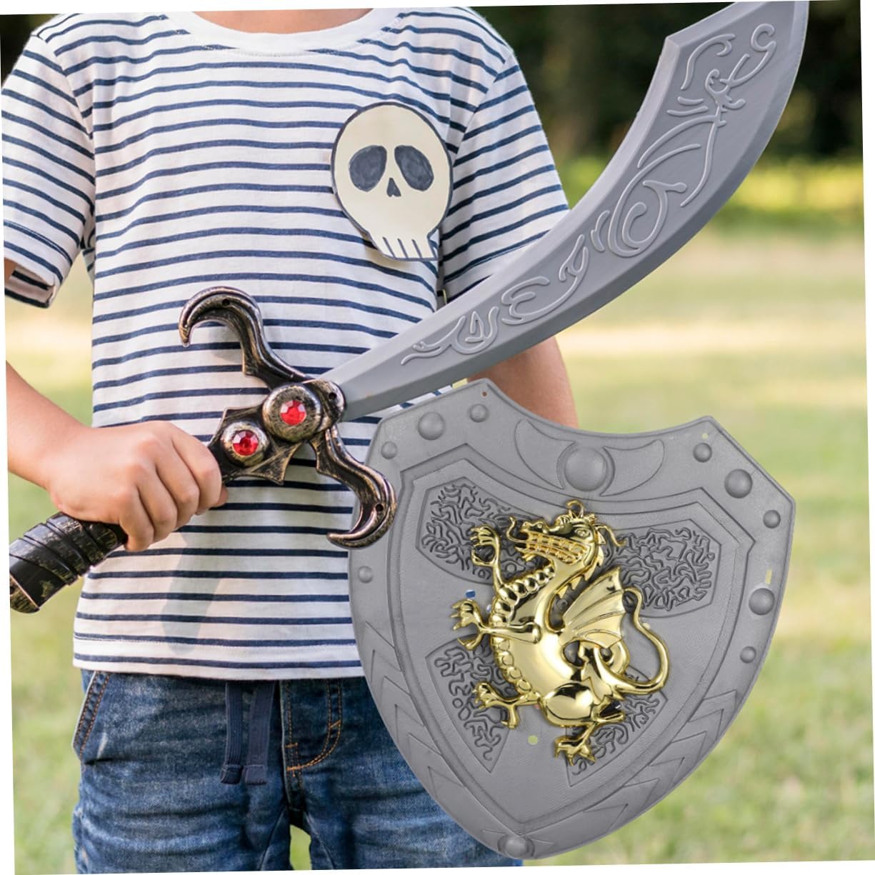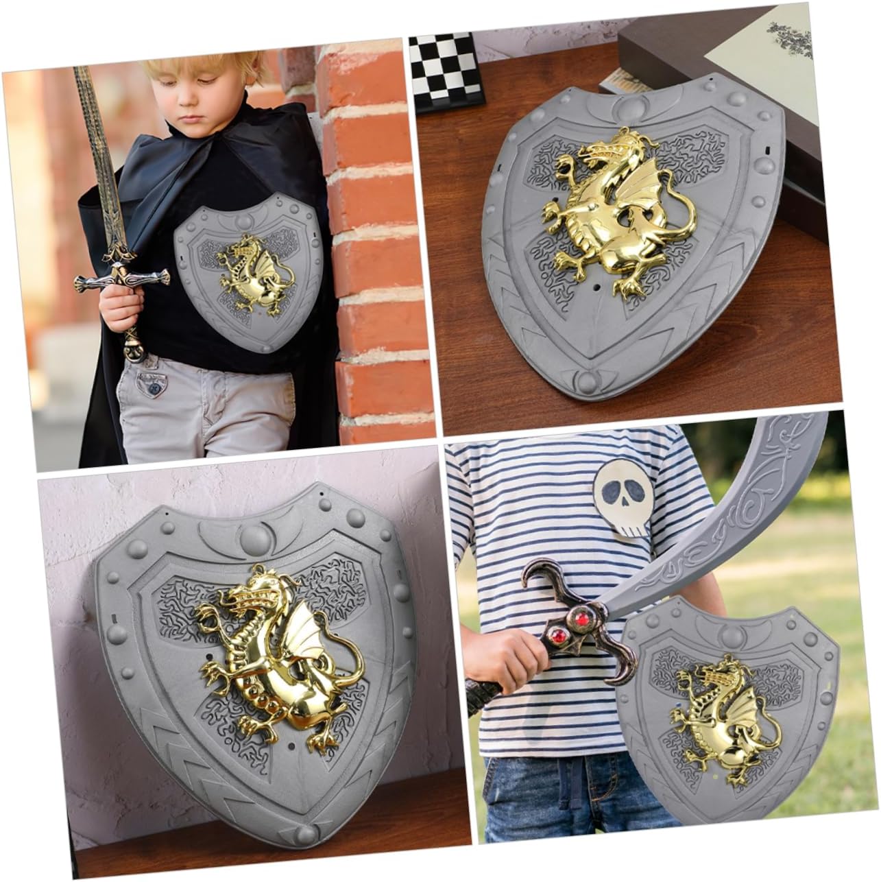 Drago distintivo: il design del drago è distintivo e accattivante, facendo risaltare il tuo bambino mentre gioca o durante eventi in costume Ideale per i giochi di ruolo: questo scudo è ideale per i giochi di ruolo, aggiungendo divertimento ed eccitazione nel fingere di essere un cavaliere o un guerriero Portatile e leggero: facile da trasportare e trasportare, rendendolo un'ottima aggiunta alla collezione di giocattoli di qualsiasi bambino Sicuro per i bambini: questo scudo è progettato appositamente per i bambini, è sicuro e adatto all'uso da parte dei bambini piccoli mentre giocano Incoraggia la creatività: incoraggia gioco fantasioso e consente ai bambini di creare le proprie avventure e sviluppare la propria creatività