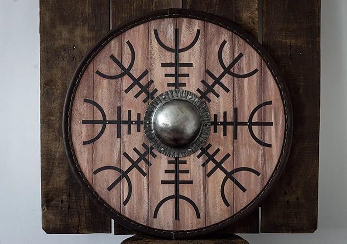 Realizzato con materiali e finiture di altissima qualità. Dimensioni: 61 x 61 cm circa. Peso: 4 kg (circa) Perfetto per decorare casa, ufficio, barca o ristorante Scudo decorativo in legno fatto a mano in stile vichingo medievale Scudo vichingo: rifinito in aspetto invecchiato naturale. Scudo nuovo e mai usato.